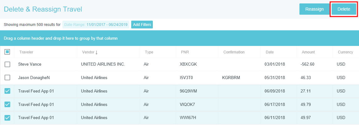 Delete & Reassign Travel Transactions Admin Screen The Delete & Reassign Travel Transactions admin screen allows you to delete unused travel transactions for a single user and to move transactions from one user to another, such as when a user leaves the company before submitting all travel transactions. Click ADMIN SETTINGS > TRANSACTIONS > DELETE & REASSIGN TRAVEL. Delete Travel Transactions Note: As a security precaution, an administrator cannot delete any of his or her own transactions. 1. Use the filters to help you find the desired transaction(s). 2. Select the transaction(s) and click DELETE. You may also drag the column headers into the blue bar in order to group the search results by those column headers. 3. You will be asked to confirm the deletion by entering the word "DELETE" in the box. Then click DELETE. Reassign Travel Transactions Administrators may select users of any status except Disabled in order to view all travel transactions that are active but not used in an expense report. You may select some or all transactions and move them to a new user. Note: Reassigning any travel transactions that are part of a merged set will cause all of the transactions in that set to be reassigned. 1. Use the filters to help you find the desired transaction(s). 2. Select the transaction(s) and click REASSIGN. 3. In the pop-up window, use the search box to find the person to whom you wish to reassign the transaction(s). Then click ASSIGN. Was this article helpful? Yes No