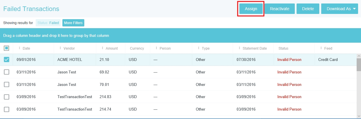 The Failed Transactions admin screen allows you to manage credit card feeds that fail due to incorrect Employee IDs. You may use the screen to assign failed transactions to the correct users and then reactivate them so that the transactions go to the users’ eWallets. You may also delete failed transactions.