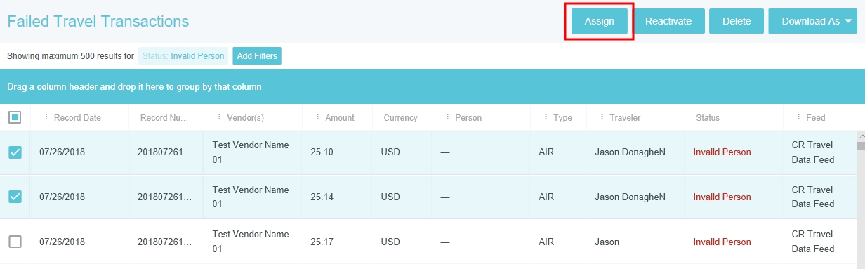 Failed Travel Transactions Admin Screen The Failed Transactions admin screen allows you to view, assign and reactivate any third-party travel transactions that have invalid User IDs. You may use the screen to assign failed travel transactions to the correct users and then reactivate them so that the transactions go to the users’ eWallets. You may also delete failed travel transactions. 1. Click ADMIN SETTINGS > TRANSACTIONS > FAILED TRAVEL TRANSACTIONS. 2. Select the desired transaction(s) and click ASSIGN. 3. Search for and select the correct user. 4. Now click REACTIVATE to send the transaction(s) to that user's eWallet. You may use the DOWNLOAD AS button to export all the results returned by the current view. Was this article helpful? Yes No