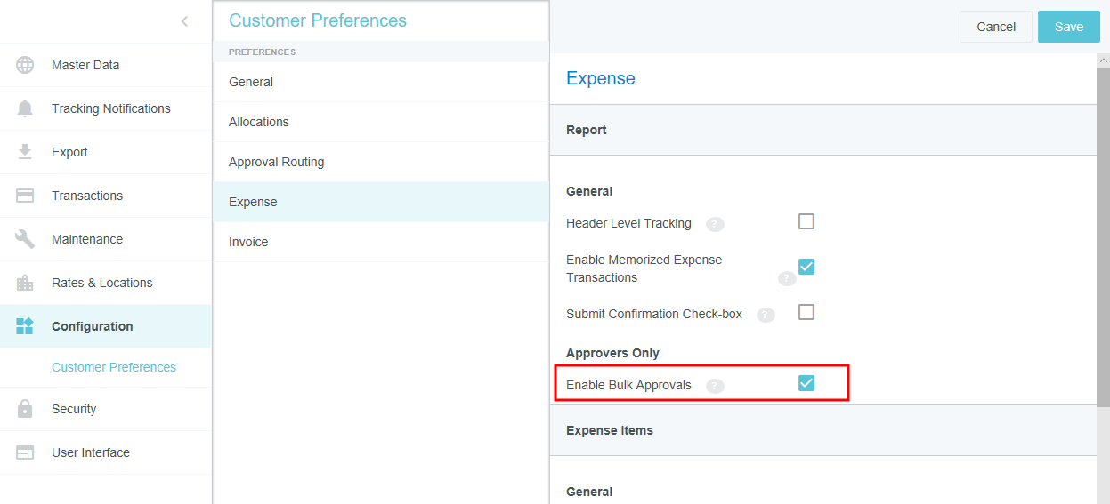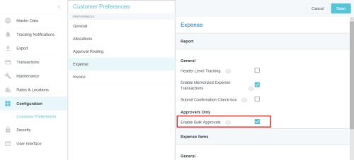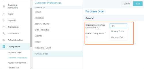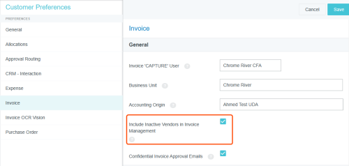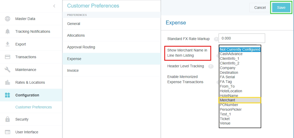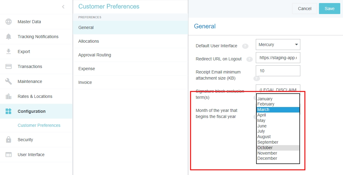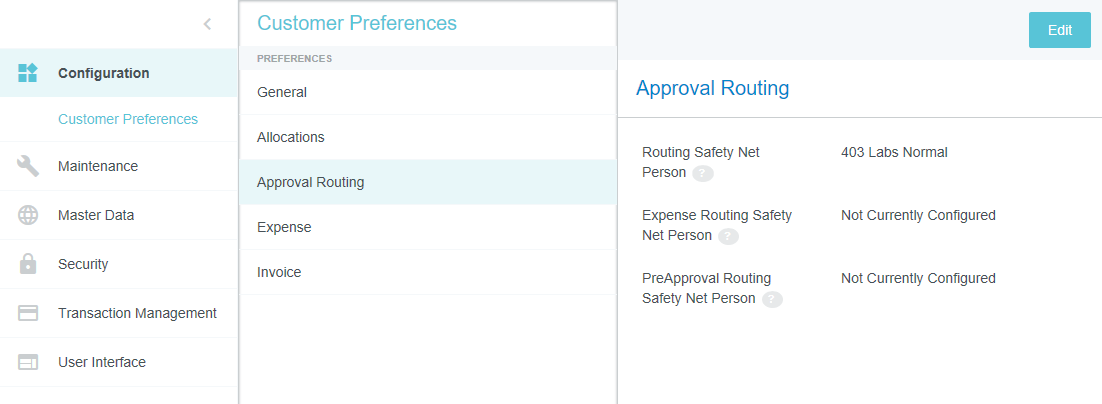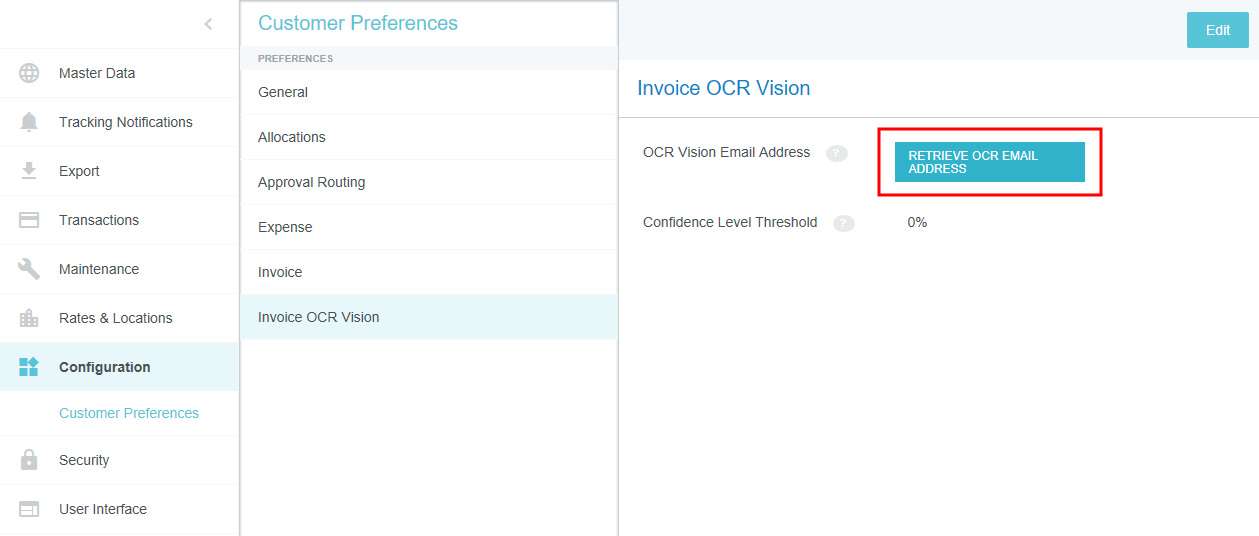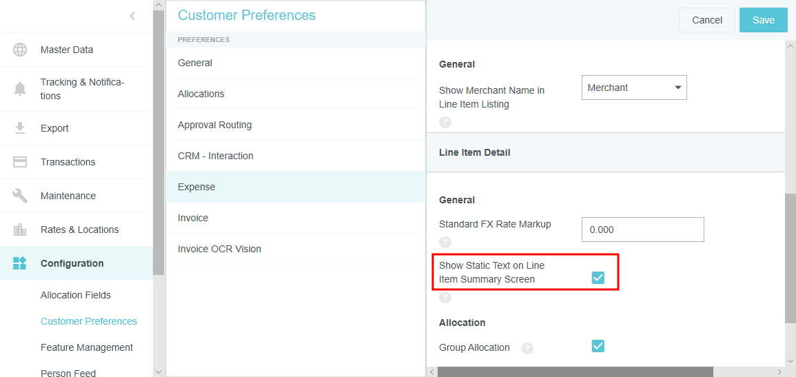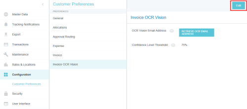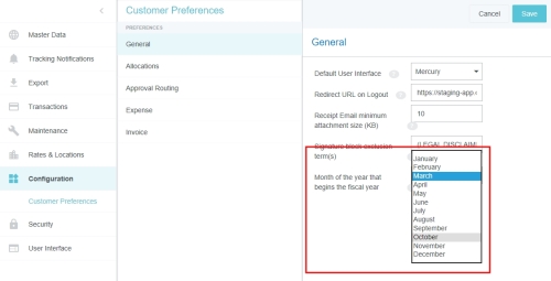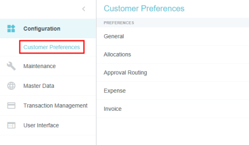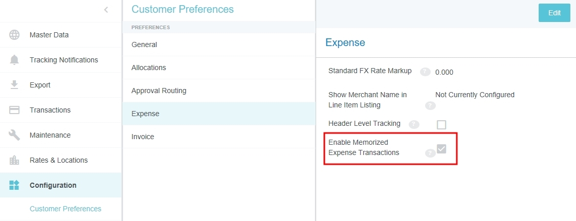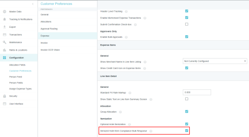 Customer Preferences Admin Screen Administrators may use this screen to edit certain global, customer-specific properties related to such categories as allocations, approval routing, expenses, and invoices. They may also customize such general preferences as the URL to which users are directed upon log-out and the minimum attachment size for emailed receipts. Access Customer Preferences Admin Screen 1. Click the MENU button in the upper left corner, then ADMIN SETTINGS. 2. Click CONFIGURATION > CUSTOMER PREFERENCES. The categories and options visible depend on your organization's configuration of Emburse Enterprise. You may not see all the ones pictured here. Edit Customer Preferences 1. Click on a category to see which options you may edit. Hover over the Question Mark icon to see a description of each option. 2. Click EDIT to make changes. 3. When you have made the desired changes, click SAVE. General Fiscal Year Start Month If your organization's Fiscal Year starts in a month other than January, you may configure it in Customer Preferences in order to take advantage of the Fiscal Year date filters in Emburse Analytics reports. 1. To choose the month in which your organization's Fiscal Year starts, click the General tab, then click EDIT. 2. Use the drop-down menu next to “Month of the year that begins the fiscal year” to select the desired start month. Show Person Attributes Your organization may choose to display a VIEW PROFILE link in the User menu. Clicking this link will open a screen showing users all their Person attributes, including entities, entity types and roles. 1. On the General tab, click EDIT. 2. Click the check box next to "Show Person Attributes." 3. Click SAVE. Approval Routing – Routing Safety Net Person The Approval Routing tab allows admins to choose a default user who will be assigned to an expense report, pre-approval, invoice, or purchase order approval when no other user has been assigned to the role specified in the routing rules. This Routing Safety Net Person is sometimes referred to as the "Find Me/Fix Me" person. Best Practice: Select a user who is not normally an AP Approver so that it will be obvious that the routing rules need attention when that person is assigned an approval. Click EDIT to select the desired user from the drop-down list, then click SAVE. Legacy Emburse Enterprise customers will not be able to edit the Safety Net Person via this screen until they create a Support ticket to have their existing routing rules updated to reference values entered here. Approval Routing – Alternate Email Addresses for Approval Customers may enable alternate approval email addresses for end users, which allows them to easily approve expenses or invoices without having to log into their company email account. This feature can simplify the approval process by allowing approvers to forward approval emails from non-company email accounts like those on their personal mobile devices. 1. On the Approval Routing tab, click EDIT. 2. Click the check box next to "Alternate Email Addresses for Approval." 3. Click SAVE. When this feature has been activated, approvers may add alternate email addresses from which they may approve expenses and/or invoices in their Account Settings. Expense Show Merchant Name in Line-Item Listing Customers who use authorized user rules may opt to have the Merchant Name User-Defined Fields (UDAs) display on the Draft, Submitted, Returned and Approvals Needed dashboards. Administrators for customers who have authorized user rules configured may activate this feature via the Customer Preferences admin screen. 1. On the Expense tab, click EDIT. 2. Select MERCHANT in the drop-down menu next to "Show Merchant Name in Line Item Listing.” 3. Click SAVE. Activate Header-Level Tracking For organizations where expenses all go to the same approver for all steps, Header-Level Tracking allows users to easily track an entire report instead of tracking each individual line item on a report. Administrators may activate the Header-Level Tracking option on the Customer Preferences admin screen. Users will no longer see the tracking steps for every line item. Instead, tracking of the entire expense report will be based on the routing of the first line item on the report. Note: This option should not be activated if your organization is configured for independent routing. 1. On the Expense tab, click EDIT. 2. Click the check box next to "Header Level Tracking." 3. Click SAVE. Enable Memorized Expense Transactions Emburse Enterprise customers may activate a feature that allows users to "memorize" frequently used expense line items in order to easily add them to future reports. For complete details, see Memorize Frequently Used Expenses. Administrators may activate the Memorized Expense Transactions on the Customer Preferences admin screen. 1. On the Expense tab, click EDIT. 2. Click the check box next to "Enable Memorized Expense Transactions." 3. Click SAVE. Activate Submit Confirmation Checkbox Your organization may choose to require users to check a box on the Submit Confirmation screen certifying the validity of their expenses before they may submit expense reports. This adds an extra verification step to the report-submission process. 1. On the Expense tab, click EDIT. 2. Click the check box next to "Submit Confirmation Checkbox." 3. Click SAVE. Enable Expense OCR Your organization may choose to enable Optical Character Recognition (OCR) technology to automatically populate extracted data into expense reports. OCR technology saves your end users time and frustration by automatically populating the following fields if they are visible on the receipt rather than requiring them to enter it manually: Expense Type Transaction Date Amount Currency Code Merchant Last 4 Digits of the Credit Card VAT Information See Understanding Expense OCR for complete details. 1. On the Expense tab, click EDIT. 2. Click the check box next to "Enable OCR Text Extraction fo