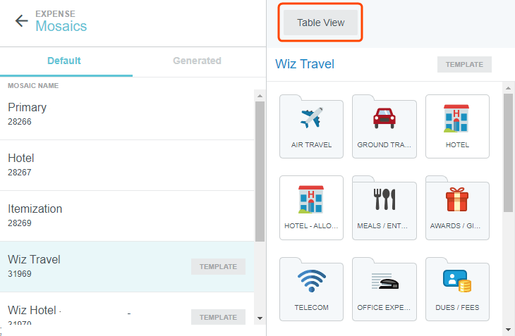 Update Multiple Mosaics Simultaneously Via Mosaic Automation Customers who require large numbers of mosaics are implemented with Mosaic Automation, which allows your organization to have multiple mosaics generated from a single template. For example, you could have a separate travel-related mosaic for every country in which your employees regularly travel for business. When updates are required, an admin simply has to update the template for the changes to be reflected on every country's mosaic, or to use Table View to easily make changes to individual mosaics. If your organization has activated this feature, you will see two tabs at the top of the Mosaics list, accessible from the Mosaics & Tiles admin. Default: Your organization's standard mosaics, along with any being used as templates Generated: Mosaics created from a template during implementation of Mosaic Automation Access Permissions It is important to ensure that the correct access permissions have been set in order to take full advantage of Mosaic Automation. 1. In the Admin menu, navigate to SECURITY > ACCESS PERMISSIONS and select the appropriate policy. 2. In the Mosaics & Tiles section, be sure that all of the following permissions are checked: Show in Admin Menu EXPENSE - Read Mosaics EXPENSE - Edit Mosaics Edit a Mosaic Template Mosaic templates are edited the same way standard mosaics are edited. See "Edit Mosaic" in Mosaics & Tiles Admin Screen for details. Edit Generated Mosaics Table View allows you to easily make individual changes to large numbers of generated mosaics simply by checking or unchecking boxes in the Tile Grid. 1. Select the template associated with the desired generated mosaics and click TABLE VIEW. The Column Headers across the top correspond to entities—e.g., different countries, business units—for which your organization has created mosaics. In this example, the countries are referred to by two-letter codes, but your organization may choose to refer to them by name. The Entity Type box displays the entity type associated with the entities that comprise the Column Headers. In order to change which columns (i.e., entities) appear here, you will need to navigate to the Entity Admin screen and add or remove entities for this entity type. See Edit Columns (Entities) on Generated Mosaics, below, for complete details. The Rows represent the individual expense-type tiles that appear on the template. To change which tiles and folders appear here, you will need to edit the mosaic template. See "Edit Mosaic" in Mosaics & Tiles Admin Screen for details. If you have not yet created or selected a changeset, you will be prompted to the first time you click on the Tile Grid. A changeset is just a way to make changes to the user interface that can be tracked and easily reversed, if necessary. You may select an existing changeset (e.g., one you've already created containing related changes you'd like to make) or create a new one. See Create and Publish Changesets for complete details. 2. To unlock a row for editing, click anywhere along the row. A SELECT ALL button will appear. If necessary, click it to turn it into a DESELECT ALL button. To unlock a column for editing, click the column header. An lock icon appears when you hover over the column header. 3, To add or remove an expense-type tile from the mosaic of an entity, check or uncheck the corresponding box in the Tile Grid. A blue square will appear over each checkbox that has been changed to help you keep track. 4. When you are done, click UPDATE MOSAIC. Edit Columns (Entities) on Generated Mosaics The columns in the Tile Grid correspond to entities—e.g., different countries, business units—for which your organization has created mosaics. Administrators may change which entities appear in the Tile Grid—for example, if your organization creates a new business unit or stops operating in a certain country. The box in the upper left corner displays the entity type that determines which entities appear as columns in the Tile Grid. Simply navigate to the Entities Admin screen and add or remove entities for the entity type displayed in the upper right corner of the grid. For complete details, see "Create a New Entity" or "Edit an Entity" in Entities Admin Screen. Was this article helpful? Yes No