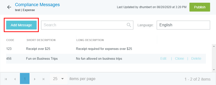 Rule Messages Admin Screen Although the Messages Admin Screen gives access to every message in the user interface, the Rule Messages screen allows you to easily create and edit the long and short messages associated with Emburse Enterprise's business rules without needing the message key or searching through every message for the desired text. This is also where you may add a URL to an existing Compliance rule message. 1. Click ADMIN SETTINGS > USER INTERFACE > RULE MESSAGES. 2. Select or create a changeset. A changeset is just a way to make changes to the user interface that can be tracked and easily reversed, if necessary. You may select an existing changeset (e.g., one you've already created containing related changes you'd like to make) or create a new one. See Create and Publish Changesets for complete details. 3. Select the following: Application: Expense, Pre-Approval, Invoice or PO Rule Type: Compliance, Submit Compliance or Approval Routing Language 4. Click VIEW. Add Rule Messages 1. Click ADD MESSAGE to create a new rule message. 2. On the Create Message screen enter the following: Code: The unique code associated with this rule message. Short Description: This acts like a headline. Long Description: This is a description of the rule. 3. By default, the ADD TO ALL LANGUAGES box is checked. If your organization is configured to display multiple languages, this will create the new message in every language file. You may then replace the short and long descriptions with the appropriate translations. 4. Click SAVE. Clone Rule Messages Cloning allows you to easily create a new rule message from a copy of an existing one. 1. Hover over the message you wish to copy and click CLONE. 2. Enter a unique code for the message you are creating and click CLONE. 3. The cloned message will appear in the list. Hover over it and click EDIT to customize it. Edit Rule Messages 1. Hover over the message you wish to change and click EDIT. 2. Enter the desired changes and click SAVE. Add URLs to Compliance and Submit Compliance Rule Messages You may add URLs to existing Compliance and Submit Compliance rule messages via the Rule Messages admin. For information on adding URLs to new Compliance and Submit Compliance rules as they are being created, see Business Rules Admin Screen. 1. Hover over the rule message you wish to change and click EDIT. 2. In the Optional section, enter the URL (excluding the "https://" portion) and the label for the button that will hyperlink users to the URL. 3. Click SAVE. Delete Rule Messages 1. Hover over the message you wish to remove and click DELETE. 2. On the Delete Message confirmation screen, click DELETE. Was this article helpful? Yes No
