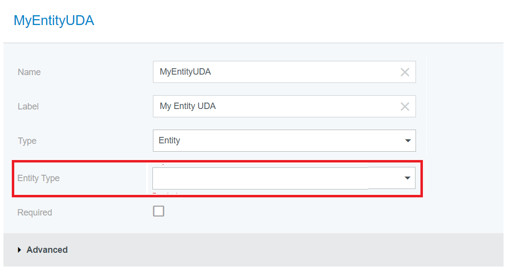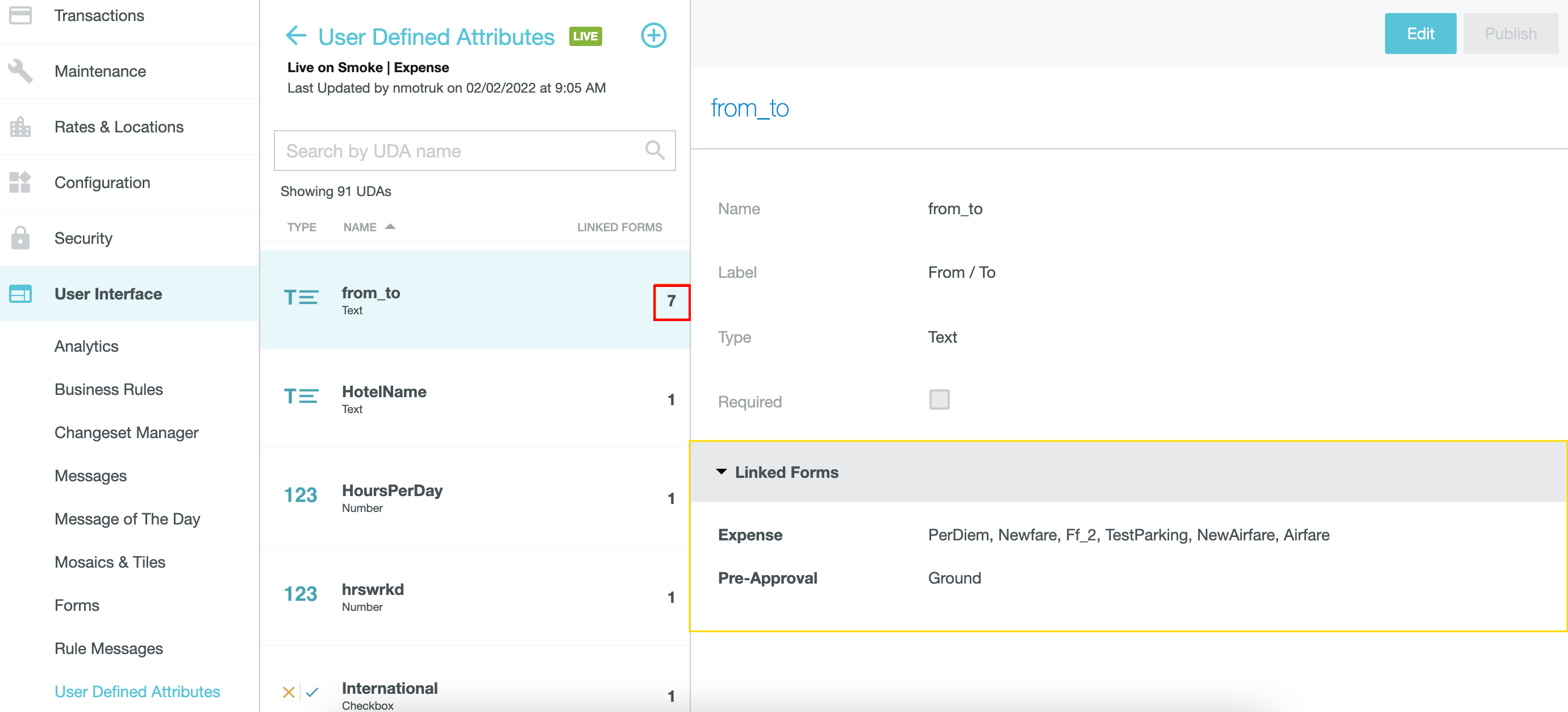 User Defined Attributes (UDA) Admin Screen The User Defined Attributes (UDA) admin screen allows you to easily create and update custom fields, or data attributes, that you can put on forms to collect information required for your organization. It is highly recommended that you create and test changes in the QA/UAT environment and then use Cross-Environment Publishing to promote the changes to Production. See "Cross Publish Changesets Between Environments" in Create and Publish Changesets for complete details. View UDAs 1. Click ADMIN SETTINGS > USER INTERFACE > USER DEFINED ATTRIBUTES. 2. Select the changeset you would like to use. If a changeset does not exist, you may select Live on Prod (or QA/UAT) and click VIEW. A changeset is just a way to make changes to the user interface that can be tracked and easily reversed, if necessary. You may select an existing changeset (e.g., one you've already created containing related changes you'd like to make) or create a new one. See Create and Publish Changesets for complete details. 3. You will see a list of all the UDAs defined for your organization. The number on the right indicates the total count of expense and pre-approval forms linked to that UDA. Click on a UDA to view its details. Click LINKED FORMS to view all the expense and pre-approval forms that use this UDA and will be affected by any changes made to it. Create a New UDA 1. Click the blue plus button at the top of the User Defined Attributes list. 2. If you are not in a changeset, you will be prompted to select a changeset or to create a new one. 3. Enter the details of the new UDA. Name: The unique system name for the UDA. The name must begin with a letter and contain only alphanumeric characters or underscores. Spaces are not allowed. Label: The display name users will see in the interface. The label should be a word or phrase that will help users understand the information they are being asked to provide. Type: Use the drop-down list to select the type of UDA you wish to create: Check Box: Displays a check box and stores the value as 1 (checked) or 0 (unchecked). Format: Specify whether the label will be displayed before or after the check box. The best practice is to position the label before the check box. Currency: Displays an amount field with the same format as the Amount Spent currency. Input must be numeric. Date: Displays a field where a date can be entered manually or selected from a calendar. Entity: Displays a drop-down or searchable list, based on the associated Entity Type, and stores the Entity Code of the selected Entity. See "Entity UDA Properties," belowfor more details. Number: Displays a numeric field. Input must be numeric. Precision: Specify the number of decimal places for the UDA, from 0–5. Text: Displays a text field. Input can be alphanumeric or special characters. Required: Check this box to make the UDA a required field on every form in which it appears. For more flexibility, leave the Required checkbox unchecked and use the Forms Admin Screen screen to select whether the UDA is required or optional on each form. Validation Message: If you check REQUIRED, you will be prompted to provide an optional validation message. It will be displayed in red underneath the UDA when the user attempts to save the form without entering a value into the UDA. Entity UDA Properties Entity UDAs are drop-down or searchable-list type fields. When you create an entity UDA, you will be asked to link it to a specific entity type that contains the list of values from which users may select. To learn how to create an entity type and define its values, see Entities Admin Screen. Entity UDAs have a number of additional properties, which are described below. It is recommended that you speak with your organization’s Emburse Enterprise Implementation Consultant before configuring the more advanced properties of entity UDAs. Entity Type The entity type identifies the list of values available for selection. Non-searchable: A drop-down list of values will be displayed when users click on the field, and they will only be allowed to select from that list. Searchable: As users type in the field, its drop-down list changes to display the subset of values matching the search string entered. Searchable entity UDAs are typically used when the list of values is quite large. Searchable List Properties Display ExtraData 1: Adds the entity’s Extra Data 1 value in front of the Entity Name (or Extra Data 2) when displayed in the drop-down list Display ExtraData 2: Adds the entity’s Extra Data 2 value in front of the Entity Name when displayed in the drop-down list Enable Elastic Search: This advanced setting that you may wish to discuss with your Implementation Consultant provides an enhanced search capability and may improve performance for very large lists. Filter By: The entities within an Entity UDA may be filtered in a number of different ways so that only entities matching certain criteria will be displayed. These are all considered advanced features and would typically be set up by your Implementation team. Search Value: The list is filtered based on a certain value existing within the Entity Code, Extra Data 1 or Extra Data 2. Active User Attribute: The list is filtered based on whether the Entity Code, Extra Data 1 or Extra Data 2 matches a particular attribute of the ExpenseOwner (e.g., Country Code, Title, UDF fields). Role and Entity: The list is filtered based on whether the Entity Code, Extra Data 1 or Extra Data 2 matches a particular relationship attribute of the expense owner (e.g., Part Of Office) Non-Searchable List Properties Filter By: Relationship Attribute Entity Type: As with the Role and Entity Filter, the list is filtered based on the expense owner’s relationship attributes. However, this filter looks for matches on relationship attributes using the entity type linked to this UDA's entity type, regardless of the role. You may choose a specific role as the default