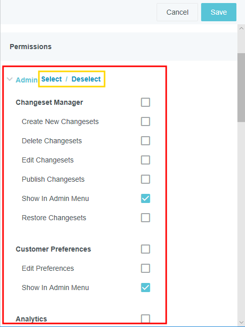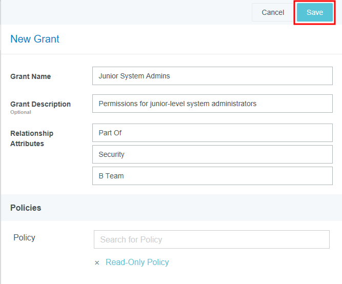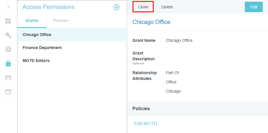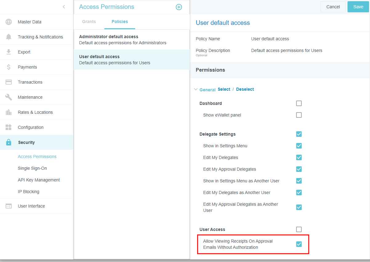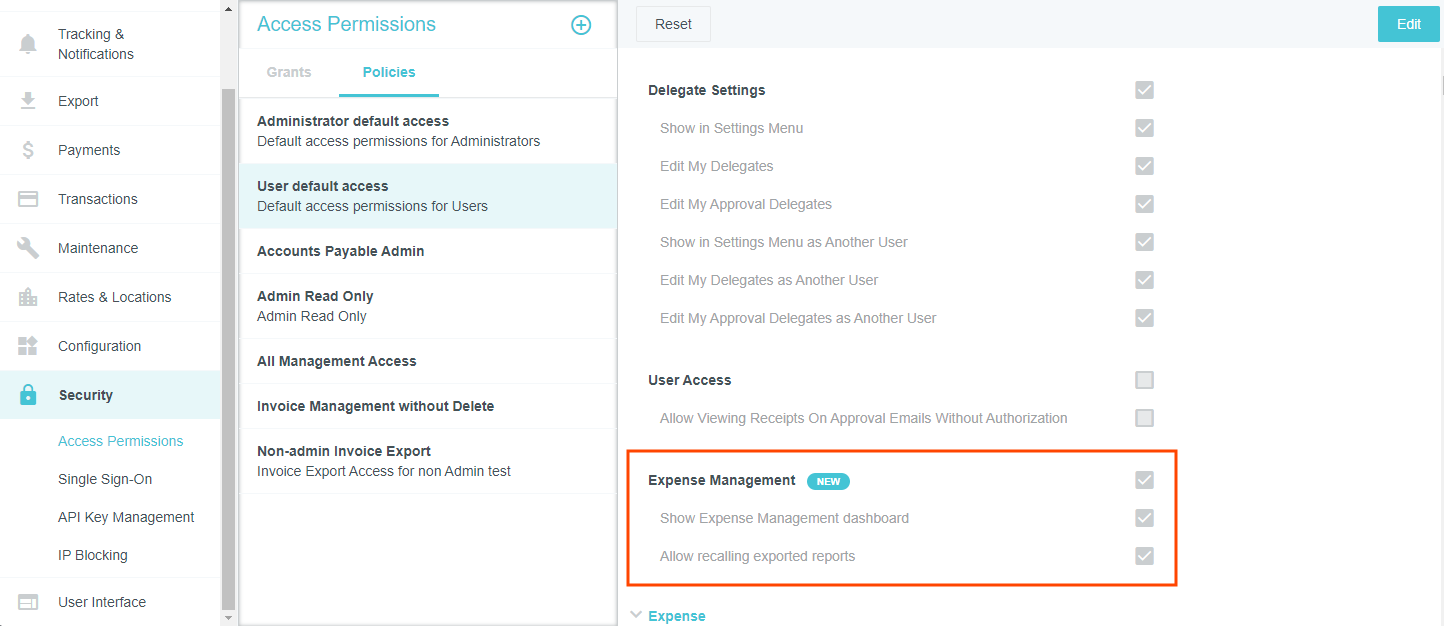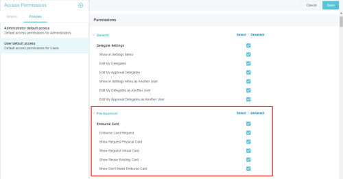 Access Permissions Admin Screen This screen gives security administrators the ability to control which admin screens may be accessed by other administrators and to control their level of access. It also allows administrators to select which buttons and functions appear for users in the Emburse Enterprise, including Expense Management, Delegate, Emburse Card, Invoice Management, and Purchase Order Management settings. By default, this screen is turned off for all but one or two Super Admin users. If those users leave the organization and no one is designated to replace them as a Super Admin, the Access Permissions admin screen may not be visible to anyone in your organization. Contact the Emburse Enterprise Configuration Team by opening a Support ticket to have one or more Super Admins designated. For complete details on Super Admins, see Customize Access Permissions for Admin Teams. View Access Permissions Click the MENU button in the upper left corner, then ADMIN SETTINGS. Click SECURITY > ACCESS PERMISSIONS. If you do not see Access Permissions in the Security menu, please review Access Permissions Best Practices, below, and then open a Support ticket with a list of the Emburse Enterprise users who should have access to create policies and grants. You will see a summary of recent enhancements to the Access Permissions screen on the right. Access is controlled at three levels: Permissions are individual actions that may be taken on each admin screen, such as View, Edit or Delete. Policies are groups of permissions—for example, you could have a Read-Only policy that disables some or all actions and an Edit policy that allows users to access some or all actions. Grants allow you to assign each policy to groups of users to determine which permissions they have—for example, all C-Level employees could be granted access to just the Read-Only policy. The same user may have multiple grants as long as he or she has multiple roles. 1. Create a Policy Creating new policies is a multi-step process with several essential prerequisites and is only recommended in certain situations. Before you begin creating any new policies, review the information in Customize Access Permissions for Admin Teams. If your organization has decided to proceed with implementation of a new policy, the process requires four steps: Create a new policy containing the desired permissions. Add a corresponding entity to your organization's Rules Group Exception (RGE) entity type. Assign that entity to specific users via the RGE. Create a grant that activates the policy for those users. For complete details and best practices for customizing access permissions, see Customize Access Permissions for Admin Teams. 1. To create a new policy, click the POLICIES tab, then click the PLUS button. 2. Give the policy a name and, if desired, a description. 3. Scroll through the list of permissions and check the ones you wish to enable for that policy. Uncheck the ones you wish to disable. Use the SELECT and DESELECT buttons to select all or deselect all permissions. 4. When you are finished, click SAVE. The new policy will appear in the Policies list. 2. Add a Policy Entity to the Rules Group Exception (RGE) Entity Type In order to assign any policy you create to specific users via a grant, you must first add an entity that corresponds with that policy to the Rules Group Exception (RGE) entity type via the Entities Admin Screen. Navigate to MASTER DATA > ENTITIES, select the Rules Group Exception entity type, scroll down to the Entities section, and click PLUS. If the Rules Group Exception entity type no longer exists for your organization, your Emburse Enterprise Implementation Team contact will be able to help you re-create it. Give the new entity a name and code and click SAVE. For complete details on creating new entities, see "Create a New Entity" in Entities Admin Screen. 3. Assign the Policy Entity to the Appropriate Users Next, you'll need to assign the policy entity you created in Step 2 to the users who should have access to that policy. Navigate to MASTER DATA > PEOPLE and select the first user. Click RELATIONSHIP ATTRIBUTES and then click ADD RELATIONSHIP ATTRIBUTE. Select the following for the new relationship attribute: Role: Part Of Entity Type: Rules Group Exception Entity: [Name of Policy] Click SAVE. Repeat these steps for any other users who should be assigned this policy. In addition to giving them the Full Admin relationship attribute, be sure each user has the Admin check box selected under Permissions. 4. Create a Grant Grants allow you to activate policies for groups of users to determine which permissions they have. Each grant must be assigned to a unique entity, but the same user may have multiple grants as long they have multiple roles. Create a New Grant 1. To create a new grant, click the GRANTS tab, then click the PLUS button. 2. Give the grant a name and, if desired, a description. 3. Use the Relationship Attributes drop-down boxes to select the policy entity to which you wish to assign this grant. Anyone who has been assigned this entity in their Person record will be granted the permissions allowed by the policies associated with this grant. 4. Select the desired policy from the Policy drop-down box. You may grant the selected role multiple policies, if needed. 5. Click SAVE. Clone an Existing Grant You may copy an existing grant and edit it to create a new grant by clicking the CLONE button in the upper left corner of the desired grant. Once you select a different relationship attribute for the new grant, it may be saved as a separate grant. Edit a Policy 1. Select the desired policy in the list and click EDIT. 2. Find the desired group of settings in the list and use the check boxes to select which specific buttons and functions should be available to users and/or admins in the user interface. You may select or deselect all the options by checking the box next to the section heading. 3. When finished, 