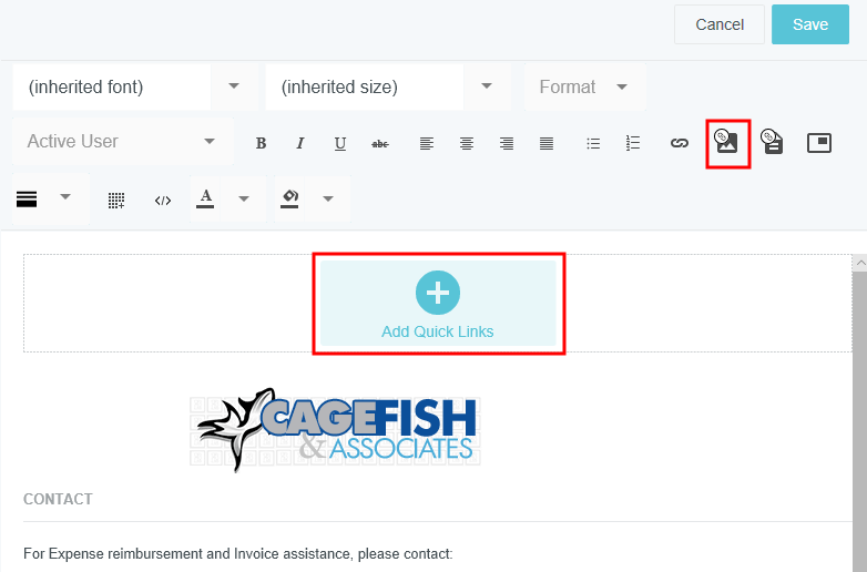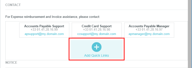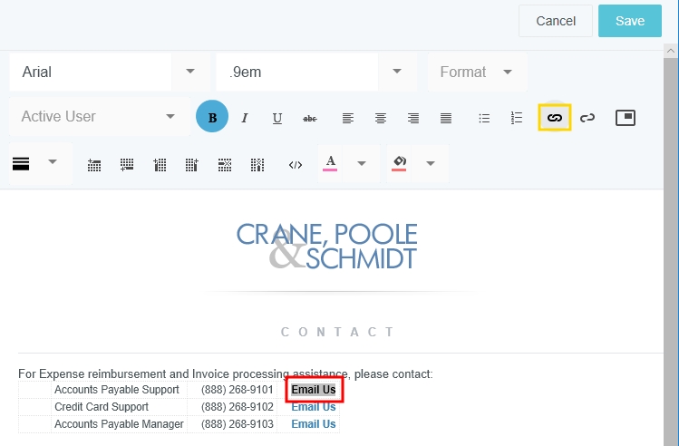 Customize Your Company's Message of the Day Your organization may use the Message of the Day Admin Screen to change the information that appears when users log in to Emburse Enterprise. Below are detailed instructions on customizing the appearance of that information. Before You Start Only the file called "MOTD" will be displayed to users, so any changes you wish to implement must be made in that file. However, the best practice is to use the Create and Clone features to copy and create new Message of the Day files for testing out new formatting without altering the existing MOTD. See Message of the Day Admin Screen for complete details. You may edit the components of the MOTD following the instructions in the rest of this article. Or click this link to download an HTML template you may use as a starting point for your customization: Message of the Day HTML Template. The template looks like this: Logo If you need to change your company's logo, contact us via Support. Formatting Text Use the drop-down menus across the top of the editor to change the typeface and font size. You may also use the FORMAT drop-down to automatically apply pre-selected formatting via the Paragraph, Heading 1, Heading 2 and Heading 3 styles. The next row of buttons allows you to apply the following attributes to the selected text: Bold Italics Underline Strikethrough Align left, center, right and justified Unordered list Ordered list Insert a hyperlink Insert your company’s logo The bottom row of buttons allows you to apply the following attributes to the selected text: Insert a horizontal line or a gray separator Insert a table View the HTML code Choose the color of the selected text Choose the background color behind the selected text Create and Update Links 1. Highlight the text that you would like to turn into a link, or the link that you would like to update, and click the LINK button. 2. In the pop-up window, enter the following: The email address or web address that you would like to link to Edit the text that will be displayed, if desired Add a tooltip that will appear when users hover over the link Email Address Web Address Quick Links Quick links are predesigned text- or icon-based elements that users can click for easy access to important information. Quick link containers are responsive, meaning that the contents shift depending on the size of the browser window. This prevents certain elements from being cut off for users with narrow-screen devices. There are two types of quick links you may create: Navigation: Create a button users can click to navigate elsewhere, such as to a Help Guide or a download. You may customize the icon, title, description, label for the URL (e.g., "Click Here"), and URL. Users may click anywhere in the text to open the URL. Contact: Create clickable contact information: name, phone number, and/or email address. When users click the icon or email address, their email client will automatically open. If they click the phone number, they will have the option to dial the number. Once you choose either Navigation or Contact for the first quick link in a container, all additional quick links in that container must be the same type. To add the other type of quick link, you will need to create a new quick link container. 1. To add a new quick link container, click the Quick Link icon in the formatting menu bar. This creates a new section where you can add either type of quick link. 2. To add a new quick link to an existing quick link container, click ADD QUICK LINKS from inside the container. Note: If there are already quick links in the container, you will only be able to add the same type of quick link already in the container. To add the other type of quick link, you will need to create a new quick link container. 3. Choose the desired orientation of the quick link. Horizontal: This places the icon to the left of the text. All text will be left-justified. Vertical: This centers the icon above the text. All text will be centered. Once you choose either Horizontal or Vertical for the first quick link in a container, all additional quick links in that container must be the same layout. To add a quick link with the other layout, you will need to create a new quick link container. Personalize Via "Active User" The ACTIVE USER drop-down menu allows you to insert fields that automatically display customized text unique to each user viewing the Message of the Day. For example, you may wish to have each user see a personalized greeting on the Message of the Day screen and to show their Default Currency Code for expenses. Simply place your cursor where you want that type of custom text to be entered and select it from the drop-down list. Click SAVE to see how the Message of the Day will appear to users. Advanced HTML Editing Advanced users may customize the appearance of the Message of the Day via HTML by clicking this button in the editor: Note that only the following HTML tags may be used: Message of the Day HTML Template.txt20 KB Was this article helpful? Yes No