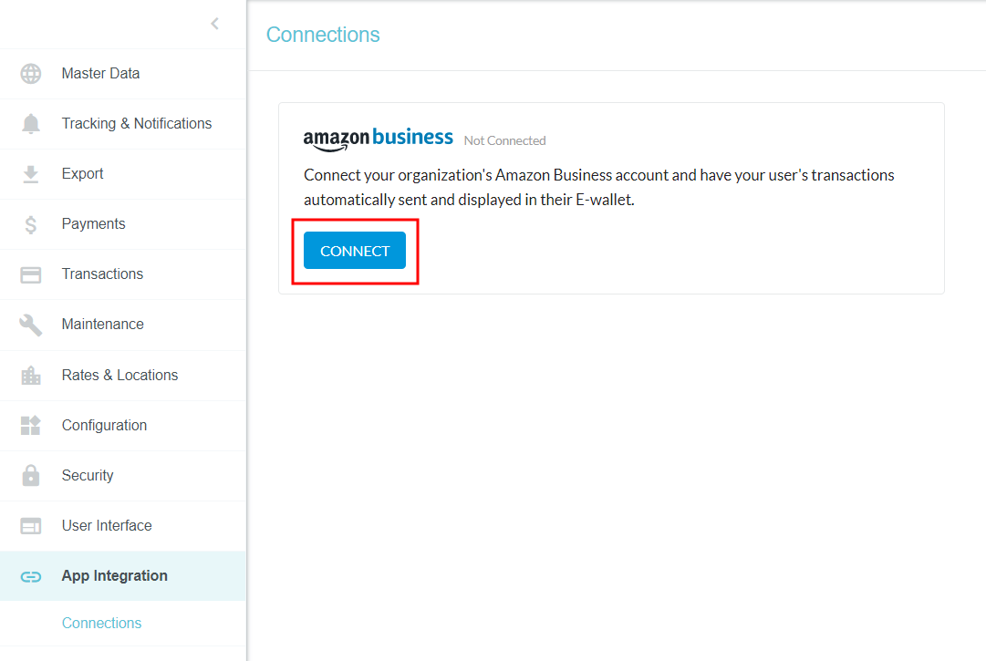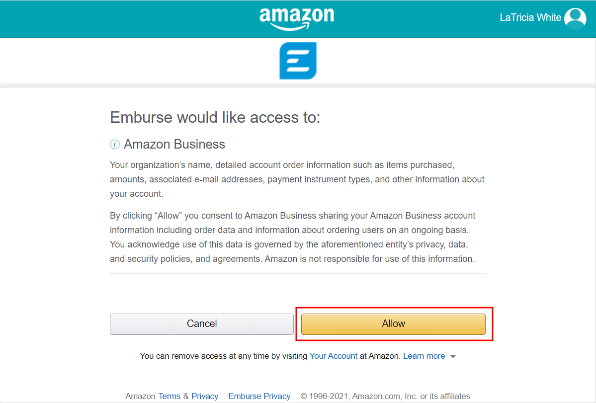 Auto-Import Amazon Purchases with Amazon Business Connector Emburse Enterprise's Amazon Business connector automatically imports Amazon Business purchases into Emburse Expense Enterprise. If your organization takes advantage of this integration, a receipt will be automatically generated and attached to each Amazon business transaction in Emburse Enterprise, making it simple for users to add them to expense reports. See Add Amazon Business Transactions to an Expense Report for more details. Connect an Amazon Business Account Note that you must be an Amazon Business account administrator to connect Amazon Business to Emburse Enterprise. 1. Click ADMIN SETTINGS > APP INTEGRATON > CONNECTIONS. 2. Click the blue CONNECT button in the Amazon for Business box. 3. Use your Amazon Business account administrator credentials to sign in to Amazon. 4. You will be asked to allow Emburse Enterprise parent company Emburse to access your Amazon Business account. Click ALLOW. 5. You will be directed back to the Emburse Enterprise App. If the connection was successful, you will see "Connected" next to the Amazon Business logo on the Connections admin screen. Disconnect an Amazon Business Account 1. Click ADMIN SETTINGS > APP INTEGRATON > CONNECTIONS. 2. Click the red DISCONNECT button in the Amazon for Business box. 3. The pop-up window will display instructions for completing the disconnection inside Amazon Business. Click COMPLETE DISCONNECT. 4. On Amazon's home page, under your name, click the drop-down menu and select YOUR ACCOUNT. 5. Scroll down and click LOGIN WITH AMAZON under Other Programs. 6. Locate Emburse under Your Active Apps & Websites and click REMOVE. 7. Emburse will no longer be displayed on the Manage Login with Amazon screen. Was this article helpful? Yes No