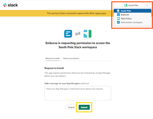 3. If necessary, select the correct Slack workspace for your organization in the upper right corner. Then click SUBMIT.