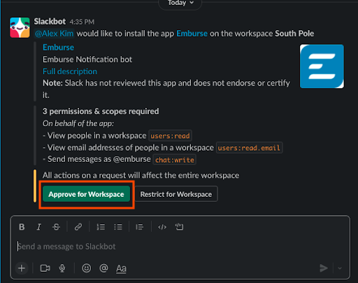 6. If you are not your organization's Slack administrator, you will receive a message via Slackbot when installation is approved.