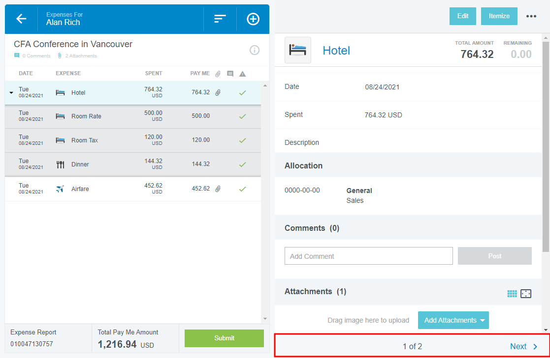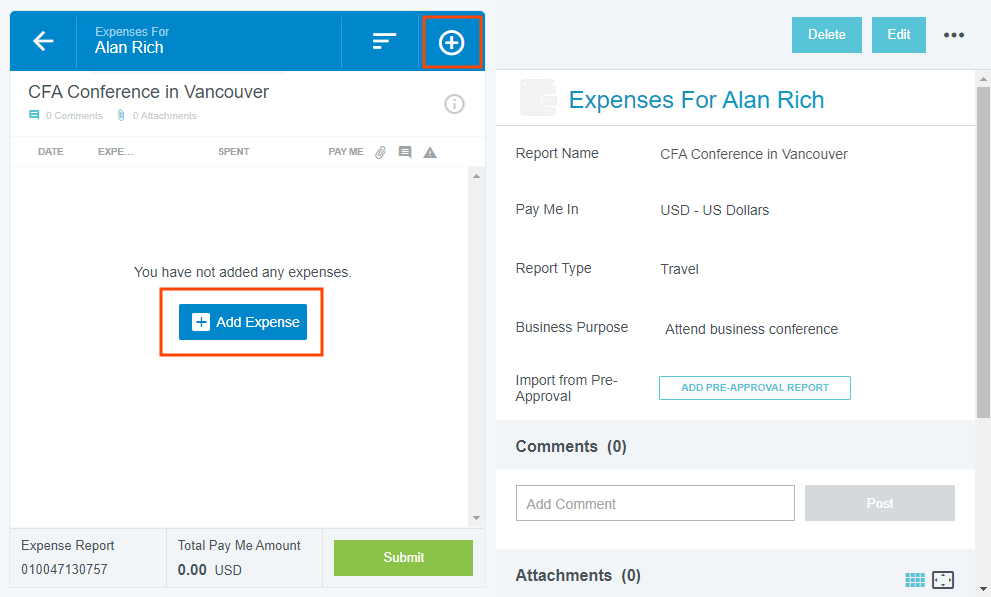 Créer un rapport de dépenses Les rapports de dépenses vous permettent de regrouper et d’organiser les dépenses, d’ajouter des détails et de les soumettre pour approbation. Un nouveau rapport de dépenses peut être créé pour chaque événement ou des événements peuvent être combinés en un seul rapport. En plus du processus ci-dessous, vous pouvez créer un nouveau rapport directement à partir de la Galerie de reçus ou votre société peut utiliser la création automatique de dépenses. Créer un nouveau rapport de dépenses 1. Dans le tableau de bord d’un navigateur Web, cliquez sur + CRÉER dans le volet Dépenses. Dans le tableau de bord d’un navigateur mobile, cliquez sur+ dans le volet Dépenses. Vous pouvez également cliquer sur le bouton + dans les tableaux de bord Ébauches, Renvoyés ou Récemment envoyés. L’écran d’entrée des dépenses s’affiche. La section de l’en-tête des dépenses contient tous les renseignements de base s’appliquant à chacune des dépenses figurant dans le rapport. Le nombre de champs affichés dépend de la configuration de votre organisation. Nom du rapport : Nom attribué par la personne qui a créé les dépenses et qui est utilisé pour assurer les opérations de suivi et de recherche qui contribuent à identifier les dépenses. Si aucun nom n’est entré, le nom par défaut sera « Dépenses le [Date] [Heure] ». Payez-moi en : si cette option est disponible, sélectionnez, dans la liste déroulante, la devise à utiliser pour rembourser le réclamant. Dates de début et de fin Date de début et de fin : votre organisation peut exiger que vous entriez les dates de votre voyage. Type de rapport : votre organisation peut exiger la sélection d’un type de rapport, par exemple, pour déplacement ou pour autre que déplacement. Activité commerciale : Il est possible que vous ayez à expliquer la raison motivant ce rapport. Si vous entrez plus tard votre objectif d’affaires pour un poste du rapport, jusqu’à cinq d’entre eux apparaîtront à l’écran d’aperçu du rapport. Une fois que vous avez rempli les champs requis, cliquez sur ENREGISTRER. Ajouter des dépenses Si l’écran Ajouter dépense n’est pas déjà affiché, cliquez sur le bouton + ou le bouton + AJOUTER DÉPENSE dans la liste des lignes de poste pour ajouter votre première dépense au rapport. L’écran Ajouter des dépenses s’affichera à droite. Il offre plusieurs types de dépenses et vous permet également d’accéder aux postes supprimés de la Corbeille et aux dépenses envoyées par e-mail dans votre Galerie de reçus. Il y a une limite de 100 postes par rapport. Un décompte apparaîtra dans l’en-tête du rapport de dépenses lorsque vous atteindrez 80 postes, soit 20 de moins que la limite. Une fois la limite atteinte, un message d’erreur vous demandera de créer un nouveau rapport de dépenses pour tout poste supplémentaire. Ajouter des dépenses à partir du portefeuille électronique ou de la galerie de reçus Un point vert affiché devant une catégorie de dépenses dans le portefeuille électronique ou dans la Galerie de reçus indique que certains postes sont inutilisés ou que des reçus sont disponibles. Pour ajouter une dépense du portefeuille électronique ou de la galerie de reçus à votre rapport, cliquez sur la section appropriée, cochez la case en regard de la dépense que vous souhaitez ajouter, puis cliquez sur AJOUTER. Dépenses payées par carte de crédit Si une carte bancaire professionnelle est associée à votre compte Emburse Enterprise, vous pouvez ajouter des frais de carte bancaire enregistrés à votre rapport à partir de la section Carte bancaire du Portefeuille électronique. Consultez la section Postes de cartes de crédit pour en savoir plus sur l’ajout de dépenses payées par carte de crédit. Attendez que la transaction par carte bancaire apparaisse dans votre portefeuille électronique Emburse Enterprise avant de créer une dépense de carte bancaire. Si vous soumettez une dépense uniquement avec le reçu avant que la transaction n’apparaisse dans Emburse Enterprise, vous demandez plutôt un remboursement en espèces. Dépenses mémorisées Si votre entreprise a activé cette fonctionnalité, vous pouvez facilement ajouter des postes fréquemment utilisés qu’Emburse Enterprise a « mémorisés » pour vous dans la section Hors ligne du portefeuille électronique. Consultez Dépenses mémorisées pour obtenir des renseignements détaillés. CRÉER DE NOUVELLES DÉPENSES Contrairement aux dépenses que vous ajoutez à partir de votre portefeuille électronique ou de votre galerie de reçus, les dépenses directes sont celles que vous saisissez manuellement dans votre rapport à l’aide de l’interface. Les vignettes représentent des catégories de dépense ; les catégories affichant une petite flèche vers le bas disposent de sous-catégories. Cliquez sur CRÉER NOUVEAU pour afficher les vignettes des types de dépenses. Cliquez sur les vignettes avec une petite flèche vers le bas pour afficher leurs sous-catégories. Cliquez à nouveau dessus pour masquer les sous-catégories. Vous pouvez également utiliser la barre de recherche du haut pour rechercher les types de dépenses par leur nom exact (c.-à-d. une recherche « Vols » ne donnera aucun résultat si votre organisation appelle ce type de dépenses « Billets d’avion »). Pour ajouter une dépense à votre rapport, cliquez sur la vignette de catégorie ou de sous-catégorie correspondant au type de dépense souhaité. Si vous devez modifier le type de dépense ultérieurement, cliquez simplement sur la vignette du type de dépense et sélectionnez le nouveau type de dépense. Les trois types principaux de dépenses directes sont décrits ci-dessous. Pour plus d’informations sur les types de dépenses supplémentaires, voir Types de dépenses spéciales. Entrée de dépenses courantes : Il s’agit du format de 