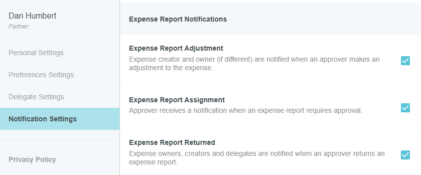Activer les notifications par courriel des dépenses Les utilisateurs d'Emburse Enterprise peuvent activer les notifications par courriel d'Emburse Enterprise spécifiques à l'entreprise. Les préférences en matière de notifications par courriel peuvent être définies dans le menu utilisateur à l’aide de PARAMÈTRES. Cliquez sur PARAMÈTRES DES NOTIFICATIONS et cochez les cases bleues à côté des notifications que vous souhaitez recevoir. Notifications par e-mail des dépenses Nom Objet Description Destinataires Notification de reçu « Accusé de réception Emburse Enterprise » Le propriétaire de la dépense reçoit une notification de réussite ou d’échec pour les reçus. Personne à rembourser Envoyer les reçus remplacés par e-mail « Images de reçus Emburse Enterprise remplacées » La personne à rembourser, le créateur et l’administrateur (facultatif) sont informés lorsque des reçus envoyés par e-mail remplacent des reçus existants dans le rapport. Personne à rembourser, créateur et administrateur (facultatif) Notification relative à l’exportation des dépenses « Exportation dans Emburse Enterprise Expense » L’administrateur qui a lancé l’exportation ou qui a activé l’exportation automatique reçoit une confirmation par e-mail. Administrateur Expense Report Adjustment « Éléments ajustés dans Emburse Enterprise Expense » Le créateur de la dépense et la personne à rembourser (s’ils diffèrent) sont informés lorsqu’un approbateur effectue un ajustement de la dépense. Personne à rembourser et créateur Attribution du rapport de dépenses « Approbation dans Emburse Enterprise Expense [Nom de la personne à rembourser] » L’approbateur reçoit une notification lorsqu’un rapport est soumis pour approbation ou acheminé à l’approbateur suivant. Approbateur Échec de l’approbation du rapport de dépenses « Le rapport de dépenses ne vous est plus attribué » L’approbateur reçoit une notification lorsqu’il tente d’utiliser une ancienne version de l’e-mail d’approbation des dépenses. Approbateur Approbation de la vérification du rapport de dépenses « Approbation de l’audit Emburse Enterprise [Nom de la personne à rembourser] » La personne à rembourser reçoit une notification lorsqu’un rapport de dépenses a été approuvé dans le cadre d’une vérification. Personne à rembourser Renvoi de l’approbation de la vérification du rapport de dépenses « Retour de l’approbation d’audit Emburse Enterprise » La personne à rembourser reçoit une notification lorsqu’un rapport de dépenses lui a été renvoyé dans le cadre du processus de vérification. Personne à rembourser Rapport de dépenses renvoyé « Éléments retournés dans Emburse Enterprise Expense » Les personnes à rembourser, les créateurs et les délégués sont informés lorsqu’un approbateur renvoie un rapport de dépenses. Personne à rembourser, créateur, tous les délégués Notification relative au flux des dépenses payées « Notification de paiement dans Emburse Enterprise pour [nom de la personne à rembourser] » La personne à rembourser reçoit les détails de tous les nouveaux paiements inscrits pour ses dépenses qui ont été marqués comme partiellement ou totalement payés au moyen du flux de dépenses payées, y compris les renseignements sur le rapport et les numéros de chèque et de TEF. Le cas échéant, votre organisation peut choisir d’ajouter les détails du paiement pour afficher le mode de remboursement de l’utilisateur (p. ex., remboursement direct ou carte de crédit d’entreprise). Personne à rembourser, créateur (facultatif), tous les délégués (facultatifs) Reçu traité « Images de reçus Emburse Enterprise traitées » Le créateur de la dépense reçoit une confirmation par e-mail lors du traitement d’un reçu télécopié pour son rapport. Créateur Notification relative au remplacement des reçus « Images de reçus Emburse Enterprise remplacées » Les utilisateurs qui envoient des reçus par télécopieur ou par e-mail pour un rapport de dépenses soumis reçoivent un e-mail lorsque les images reçues ont été remplacées ou qu’une erreur est survenue (p. ex., page de couverture manquante, contenu manquant, rapport de dépenses introuvable dans le système). Créateur Cet article vous a-t-il été utile ? Oui Non