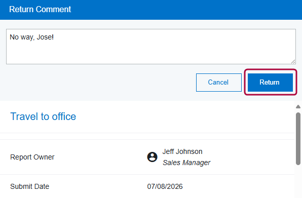 Approuver les dépenses dans Emburse Enterprise Les utilisateurs dotés des autorisations appropriées peuvent approuver les notes de frais dans Emburse Enterprise et par courriel. Pour plus de détails sur la manière dont les dépenses sont routées pour approbation dans Emburse Enterprise, consultez Processus de routage de l’approbation de dépenses. Accéder aux rapports en attente d’approbation Si vous faites partie du processus d’approbation et que des éléments attendent votre approbation, une barre de notification jaune s’affichera sur votre tableau de bord. Cliquez sur l’un des types d’approbations pour être redirigé vers le tableau de bord Approbations. Vous pouvez également accéder à vos approbations en cliquant sur le bouton MENU dans le coin supérieur gauche. Le cercle jaune indique le nombre d’approbations en attente. La liste des approbations requises affiche toutes les dépenses en attente de votre approbation sur l’onglet Rapport de dépenses y compris le propriétaire du rapport, le nom du rapport, l’ID du rapport, la date d’envoi, le montant dépensé et le code de devise. Choisir un rapport à approuver Recherche rapide 1. Cliquez sur l’icône de la loupe pour effectuer une recherche rapide par Personne à rembourser ou ID du rapport. 2. Utilisez la liste déroulante pour sélectionner la personne à rembourser ou l’identifiant du rapport, puis commencez à taper dans le champ de recherche. Pour les recherches de personnes à rembourser, vous pouvez également effectuer une recherche par titre Pour effectuer une recherche à l’aide de l’identifiant du rapport, vous devez saisir l’identifiant complet. 3. Les résultats de votre recherche persisteront (même après l’ouverture et la fermeture des rapports) jusqu’à ce que vous cliquiez sur ANNULER ou que vous quittiez le tableau de bord Approbations. Trier et filtrer les approbations Utilisez le bouton TRIER dans le coin supérieur droit pour trier la liste par date, nom de famille, montant, date de validation ou d’attribution. L’option Validé vous permet de regrouper toutes les dépenses comportant un avertissement. La fonction TRIER vous donne également accès à des filtres. Vous pouvez filtrer les résultats selon les différents critères déterminés par votre organisation. Vous pouvez également créer des filtres personnalisés. Masquer l’examen Si vous faites partie d’un grand groupe d’approbateurs, utilisez le filtre MASQUER L’EXAMEN pour voir seulement les rapports de vos listes d’approbations qui ne sont pas en cours d’examen par d’autres approbateurs. Si un rapport se trouvant dans la liste filtrée est ouvert par un autre examinateur, il sera retiré de la liste. Afficher les informations de prévisualisation du rapport Pour afficher les informations du rapport dans la liste Approbations requises, cliquez sur le nom du rapport. L’aperçu du rapport se remplira à droite. Afficher le profil du propriétaire du rapport Dans l’aperçu du rapport, cliquez sur le nom du propriétaire du rapport dans l’aperçu pour accéder à sa carte de profil. Les cartes de profil contiennent des renseignements comme le titre de la personne à rembourser, l’adresse e-mail et les rôles attribués. Cliquez sur VOIR PLUS pour voir tous les détails. Sur la carte de profil de l’utilisateur, la section des commentaires de l’approbateur permet aux approbateurs de partager entre eux des commentaires privés concernant l’utilisateur. Cette section permet de fournir du contexte aux approbateurs pour les aider à évaluer le risque associé à l’utilisateur avant d’approuver un rapport de dépenses. Les commentaires de l’approbateur ne peuvent être consultés que par les approbateurs autorisés, qui ont obtenu cette permission par l’intermédiaire de la règle « AuthorizeUser ». Les approbateurs ne peuvent pas voir les commentaires ajoutés à leur propre carte de profil d’utilisateur. Actions de prévisualisation du rapport La prévisualisation vous permet d’approuver immédiatement un rapport ou de le renvoyer. Cliquez une fois sur un rapport de dépenses dans la liste pour afficher un aperçu. S’il y a lieu, vous pouvez faire glisser la barre de défilement située à droite vers le haut ou vers le bas. Approuver à partir de l’écran de prévisualisation En cliquant sur APPROUVER dans l’aperçu, vous approuvez immédiatement tous les postes du rapport. Une fois que l’approbateur a confirmé l’approbation et cliqué sur le deuxième bouton APPROUVER, l’ensemble du rapport passera à l’étape suivante du processus d’approbation. Si votre entreprise a activé la fonction Approbateur supplémentaire, reportez-vous à l’article Inclure un approbateur de dépenses supplémentaire pour savoir comment ajouter un deuxième approbateur au processus de réacheminement du rapport. Renvoyer à partir de l’écran de prévisualisation Cliquer sur RENVOYER rejette immédiatement tous les postes sur le rapport. Une fois que l’approbateur a saisi la dépense requise et cliqué sur RETOURNER, l’ensemble du rapport sera renvoyé à la personne à rembourser. Autres actions à partir de l’écran de prévisualisation Cliquez sur le bouton PLUS D’ACTIONS pour accéder à d’autres fonctionnalités à partir de l’écran de prévisualisation. Ouvrir : ouvre le rapport pour approuver ou renvoyer des postes. Suivi : suivez le parcours complet du rapport dans le processus d’approbation. PDF : cliquez sur l’option pour voir diverses versions du rapport PDF : Page de couverture uniquement Rapport complet Rapport complet avec notes et reçus Rapport complet avec reçus seulement Reçus seulement Afficher les postes du rapport Ouvrir un rapport vous permet d’approuver ou de retourner des postes individuellement plutôt que de répondre au rapport en entier en une seule fois. Ouvrir le rapport Pour ouvrir un rapport, double-cliquez dessus
