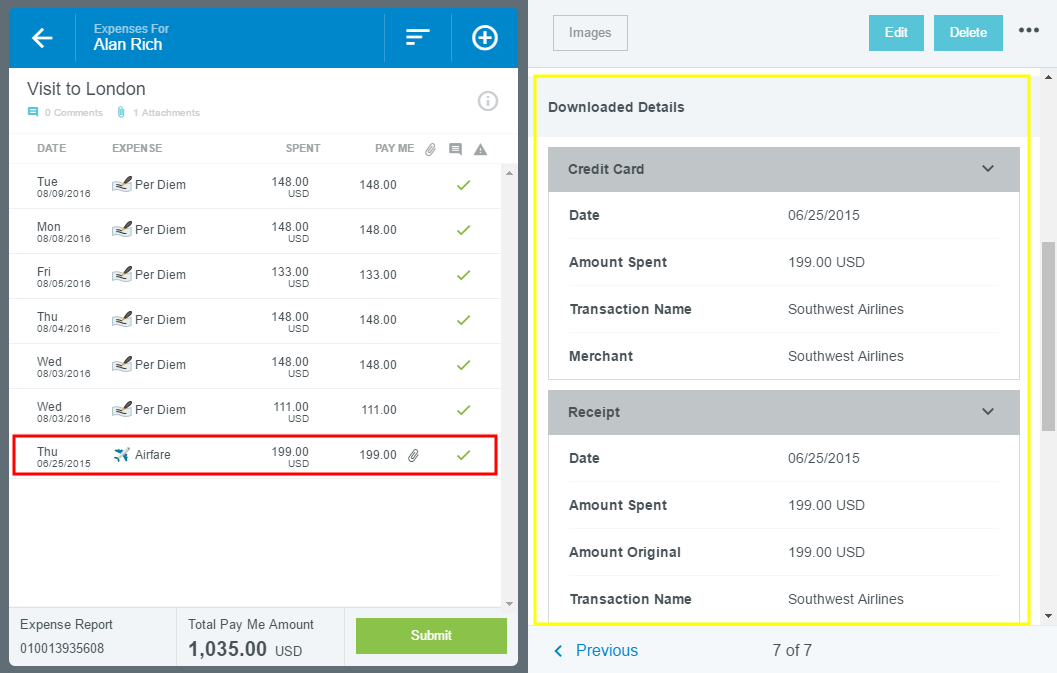 Fusionner les transactions Lorsqu’un courriel ou un reçu de déplacement transféré duplique une transaction par carte bancaire ou d’autres données de déplacement déjà importées dans Emburse Enterprise, le système les fusionne automatiquement. Pour qu'une fusion puisse se produire automatiquement, les conditions suivantes doivent être observées : Les types de dépenses correspondent. Les dates sont à moins de deux jours l'une de l'autre. Les montants ne s'écartent pas de plus de 25 % l'un de l'autre. Toutefois, si cela s'avère nécessaire, vous pouvez fusionner manuellement des transactions de tout type, montant ou date, sous réserve des restrictions suivantes : Une transaction par carte de crédit ne peut jamais être fusionnée avec une autre transaction par carte de crédit. Les Notifications AMEX en temps réel peuvent uniquement être fusionnées avec des transactions par carte de crédit. Une note d’hôtel téléchargée ou envoyée par courriel ne peut jamais être fusionnée avec une autre note d’hôtel. Les transactions de données de déplacement ou d’agence de voyages ne peuvent être fusionnées que si elles proviennent de fournisseurs de données différents. Voir les transactions fusionnées Dans l’onglet TOUT du portefeuille électronique, utilisez le bouton à bascule situé dans le coin supérieur droit pour passer de l’affichage de toutes les transactions à celui des transactions fusionnées. Fusionner manuellement les transactions 1. Accédez au portefeuille électronique et cliquez sur TOUT pour afficher toutes les transactions. 2. Déterminez les transactions que vous souhaitez fusionner. Choisissez une transaction et glissez-la sur l'autre. 3. La nouvelle transaction fusionnée sera nommée [premier élément] + [deuxième élément] + [troisième élément] et ainsi de suite, en fonction de la hiérarchie établie par le système. Cliquez ici pour afficher la hiérarchie. Carte de crédit / Carte de paiement par la firme / Carte pour réunions / Carte de crédit internationale Compte personnel Agence de voyages / Données de voyage (si vous fusionnez l’agence de voyage & les données de voyage, le premier élément sera celui dont la date de création est la plus récente) Éléments hors ligne : reçus envoyés par courriel / Images téléversées / Données de l'application iOS Préautorisation AMEX Dans le portefeuille électronique, la transaction fusionnée apparaîtra dans la section du premier élément (p. ex. carte de crédit, agence de voyages, hors ligne), ainsi que dans la section TOUS. Les autres éléments de l'ensemble fusionné ne figureront plus dans leurs sections respectives du portefeuille électronique. 4. L'icône, la date et les détails du montant affichés sont ceux de l'élément principal de l'ensemble fusionné. Cliquez sur DÉTAILS FUSIONNÉS pour voir tous les éléments de l’ensemble. 5. Cliquez sur le nom du fournisseur ou de la source pour afficher des détails supplémentaires sur l’une des transactions de l’ensemble, y compris les images jointes. 6. Lors que vous glissez l'élément fusionné sur un rapport de dépenses, la ligne d'élément est créée à partir des renseignements du premier élément (p. ex. description, nom du fournisseur, montant, devise, objectif commercial). Les détails de l'ensemble des transactions fusionnées s'affichent toutefois dans la section Détails téléchargés de la ligne d'élément. Défusionner les transactions Vous pouvez défusionner une ou plusieurs transactions si une transaction de données de voyage a été fusionnée par erreur. 1. Trouvez la transaction fusionnée dans le portefeuille électronique et cliquez pour développer toutes les transactions qu’elle contient. Cliquez ensuite sur l’icône de lien cassé sur la transaction souhaitée pour la supprimer du groupe. Si le groupe contient plus de deux transactions, vous devrez cliquer sur chacune des transactions visées pour la séparer du groupe. Si la transaction fusionnée a déjà été ajoutée à un rapport de dépenses, supprimez-la du rapport afin qu'elle figure à nouveau dans le portefeuille électronique, à partir duquel elle pourra être défusionnée. Une fois qu'une transaction a été retirée d'un ensemble fusionné, elle peut être fusionnée à un nouvel ensemble. Transactions AmTrav Les clients qui utilisent l’intégration AmTrav d’Emburse pour la fusion des données de reçus de voyages trouveront ces transactions dans la section Bureau du Portefeuille électronique. Seuls les types de voyages suivants sont pris en charge, et seulement pour les États-Unis. Aérien Train Frais de service Hôtels prépayés Pour obtenir des renseignements complets, cliquez ici pour accéder à la Base de connaissances AmTrav. Cet article vous a-t-il été utile ? Oui Non