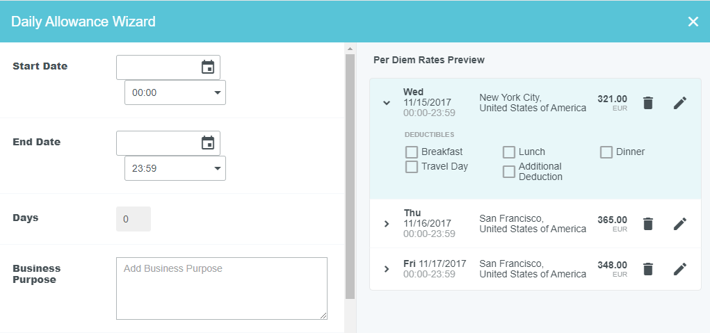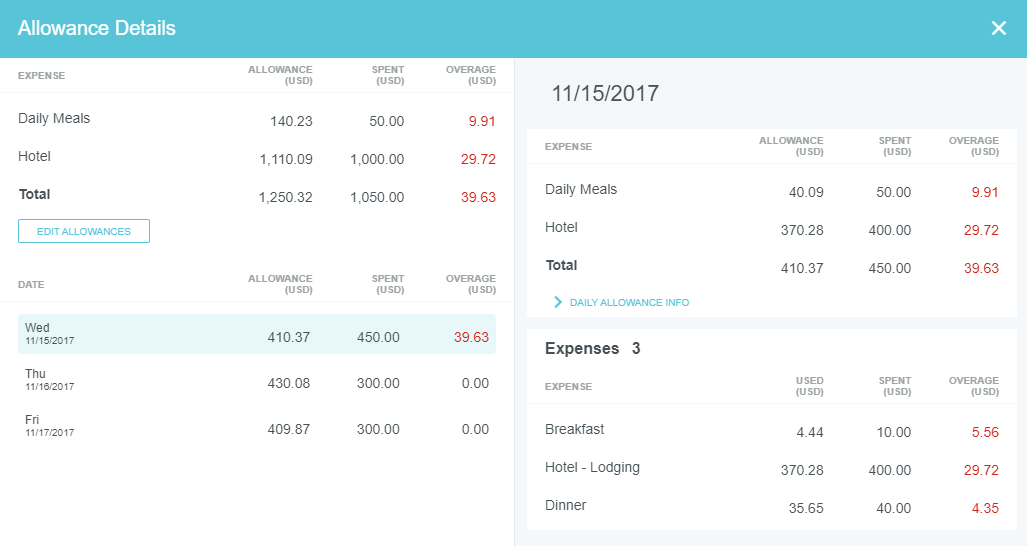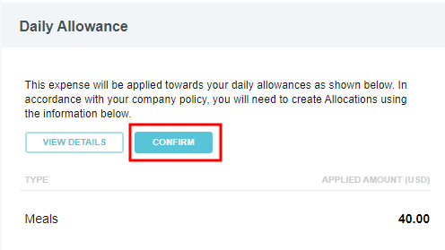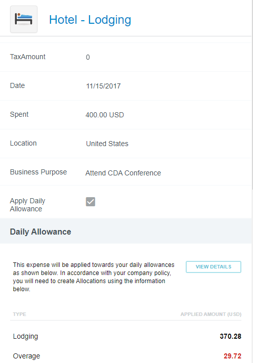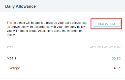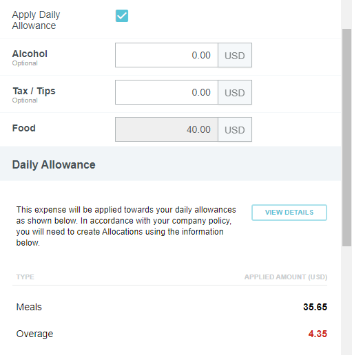 Indemnité journalière de dépenses Certaines entreprises accordent à leurs employés un montant fixe par jour couvrant les frais de séjour et de déplacement reliés à leur travail. Cette somme diffère selon les endroits et est régie par des directives gouvernementales. La fonction Indemnité journalière de dépenses d’Emburse Enterprise permet aux clients de suivre les dépenses réelles par rapport aux dépenses autorisées via les postes d’allocation sur les notes de frais. Alors que la fonctionnalité Indemnité per diem d’Emburse Enterprise donne aux utilisateurs une somme quotidienne forfaitaire, l’indemnité journalière de dépenses ne rembourse les utilisateurs que pour le montant réel dépensé pour les repas et l’hébergement, et elle assure le suivi de tous les excédents. Par exemple, si vous avez droit à 100 $par jour pour les repas et que vous dépensez 10 $ pour le déjeuner, 10 $ pour le dîner et 150 $ pour le souper, le système vous remboursera entièrement le déjeuner et le dîner, mais montrera que seulement 80 $ du souper sont compris dans l’indemnité, avec un excédent de 70 $ qui s’affiche sur le rapport de dépenses. Consultez votre administrateur Emburse Enterprise pour savoir comment votre entreprise a choisi de gérer les excédents. De plus, des indemnités peuvent être utilisées dans des rapports distincts pour le même utilisateur aux mêmes dates. Les détails complets de tous les rapports pour cette date peuvent être consultés sur un seul écran Détails de l’indemnité. Créer une indemnité journalière 1. Sur l’écran Ajouter une dépense, cliquez sur CRÉER UNE NOUVELLE et cliquez sur le type de dépense de l’ASSISTANT D’INDEMNITÉ JOURNALIÈRE dans la mosaïque. 2. Saisissez les détails de la dépense, y compris l’adresse complète dans le champ Emplacement et Indemnité, et cliquez sur AJOUTER POUR GÉNÉRER UN APERÇU. 3. L’aperçu vous montre les dépenses admissibles pour chaque jour et vous permet de sélectionner des franchises, si nécessaire. Cliquez sur APPLIQUER. 4. Un sommaire des indemnités apparaîtra maintenant dans l’aperçu de l’en-tête du rapport. 5. Cliquez sur AFFICHER LES DÉTAILS dans le Sommaire des indemnités pour obtenir des informations complètes sur les indemnités pour votre emplacement sélectionné. La section supérieure affiche le total des repas quotidiens et des montants liés à l’hôtel pour la totalité du voyage dans la colonne Indemnité. La section inférieure indique la somme des montants quotidiens des repas et des hôtels par jour dans la colonne Indemnité. 6. Cliquez sur MODIFIER LES INDEMNITÉS pour modifier l’emplacement ou la date; vous ne pourrez pas saisir le montant. Une fois que vous aurez créé des indemnités à l’aide de l’Assistant d’indemnité journalière, vous pourrez ajouter des lignes à votre rapport et leur appliquer l’indemnité journalière. Ajouter les dépenses pour les repas 1. Créez une nouvelle ligne pour le repas approprié et cochez la case « APPLIQUER L’INDEMNITÉ JOURNALIÈRE ». Veuillez noter que votre organisation peut choisir d’appliquer automatiquement l’indemnité journalière sans que vous n’ayez à cocher la case. 2. Le montant sera détaillé dans la section Indemnité journalière pour vous indiquer la portion de l’indemnité qui sera utilisée. Veuillez noter que l’alcool n’est jamais remboursé par l’indemnité journalière; ces dépenses seront donc traitées comme des excédents. Tous les frais d’alcool que vous saisirez devront être payés de votre poche. Si votre organisation a désactivé la possibilité d’ajouter des dépenses liées à l’alcool, vous ne verrez plus les champs Alcool, Taxe/Pourboire ou Aliments. 3. Si vous ajoutez un montant de Taxe/Pourboire, il sera divisé en fonction du rapport entre les aliments et l’alcool. Cliquez sur ENREGISTRER. 4. Lorsque vous additionnez vos dépenses pour les repas de la journée, vous ne serez remboursé que jusqu’à concurrence du montant de l’indemnité journalière. Dans l’exemple illustré, la personne à rembourser n’avait que 35,65 $ en indemnité restante pour les repas ce jour-là. Ainsi, 4,35 $ d’un souper de 40 $ sera considéré comme un excédent. 5. Cliquez sur AFFICHER LES DÉTAILS pour voir comment les montants sont calculés. Ajouter des dépenses d’hébergement 1. Créez une dépense d’hôtel et cliquez sur DÉTAILLER. Lorsque vous créez chaque détail applicable, cochez la case APPLIQUER L’INDEMNITÉ JOURNALIÈRE. Veuillez noter que votre organisation peut choisir d’appliquer automatiquement l’indemnité journalière sans que vous n’ayez à cocher la case. 2. Selon la configuration de votre organisation, vous pouvez uniquement appliquer l’indemnité journalière à l’hébergement, ou vous pouvez utiliser l’indemnité pour plusieurs types de dépenses d’hôtel, comme le Wi-Fi, le stationnement ou la buanderie. De plus, il existe de nombreuses façons pour votre organisation de configurer la Taxe de séjour. Consultez votre administrateur Emburse Enterprise pour plus de détails sur la saisie de la Taxe de séjour. 3. Pour chaque jour où il y a des dépenses liées à l’hébergement, vous ne serez remboursé que jusqu’à concurrence du montant de l’indemnité journalière. Dans l’exemple illustré, la personne à rembourser n’avait que 370,28 $ d’indemnité restante pour l’hébergement ce jour-là. Ainsi, 29,72 $ d’un tarif de chambre d’hôtel de 400 $ sera considéré comme un excédent. 4. Cliquez sur AFFICHER LES DÉTAILS pour voir comment les montants sont calculés. Modifier l’indemnité journalière Vous pouvez modifier l’emplacement de l’indemnité journalière, les dates, les franchises et tous les autres détails, à l’exception des montants. 1. Cliquez sur AFFICHER LES DÉTAILS dans le Sommaire des indemnités. 2. Cliquez ensuite sur MODIFIER