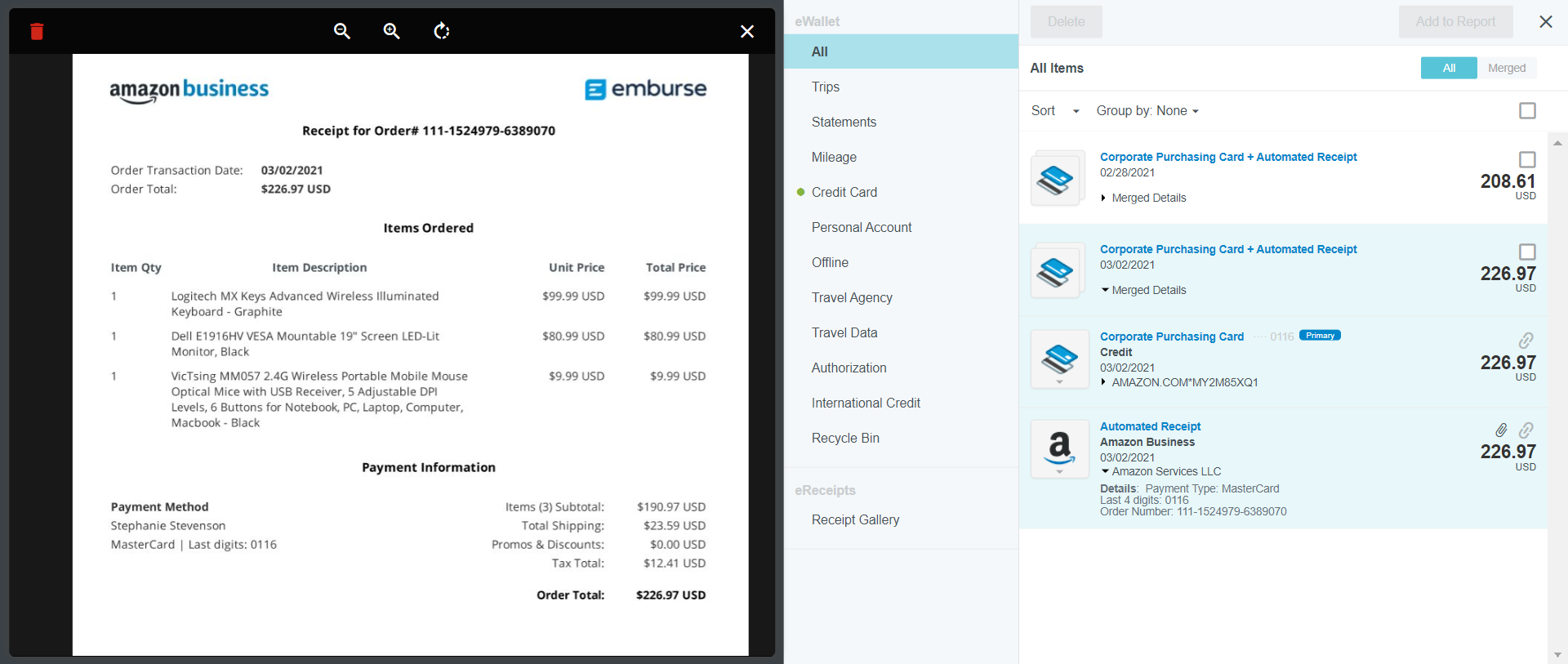 Ajouter des transactions Amazon Business à un rapport L’intégration Amazon Business d’Emburse Enterprise importe automatiquement les achats Amazon Business dans Emburse Expense Enterprise. Si votre entreprise exploite cette fonctionnalité, un reçu sera automatiquement généré et joint à chaque transaction Amazon Business dans Emburse Enterprise, ce qui vous permettra de les ajouter facilement aux notes de frais. 1. Passez votre commande à l’aide du compte Amazon Business de votre organisation. Environ 24 heures après l’expédition de la commande, elle apparaîtra comme une transaction dans le portefeuille électronique d’Emburse Enterprise. 2. Accédez à l’onglet Hors ligne du portefeuille électronique et trouvez la transaction Amazon Business souhaitée. Le reçu généré par le système comprend un aperçu des détails de l’achat. 3. Cochez la case dans le coin supérieur droit de la transaction dans la liste et cliquez sur AJOUTER AU RAPPORT. 4. La transaction entière sera ajoutée au rapport comme un seul poste. Cet article vous a-t-il été utile ? Oui Non