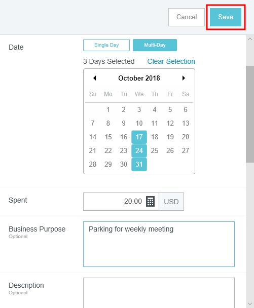 Entrée d'une ligne d'élément de plusieurs jours Si votre organisation a activé l'entrée d'une ligne d'élément de plusieurs jours sur l'écran d'entrée des dépenses, vous pouvez saisir des informations pour une ligne d'élément unique et les appliquer sur plusieurs jours afin de créer plusieurs lignes. Par exemple, les voyageurs effectuant des séjours fréquents ou de longue durée qui reçoivent une allocation fixe pour des dépenses comme le taxi, les repas et le stationnement peuvent rapidement accumuler des dépenses mensuelles. Notez que cette fonctionnalité diffère de l'assistant Ventilation des dépenses d'hôtel récurrentes, qui ne concerne que les lignes d'élément détaillées. À l'heure actuelle, il n'est pas possible d'entrer une ligne d'élément sur plusieurs jours lorsqu'elle comporte une transaction, un reçu ou des renseignements supplémentaires, comme les données définies par l’utilisateur sur le choix d'emplacement. L’entrée d’éléments de ligne de plusieurs jours n’est pas non plus disponible pour des détails tels que les frais d’hôtel ou les indemnités journalières. Créer une dépense de plusieurs jours [1] Sur l’écran Saisie des dépenses, au-dessus du sélecteur de date, cliquez sur PLUSIEURS JOURS. [2] Cliquez sur le calendrier pour sélectionner les jours pour lesquels vous souhaitez créer la dépense. Cliquez sur EFFACER LA SÉLECTION si vous faites une erreur et que vous devez recommencer. [3] Continuez de remplir les autres champs de l'écran Expense Entry. Lorsque vous aurez terminé, cliquez sur ENREGISTRER. [4] Les lignes d'élément seront ajoutés à votre rapport pour chacun des jours sélectionnés. Modifier la dépense de plusieurs jours Au besoin, vous pouvez modifier la dépense de plusieurs jours comme vous le feriez pour toute autre ligne d'élément. Notez que les modifications ne seront apportés qu'à la ligne d'élément spécifique, et non à tous les éléments créés à l'aide de la fonctionnalité de création de dépenses sur plusieurs jours. [1] Sélectionnez l’élément de ligne souhaité et cliquez sur MODIFIER. [2] Effectuez la modification souhaitée et cliquez sur ENREGISTRER. [3] La modification s'affiche dans la liste des lignes d'élément. Cet article vous a-t-il été utile ? Oui Non