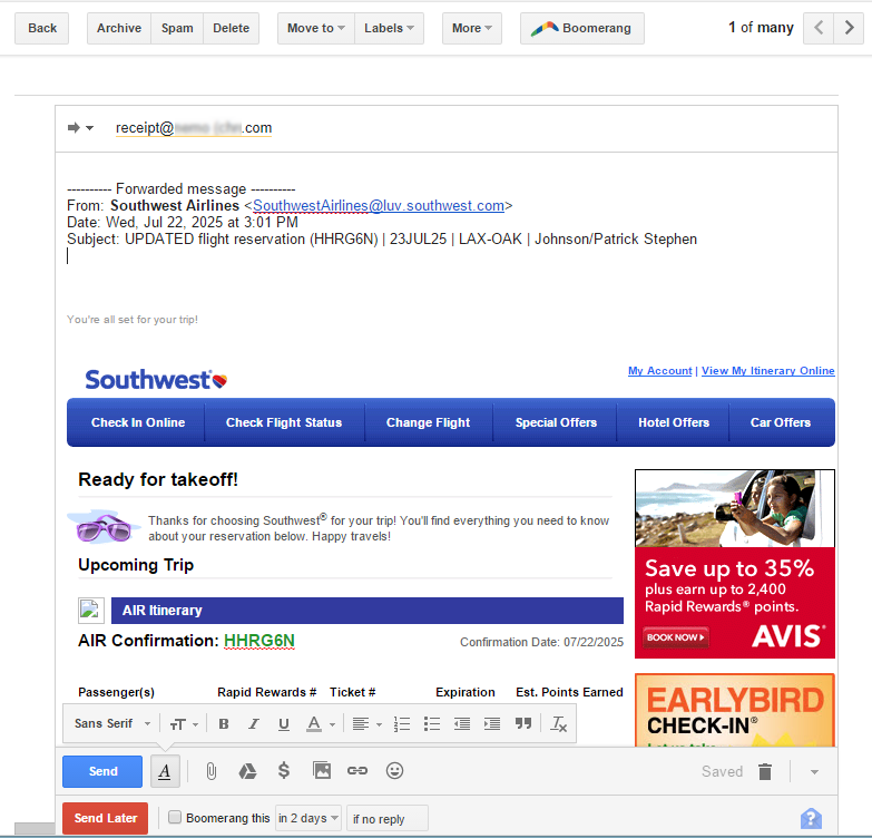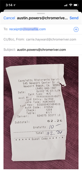 Créer des éléments de dépenses par courriel Emburse Expense Enterprise vous permet de créer de nouveaux éléments de dépense par courriel (Snap & Send) pour les joindre plus tard à une note de frais dans l'application en ligne (par exemple, si vous avez pris la photo d'un reçu avec votre appareil mobile pendant un déplacement). Les images envoyées par courriel s'affichent dans la section hors ligne du portefeuille électronique et Galerie de reçus, alors que les courriels de texte en clair apparaissent seulement dans la section hors ligne. Si vous connaissez l'ID du rapport de dépenses auquel vous souhaitez ajouter l'image, vous pouvez l'envoyer directement par courriel à ce rapport. Seuls les fichiers JPG, PDF, PNG, OFD et TIFF d’au moins 50 Ko et d’au plus 10 Mo peuvent être acceptés, et la taille combinée de tous les fichiers téléversés dans un seul rapport ne peut pas dépasser 100 Mo. Pour obtenir une liste complète des modes d’envoi des reçus, voir Cas d’envoi de reçu. Comment trouver l’adresse courriel Étant donné qu’Emburse Enterprise dispose de plusieurs adresses électroniques pour la soumission des reçus, votre administrateur Emburse Enterprise vous fournira l’adresse électronique correcte attribuée à votre entreprise. Si vous n’êtes toujours pas sûr, il y a deux façons de trouver l’adresse courriel. Ouvrez une page de couverture PDF en suivant ces instructions et utilisez l’adresse courriel en haut. Trouvez l’instance de votre organisation dans le tableau ci-dessous pour voir l’adresse courriel correspondante. Pour rechercher l’instance que votre organisation utilise, consultez Comprendre les instances et les environnements de Chrome River. C1 receipt@chromefile.com C3 receipt@eu1.chromeriver.com C5 receipt@ca1.chromeriver.com C7 receipt@us2.chromeriver.com Reçus de texte en clair 1. Envoyez un nouveau message courriel contenant les informations suivantes. L’adresse « À » est celle attribuée à votre organisation. Reportez-vous à la section « Comment trouver l’adresse courriel » ci-dessus pour plus de détails. L'adresse électronique « De » doit être associée à votre compte Emburse Expense Enterprise en ligne. L'Objet doit être le montant des dépenses et ne pas comprendre de symboles - le code de devise correspondant est facultatif. Si vous omettez le montant des dépenses dans la ligne d'objet du courriel, le montant dépensé qui s'affichera sur Emburse Enterprise en ligne sera : 0,00. Le corps du message doit contenir la description de la dépense. Ce texte s'affiche dans la section Description de tous les rapports produits en format PDF. Indiquez #note au début du corps du message pour que le système prenne en compte les premiers 1500 caractères (ou tout ce qui se trouve avant le saut de ligne) du texte dans le champ Description. 2. Une fois qu’il est reçu, vous serez en mesure de voir la dépense dans la section hors ligne du portefeuille électronique. 3. Il suffit de joindre le reçu à vos dépenses comme vous le feriez pour tout autre reçu. Consultez la section Ajouter des images de reçu pour de plus amples renseignements sur la façon de voir et de joindre les images de reçus. Envoyer un reçu en format HTML 1. Si vous avez reçu une confirmation ou un reçu de courriel HTML pour une dépense, vous pouvez le « transférer et oublier» directement à l’adresse courriel attribuée à votre organisation (voir ci-dessus) pour le convertir en une image de reçu et une transaction de dépense correspondante. Le système ignorera toute signature de courriel, mais le courriel ne doit pas contenir de pièces jointes. L’adresse électronique « De » doit être l’une des adresses indiquées dans les paramètres de votre compte Emburse Enterprise. 2. Le fichier PDF créé à partir du courriel au format HTML que vous avez transféré se trouvera dans le dossier Hors ligne de l'onglet Éléments. 3. Le logiciel d'imagerie d’Emburse Enterprise extraira les données de reconnaissance optique de caractères (OCR) valides à partir du plus grand nombre possible de critères suivants : Montant Devise Type d'élément Date Fournisseur 4. Si vous remplacez la ligne d'objet du courriel par un montant et un code de devise, ces données seront priorisées par rapport au montant et à la devise extraits par la ROC. 5. Si vous remplacez la ligne d'objet du courriel par un ID du rapport, le reçu sera joint directement à ce rapport. Si vous utilisez cette méthode pour joindre un document PDF de plusieurs pages contenant uniquement des images, chacune d’entre elles sera créée comme un élément de dépense distinct, à moins que vous ajoutiez le montant et la devise dans la ligne d’objet du courriel lorsque vous le soumettez. Si un document PDF de plusieurs pages contient également du texte, un élément unique sera créé. 6. Si vous indiquez #note au début du corps du message, le système prendra en compte les 1500 premiers caractères (ou tout ce qui se trouve avant le saut de ligne) du texte dans le champ Description de l'élément de dépense dont il est question. Images de reçus Pour envoyer des images de reçus avec votre dépense par courriel, il suffit de joindre les images au message. Par exemple, vous pouvez utiliser votre téléphone mobile pour prendre une photo d’un reçu, puis le joindre à un courriel envoyé à partir du téléphone à l’adresse courriel attribuée à votre organisation. (Si vous n’êtes pas sûr(e), voir « Comment trouver l’adresse courriel » ci-dessus, pour plus de détails.) Les images s'afficheront avec la dépense dans la Galerie de reçus et dans l'onglet hors-ligne du portefeuille électronique. Chaque image s'affichera comme un élément distinct, avec les renseignements correspondants à la dépense. Si vous joignez un document PDF de plusieurs pages contenant uniquement des images, chacune d'entre elles sera créée comme un élémen