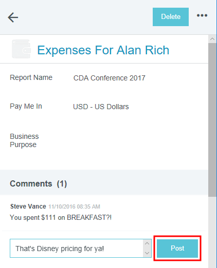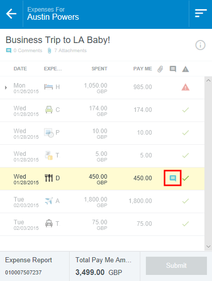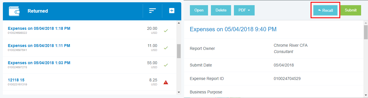 Rapports des dépenses renvoyé Parfois, un approbateur retournera une ou plusieurs lignes d’élément d’un rapport de dépenses à la personne à rembourser durant le processus d’approbation. Le rapport réapparaîtra dans la grille Renvoyé. Afficher les dépenses renvoyées et les notes Vous pouvez accéder à la grille des renvoyés directement à partir du tableau de bord en cliquant sur le nombre de dépenses renvoyées. Vous pouvez également accéder à la grille Renvoyé via le menu de navigation de gauche, en cliquant sur RENVOYÉ dans la section Dépenses. Cliquez une seule fois sur le rapport souhaité dans la grille pour voir son aperçu. Afficher les commentaires et y répondre Vous pouvez afficher les commentaires dans l’en-tête et y répondre directement à partir de l’aperçu des dépenses. Les commentaires dans l’en-tête peuvent également être affichés dans le rapport. Double-cliquez sur le rapport souhaité dans la grille pour l’ouvrir. Les lignes d’élément renvoyées seront surlignées en jaune. Vous pouvez accéder à toutes les notes de l’approbateur au niveau de l’en-tête qui s’appliquent à l’ensemble du rapport en cliquant sur le lien Commentaires dans l’en-tête. Si l’approbateur a laissé une note sur une ligne spécifique, cliquez sur l’icône de note bleue pour la lire. Vous pouvez répondre aux notes dans la boîte de la section Commentaires. Cliquez sur PUBLIER pour l’ajouter au rapport. Modifier les lignes d’élément renvoyées Seules les lignes d’élément renvoyées peuvent être modifiées. Par exemple, si votre dépense présente quatre lignes d’élément et seules deux sont renvoyées, seules ces deux lignes peuvent être modifiées. Cliquez sur l’élément de ligne renvoyé, puis cliquez sur MODIFIER dans l’aperçu. Apportez les modifications nécessaires à l’élément de ligne et cliquez sur ENREGISTRER. Supprimer les lignes d’élément renvoyées Cliquez sur Supprimer dans l’aperçu de l’élément de ligne ou dans l’élément de ligne pour le supprimer du rapport Remarque : Puisque de nouvelles lignes d’élément ne peuvent être ajoutées aux rapports renvoyés, une ligne d’élément ne peut être restaurée une fois supprimée. Toutefois, des détails (p. ex., les dépenses « enfant » indiquées dans une dépense « parent » comme une ligne d’élément d’hôtel) peuvent être ajoutés à un rapport renvoyé, à condition que la dépense parent soit toujours présente. Récupérer les lignes d’élément renvoyées Si votre organisation utilise la fonctionnalité de récupération du routage de dépenses, les personnes à rembourser et leurs délégués peuvent renvoyer tout rapport de dépenses à l’état de brouillon, tant et aussi longtemps qu’aucune des lignes d’élément n’a été entièrement approuvée. Pour connaître tous les détails, consultez la section Rappeler un rapport de dépenses. [1] Sélectionnez le rapport dans la liste Renvoyé et cliquez sur RÉCUPÉRER dans l’aperçu. [2] Vous devrez confirmer que vous désirez renvoyer le rapport au statut de Projet dans la liste des Rapports de dépenses. Cliquez sur OUI. Envoyer de nouveau les lignes d’élément renvoyées Lorsque toutes les modifications ont été apportées, cliquez sur ENVOYER pour envoyer à nouveau le ou les lignes d’élément pour approbation. Dans la fenêtre contextuelle Soumettre la confirmation, cliquez sur ENVOYER. Cet article vous a-t-il été utile ? Oui Non