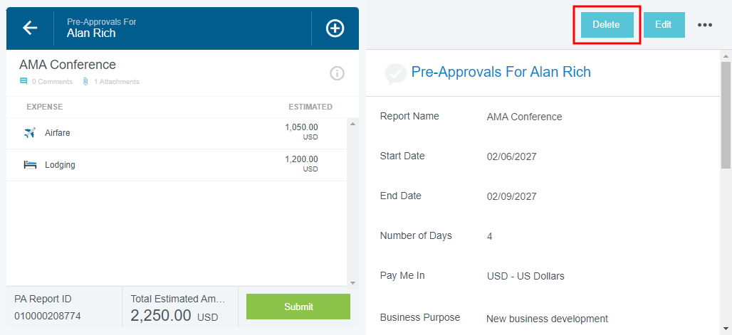 Préapprobations renvoyées Lorsqu'un approbateur retourne une demande de préapprobation au demandeur dans le cadre du processus d'approbation, cette demande s'affichera dans la liste des préapprobations retournées. Accès aux préapprobations retournées Cliquez sur le nombre de préapprobations RENVOYÉES dans la section Préapprobation du tableau de bord. Pour accéder à vos préapprobations renvoyées depuis n’importe où ailleurs dans l’interface, cliquez sur le bouton MENU, puis cliquez sur RENVOYÉ dans la section Préapprobation du menu déroulant. Modifier les demandes de préapprobation retournées [1] Cliquez sur la préapprobation renvoyée que vous souhaitez afficher et un aperçu glissera à partir de la droite. Cliquez sur le nom du rapport ou cliquez sur OUVRIR. Vous pouvez également double-cliquer sur la préapprobation dans la liste pour l’ouvrir. 2. Sélectionnez l’élément que vous souhaitez ajuster et cliquez sur MODIFIER. [3] Modifiez le montant, saisissez une description, si vous le souhaitez, et cliquez sur ENREGISTRER. [4] Pour supprimer l'élément de ligne et en créer une nouvelle, cliquez sur SUPPRIMER, puis cliquez sur le bouton + pour ajouter un nouvel élément de ligne. 5. Lorsque vous êtes prêt(e) à soumettre à nouveau la demande de préapprobation, cliquez sur le bouton vert ENVOYER dans la demande renvoyée. Vous pouvez également soumettre à nouveau votre demande à partir de la liste des demandes de préapprobation retournées. Cliquez sur la demande pour ouvrir son aperçu, puis cliquez sur le bouton vert ENVOYER dans le coin supérieur droit. 6. Sur l’écran Soumettre la confirmation, cliquez sur ENVOYER. Supprimer les demandes de préapprobation retournées Pour supprimer la totalité de votre demande de préapprobation et recommencer, cliquez dessus dans la liste Rapports de préapprobation renvoyés pour ouvrir l’aperçu, puis cliquez sur SUPPRIMER. Sur les appareils à petit écran, le bouton SUPPRIMER se trouve sous le menu déroulant des points de suspension. Si la demande est ouverte, cliquez sur SUPPRIMER dans l'aperçu. On vous demandera de confirmer la suppression. Cliquez sur SUPPRIMER. Cet article vous a-t-il été utile ? Oui Non