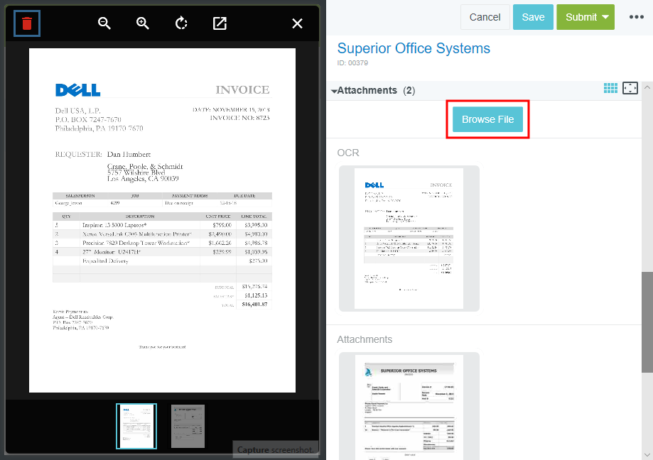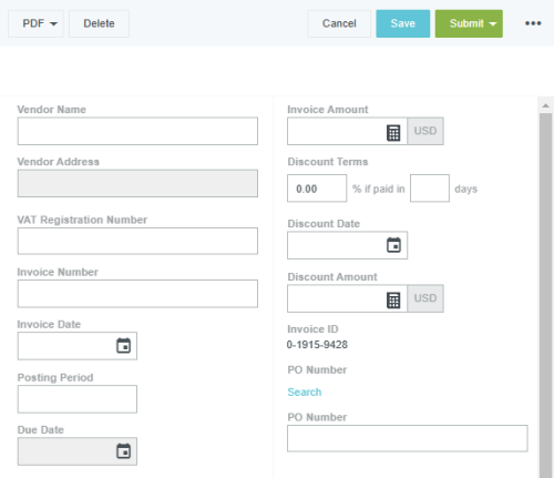 Créer une facture Chaque facture de fournisseur est entrée dans son propre dossier de facture unique. Vous trouverez ci-dessous des informations sur la création d’une facture dans Emburse Enterprise. Les factures peuvent également être créées simplement en transférant le courriel d’un fournisseur avec une facture en pièce jointe. Consultez Créer des factures par courriel pour obtenir des renseignements détaillés. 1. Dans le tableau de bord, cliquez sur le bouton +CRÉER dans le coin supérieur droit du ruban Factures. 2. 2. Sur les appareils munis d’un écran large, il est recommandé de faire défiler la page vers le bas jusqu’à la section Pièces jointes, puis de cliquer sur PARCOURIR LE FICHIER afin de téléverser l’image de la facture. Vous pouvez également faire glisser la facture et la déposer dans l’écran Saisie des factures pour la joindre. Vous pourrez ainsi voir facilement les détails de la facture à côté de l’écran de saisie. Pour savoir comment créer une nouvelle facture en télécopiant ou en numérisant une image de facture et en l’envoyant par courriel, consultez Ajouter des images à une facture. Pour obtenir des renseignements sur la création automatique de factures à partir d’OCR VISION d’Emburse Enterprise, consultez la rubrique Remplir automatiquement les données de la facture via OCR VISION. Informations du titre de la facture Vous pouvez créer une nouvelle facture à partir de rien ou utiliser l’écran Factures antérieures pour vous servir d’une ancienne facture comme modèle et préremplir plusieurs des champs. Les champs sur votre écran peuvent être différents de ceux qui sont montrés ci-dessous, selon la politique et les lignes directrices de l’entreprise. Nom du fournisseur : Cliquez pour afficher les noms récents et tous les noms et identifiants de fournisseur Commencez à taper pour faire une recherche à partir de n’importe quelle partie du nom ou de l’identifiant du fournisseur. Si vous ne trouvez pas le fournisseur ou s’il n’existe pas, cliquez sur le bouton CRÉER UN FOURNISSEUR TEMPORAIRE pour créer une demande de nouveau fournisseur temporaire. Consultez la section Créer un nouvel fournisseur temporaire pour obtenir de plus amples renseignements. Adresse du fournisseur : Une fois que vous avez saisi un fournisseur, cliquez sur ce champ pour choisir dans une liste d’adresses associées. Si l’adresse du fournisseur est introuvable ou n’existe pas, cliquez sur le bouton CRÉER UNE NOUVELLE ADRESSE pour créer une demande d’adresse de nouveau fournisseur temporaire. Consultez la section Créer un nouvel fournisseur temporaire pour obtenir de plus amples renseignements. No facture Numéro de la facture : saisissez le numéro de la facture exactement comme il est affiché sur l’image de la facture. Date de la factureCliquez pour ouvrir le CALENDRIER et choisissez une date qui correspond à la date de facture sur l’image de facture. Période comptable : si votre organisation a activé cette fonctionnalité, sélectionnez la période pour laquelle la transaction doit être comptabilisée. Date d'échéance : si des conditions de paiement du fournisseur sont associées au dossier d'adresse du fournisseur sélectionné, ces conditions et la date d'échéance sont affichées ici. Montant de la facture : Montant de la facture : saisissez le montant de la facture ou cliquez sur l’icône de CALCULATRICE pour effectuer une addition, une soustraction, une multiplication ou une division. Remarque : sélectionnez la flèche qui pointe vers le haut (^) dans le coin supérieur droit de la calculatrice pour afficher un ruban électronique des quatre dernières entrées. S’il y a plus que quatre entrées, utilisez la barre de défilement pour revoir et vérifier l’entrée de données. Pressez la touche ENTRÉE pour additionner la dernière entrée et mettre à jour le champ du montant. Devise : les codes de devise sont automatiquement remplis dans ce champ selon l'adresse du fournisseur sélectionnée. Si le code de devise affiché ici ne concorde pas avec celui qui est indiqué sur l’image de la facture, sélectionnez le bon code dans la liste déroulante de devises. Le système met quotidiennement à jour le taux de change à partir de XE.com à minuit UTC et s’en sert pour fournir une estimation du taux de change selon la date de la facture. Conditions du rabais, Date du rabais et Montant du rabais :si votre organisation a activé cette fonctionnalité et que le fournisseur propose un rabais pour paiement anticipé, vous pouvez appliquer les conditions dans ces champs. Elles reflètent les conditions par défaut définies dans le dossier de l’adresse du fournisseur, mais vous pouvez remplacer les conditions par défaut ici (ou les ajouter si l’adresse du fournisseur n’a pas de conditions par défaut). Appliquer des conditions de rabais aux factures et aux bons de commande Numéro de BC Numéro de BdC : saisissez le numéro ou cliquez sur RECHERCHER pour trouver le bon de commande correspondant. Vous pouvez joindre plusieurs bons de commande du même fournisseur à une seule facture. OCR VISION pour le remplissage automatique de données Si votre entreprise s’abonne à OCR VISION d’Emburse Enterprise, les informations suivantes seront automatiquement extraites de l’image de la facture que vous avez jointe, et les champs seront automatiquement remplis : N° facture : Numéro de la facture : si le système ne parvient pas à trouver ou extraire un numéro de facture, il en génère un au format suivant : [montant de la facture] [date de la facture] Demandeur : extrait à partir de l’image et associé aux données maîtres de votre entreprise. Nom du fournisseur : extrait à partir de l’image et associé aux données maîtres de votre entreprise. Adresse du fournisseur : extrait à partir de l’image et associé aux données maîtres de votre entreprise. Code de devise M