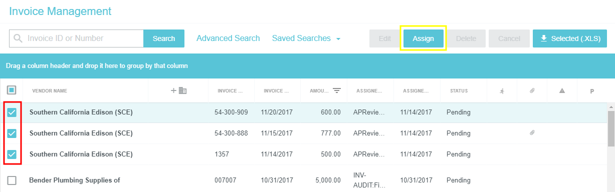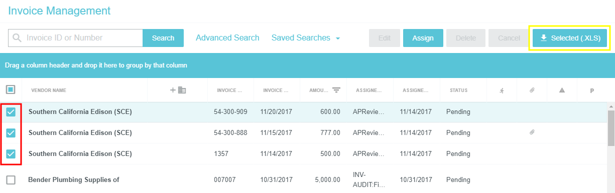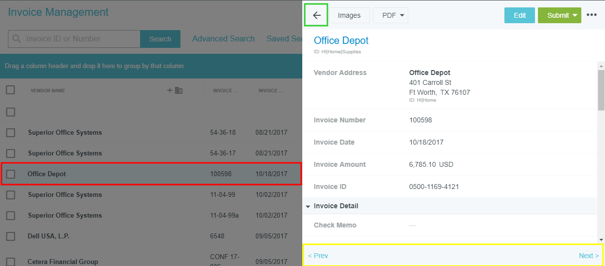 Tableau de bord de gestion des factures Le tableau de bord Invoice Management permet aux utilisateurs bénéficiant des autorisations appropriées d’afficher les factures et de les gérer. Activer le tableau de bord de gestion des factures Les administrateurs peuvent contrôler l’accès des utilisateurs au tableau de bord de gestion des factures via l’écran d’administrateur des autorisations d’accès. 1. Dans le menu Administrateur, cliquez sur SÉCURITÉ > AUTORISATIONS D’ACCÈS. 2. Cliquez sur l’onglet POLITIQUES, sélectionnez la politique appropriée, et cliquez sur MODIFIER. 3. Dans la section Autorisations, sous Facture, recherchez la section Gestion des factures et cochez Gestion des factures. Utilisez les cases à cocher à côté des actions individuelles pour préciser plus en détail ce que les utilisateurs peuvent faire sur le tableau de bord de gestion des factures. 4. Cliquez sur ENREGISTRER. Accéder au tableau de bord de gestion des factures Cliquez sur le bouton MENU dans le coin supérieur gauche, puis cliquez sur GESTION DES FACTURES. Seuls les utilisateurs d’appareils à écran large ont acc`ès à la gestion des factures; les éléments du menu ne s’afficheront pas sur les appareils mobiles à écran étroit. Le tableau de bord Invoice Management s’affichera. En-têtes des colonnes Pour trier la liste de factures selon ce critère, cliquez sur l’en-tête de la colonne. Nom du fournisseur Type de fournisseur No facture Date de la facture Montant : Cliquez sur l’icône entonnoir pour filtrer les factures selon le montant. Assigné à Attribué le Statut Urgent Pièce jointe Avertissement Garé Pour regrouper les factures d’une colonne, vous pouvez glisser l’en-tête de la colonne dans la barre bleue située dans le haut de l’écran. Pour supprimer le groupe, cliquez sur X à côté du nom de l’en-tête de la colonne. Recherchez des factures Utilisez la boîte de texte dans le coin supérieur gauche pour rechercher des factures par numéro ou par ID de facture. Sélectionnez RECHERCHE AVANCÉE pour effectuer une recherche détaillée sur les renseignements d’une facture, son état, son traitement particulier ou le personnel qui s’y rattache. Pour inclure les fournisseurs inactifs dans les résultats de la recherche, un administrateur disposant des autorisations appropriées doit activer la fonctionnalité. Consultez la section « Facture – Inclure les fournisseurs inactifs dans la recherche de la gestion des factures » de la section de l’écran administrateur des préférences du client. Vous pouvez utiliser le curseur à la droite pour faire défiler les options de recherche ou utiliser les onglets de gauche pour vous rendre automatiquement à l’option de recherche voulue. Cliquez ensuite sur RECHERCHER. L’onglet Informations de la facture vous permet d’effectuer une recherche par fournisseur, par numéro de facture, par date de facture, par date d’exportation et à n’importe quel endroit de la description de la facture. L’onglet Traitement particulier vous permet de rechercher parmi plusieurs options de traitement particulier de plusieurs factures de façon simultanée. L’onglet État vous permet de rechercher parmi les statuts de plusieurs factures de façon simultanée. Recherches enregistrées Vous pouvez également cliquer sur ENREGISTRER pour sauvegarder les paramètres de recherche voulus en vue d’une utilisation ultérieure. Une fenêtre surgissante vous demandera de nommer la recherche. Cliquez ensuite à nouveau sur ENREGISTRER. Pour accéder à une recherche sauvegardée, cliquez sur RECHERCHE ENREGISTRÉE dans le haut du tableau de bord Invoice Management, puis sélectionnez la recherche désirée dans la liste. Utilisez l’icône de crayon pour modifier une recherche enregistrée. Utilisez l’icône affichant un A souligné pour renommer la recherche enregistrée. Utilisez l’icône corbeille pour supprimer la recherche enregistrée. Aperçu des dépenses Cliquez une fois sur une facture dans la liste pour ouvrir un aperçu. Dans l’aperçu, cliquez sur PRÉVISUALISER ou sur SUIVANT pour parcourir les aperçus des autres factures sur le tableau de bord. Cliquez sur la flèche arrière en haut à gauche pour revenir au tableau de bord de gestion des factures. Vous pouvez effectuer plusieurs actions directement depuis l’aperçu : Images : cliquez sur cette action pour afficher toutes les images jointes à la facture. PDF : cliquez sur cette action pour afficher la page couverture, le rapport complet (facture) ou le rapport complet (facture) avec image. Modifier : permet d’ouvrir la facture pour la modifier. Envoyer : renvoyer ou approuver la facture. Pour obtenir des informations détaillées, veuillez consulter la section Approuver les factures dans Emburse Enterprise ou par courriel. Cliquez sur l’icône des points de suspension pour avoir accès à des actions supplémentaires : Supprimer : Supprimer la facture. Suivi : voir où se situe la facture dans le processus d’approbation. Pour connaître tous les détails, consultez la section Suivi du routage de facture. Modifier la facture Cochez la boîte à côté de la facture voulue, puis cliquez sur MODIFIER. Attribuer les factures Cochez la boîte située à côté des factures que vous voulez attribuer à un approbateur ou à un groupe précis, puis cliquez sur ATTRIBUER. Choisissez l’approbateur ou le groupe voulu à partir du menu déroulant, entrez un commentaire si cela est nécessaire, puis cliquez sur ATTRIBUER. Annuler ou supprimer une facture Pour obtenir des renseignements complets sur l’annulation ou la suppression d’une facture, et sur la différence entre ces deux actions, consultez Annuler ou supprimer une facture. Configurer les codes d’annulation de facture Les administrateurs peuvent utiliser Écran d’administration des entités pour créer, modifier et supprimer les codes de motif d’annulation de facture qu