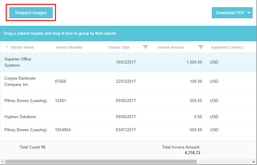 Demande de renseignements pour les FACTURES Le tableau de bord de recherche permet aux utilisateurs de créer des rapports et d’effectuer rapidement des recherches sur l’ensemble de leur activité selon les factures, les approbations et les factures payées. Remarque : Certaines catégories pourraient ne pas être accessibles, selon la configuration Emburse Enterprise de votre entreprise. Si vous désirez accéder à un rapport qui n’est pas affiché, contactez votre administrateur de système. Pour accéder aux rapports d’enquête, cliquez sur le bouton MENU dans le coin supérieur gauche, puis cliquez sur ENQUÊTE. Une liste des rapports de recherche créés par votre organisation s’affiche; elle vous donne un aperçu de l’activité de chacune des catégories et vous permet d’y trouver rapidement des renseignements précis. Rapports de demande de renseignements disponibles NOM DU RAPPORT DESCRIPTION Mes approbations de factures Liste les factures soumises que vous avez approuvées. Mes factures payées Présente les factures payées en tout ou en partie pour lesquelles vous (l’utilisateur délégué) êtes le demandeur. Mes factures Présente les factures dont vous (l’utilisateur délégué) êtes le créateur ou le demandeur attitré. Allocation de factures Liste de toutes les factures liées à une allocation donnée. Produire le rapport Sélectionnez un rapport dans la liste pour l’exécuter. Sur les appareils dotés d’un écran large, le résultat s’affiche dans le volet de droite. Sur les petits appareils, il remplace la liste des rapports. Faites glisser la barre de défilement jusqu’en bas pour faire apparaître les colonnes qui ne s’affichent pas à l’écran. Sélectionnez une facture dans la liste des résultats. Vous pouvez ensuite télécharger la facture en format PDF. Rapport complet : Rapport complet : un résumé détaillé de la facture avec le code QR de la page de couverture utilisé lors de la numérisation de la facture originale. 2 = Rapport complet avec images Rapport complet avec image : les éléments du rapport complet, et toutes les images jointes à la facture. Filtrer les résultats Les résultats du mois en cours s’affichent par défaut. Utilisez le filtre de date de la transaction dans le coin supérieur droit pour modifier les paramètres de date. Vous pouvez également filtrer les résultats dans n’importe quelle colonne à l’aide de l’icône d’entonnoir. Sélectionnez l’entonnoir pour entrer les paramètres, puis cliquez sur FILTRER. Si vous obtenez plus de 1 000 résultats, un message s’affiche pour vous demander de modifier le filtre afin de restreindre le nombre de résultats. Pour supprimer un filtre, cliquez à nouveau sur l’icône de l’entonnoir et sélectionnez EFFACER. Trier les résultats Cliquez sur n’importe quel en-tête de colonne pour trier les résultats par ordre croissant ou décroissant. L’ordre de tri est indiqué par une flèche. Grouper les résultats Vous pouvez grouper les résultats par toute colonne présentant une icône de trois points dans la partie gauche de son nom d’en-tête. Vous n’avez qu’à faire glisser le nom de l’en-tête dans la barre bleue du haut pour trier à nouveau cette liste. Vous pouvez grouper les données par autant d’en-têtes de colonnes que vous le désirez à condition que celles-ci présentent l’icône de trois points. Utilisez la flèche figurant à côté de chaque en-tête de colonne pour trier les résultats. Pour faciliter la navigation, vous pouvez également réduire ou développer tous les éléments groupés d’un rapport. Rapport de mes approbations de factures Ce rapport présente les factures soumises que vous avez approuvées. Sélectionnez une facture dans la liste et cliquez sur SUIVI. Vous verrez toutes les étapes du routage d’approbation de cette facture. Rapport d’enquête sur mes factures Le rapport de demande Mes factures vous permet de suivre les étapes d’acheminement des approbations tout comme le rapport d’enquête Mes approbations. Il vous permet également de demander un PDF de toutes les images associées à une ou plusieurs factures. 1. Cliquez sur DEMANDER DES IMAGES. 2. Saisissez les ID de chaque facture pour laquelle vous souhaitez recevoir des images sur des lignes différentes, comme illustré ci-dessous. Cliquez ensuite sur ENVOYER. 3. Lorsque la demande est exécutée avec succès, vous verrez le ou les ID de rapport dans la bannière de notification de succès. 4. Un PDF d’images vous sera envoyé par courriel. Cet article vous a-t-il été utile ? Oui Non
