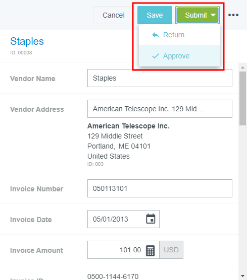 Factures retournées Si un approbateur retourne une facture que vous avez soumise, le ruban d’approbation apparaîtra en haut de votre tableau de bord Emburse Enterprise. 1. Cliquez sur le nombre de factures pour accéder à votre facture renvoyée. 2. Cliquez une fois sur la facture dans la liste pour la prévisualiser. Cliquez sur MODIFIER pour effectuer les modifications requises. 3. Lorsque vous êtes prêt à soumettre à nouveau la facture, cliquez sur ENVOYER à partir de l’intérieur de la facture ou dans le volet de prévisualisation et sélectionnez APPROUVER. 4. On vous demandera de confirmer l’approbation. Cliquez sur APPROUVER. Cet article vous a-t-il été utile ? Oui Non