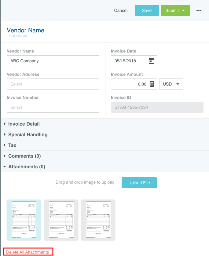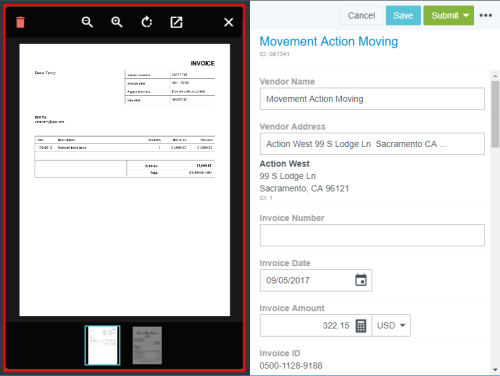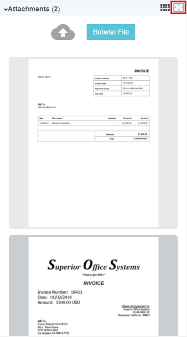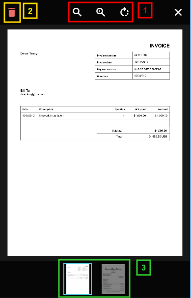 Afficher les images de factures Section Pièces jointes Par défaut, la section Pièces jointes affichera une vignette de chaque image jointe, et le nombre total d’images jointes sera affiché entre parenthèses. Cliquez sur l’icône de la zone d’expansion pour afficher les images en pleine largeur dans le volet. Vue dans la boîte lumineuse Cliquez sur une vignette pour afficher l’image dans la visionneuse. Sur les appareils à écran large, la boîte lumineuse s'ouvre à gauche de l’écran de saisie de la facture. Sur les appareils à petit écran, la boîte lumineuse se glisse sur l’écran de saisie de la facture. Cliquez sur les icônes au-dessus de l’aperçu pour réduire, agrandir ou faire pivoter l’image de la facture. L’icône de corbeille dans le coin supérieur gauche ne supprime que l’image affichée dans la boîte lumineuse. Pour supprimer toutes les images, cliquez sur le bouton rouge SUPPRIMER TOUTES LES PIÈCES JOINTES sous la liste des vignettes sur l’écran Modifier la facture. Les images de vignettes au bas de la boîte lumineuse vous permettent de naviguer parmi plusieurs images jointes. Sur les appareils à écran large, une option supplémentaire vous permet d’ouvrir l’image dans un nouvel onglet de navigation. Cet article vous a-t-il été utile ? Oui Non