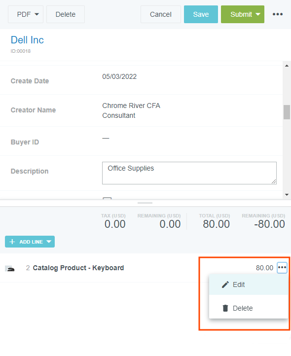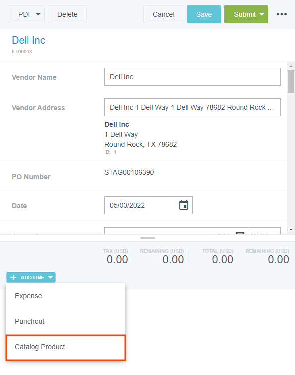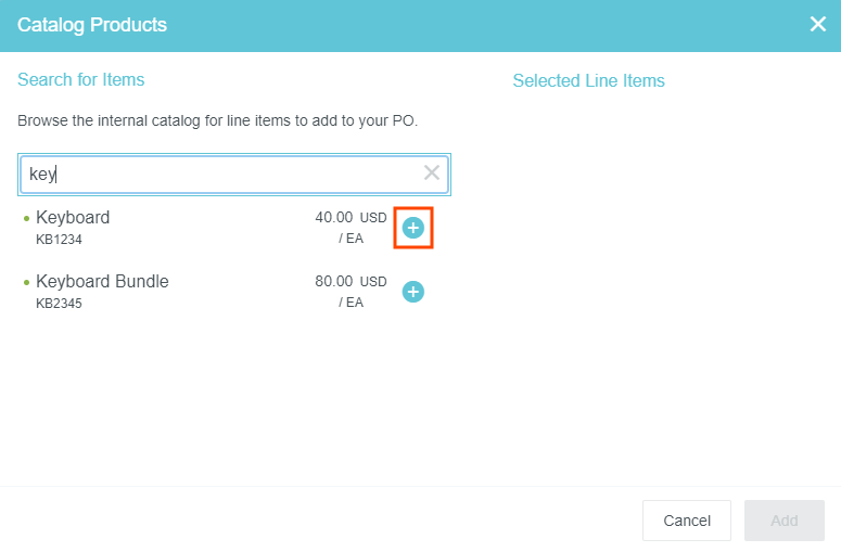 Produits du catalogue Si votre organisation a activé notre fonction Produits du catalogue, vous aurez la possibilité d’ajouter des éléments de ligne aux demandes de bons de commande en les sélectionnant à partir d’un catalogue interne. Les articles seront expédiés après l’approbation du bon de commande. Ajouter des produits du catalogue à un bon de commande [1] Créez un nouveau bon de commande de l’article que vous souhaitez acheter pour le fournisseur. [2] Cliquez sur AJOUTER UNE LIGNE et sélectionnez PRODIUT DU CATALOGUE dans la liste déroulante. [3] Utilisez la zone de recherche pour rechercher des articles. Vous ne pourrez voir que les articles du fournisseur que vous avez sélectionné. Cliquez sur le bouton « plus » bleu à côté de ce que vous souhaitez ajouter. [4] Une fois que vous avez ajouté tous les articles souhaités, vous pouvez ajuster les quantités et supprimer des articles, si nécessaire. Appuyez ensuite sur AJOUTER. 5. Remplissez les autres informations requises pour le bon de commande. Vous pouvez également modifier ou supprimer les articles que vous avez ajoutés. Cet article vous a-t-il été utile ? Oui Non