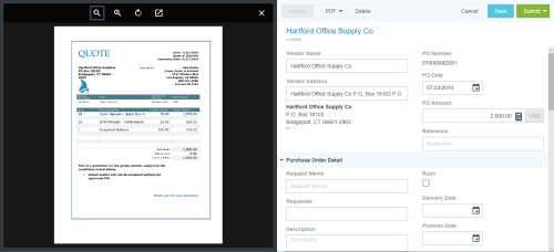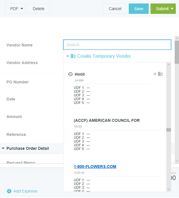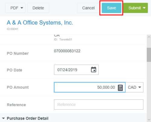 Créer un bon de commande Chaque bon de commande d'un fournisseur est enregistré dans un dossier unique. Dans le tableau de bord, cliquez sur le bouton +CRÉER du ruban Bons de commande. Vous pouvez également cliquer sur le bouton + dans le coin supérieur droit de la liste des ébauches de bons de commande. Joindre l'image Il peut être utile de téléverser d'abord une image du devis du fournisseur afin que toutes les informations que vous devez saisir s'affichent à côté de l'écran de saisie du bon de commande. Appuyez sur PARCOURIR LE FICHIER pour téléverser l'image du bon de commande. Sur les ordinateurs de bureau, vous pouvez simplement glisser-déposer l'image sur le volet « Purchase Entry » (Saisie d'achat) afin de la téléverser. L’image apparaîtra en dessous en mode vignette. Appuyez sur la vignette pour afficher l'image dans la boîte lumineuse. Sur les appareils avec écran large, la boîte lumineuse s'ouvre à la gauche de l'écran « PO Entry ». Sur les appareils avec petit écran, elle glisse dans l'écran « PO Entry ». Consultez Spécifications des images jointes aux factures pour obtenir de plus amples renseignements sur les types d'images qui peuvent être téléversées aux factures et aux bons de commande. Informations de l'en-tête du bon de commande Veuillez noter que les champs de l'écran de saisie du bon de commande de votre organisation peuvent varier. Nom du fournisseur : le nom du fournisseur peut être saisi de différentes manières. Commencez à taper le nom ou l'identifiant du fournisseur, puis sélectionnez-le dans la liste déroulante. Plus le nombre de caractères tapés est élevé, plus la liste des résultats est précise. Vous pouvez également faire défiler la liste complète. Les fournisseurs récemment utilisés apparaîtront en haut de la liste avec une icône d'horloge à gauche. Si vous ne trouvez pas le fournisseur ou s'il n'existe pas, cliquez sur le bouton CRÉER UN FOURNISSEUR TEMPORAIRE pour créer une demande de nouveau fournisseur temporaire. Consultez la section Créer un nouvel fournisseur temporaire pour obtenir de plus amples renseignements. Adresse du fournisseur : utilisez le menu déroulant de l'adresse pour sélectionner l'adresse du fournisseur à utiliser. Si un nouveau fournisseur temporaire a été créé, il n'est pas nécessaire de créer une adresse. Le spécialiste des fournisseurs de votre entreprise gérera les nouvelles informations sur les fournisseurs. Numéro du bon de commande :il sera généré automatiquement. Date du bon de commande Montant du bon de commande : saisissez le montant du bon de commande ou cliquez sur l'icône de calculatrice pour effectuer une addition, une soustraction, une multiplication ou une division. Remarque : sélectionnez la flèche qui pointe vers le haut dans le coin supérieur droit de la calculatrice pour afficher un ruban électronique des quatre dernières entrées. S’il y a plus que quatre entrées, utilisez la barre de défilement pour revoir et vérifier l’entrée de données. Cliquez la touche ENTRÉE pour additionner la dernière entrée et mettre à jour le champ du montant. Devise : les codes de devise sont automatiquement remplis dans ce champ selon l'adresse du fournisseur sélectionnée. Si nécessaire, sélectionnez le bon code à l'aide du menu déroulant. Le système met quotidiennement à jour le taux de change à partir de XE.com à minuit UTC et s'en sert pour fournir une estimation du taux de change selon la date du bon de commande. Référence : saisissez tout numéro de référence associé au bon de commande. Informations détaillées du bon de commande Veuillez noter que les champs de la section « Détail du bon de commande » de votre organisation peuvent varier. Note de service sur la demande : saisissez les informations qui apparaîtront dans l'avis de remise du chèque imprimé. Demandeur : utilisez le menu déroulant Demandeur pour sélectionner la personne qui a demandé les biens ou les services sur le bon de commande. Description : Le texte entré ici apparaîtra automatiquement dans chaque description de poste (où il peut être modifié s'il y a lieu). Urgent : cochez cette case si le traitement doit être accéléré. Date de livraison : date à laquelle les biens ou les services sont censés être livrés. Date promise : date à laquelle les marchandises seront expédiées. Date d'annulation : date limite de livraison des biens ou services. Adresse de livraison : l'adresse à laquelle les biens ou services doivent être livrés. Adresse de facturation : l'adresse à laquelle la facture doit être envoyée. À l'attention de : utilisez le menu déroulant pour sélectionner la personne à l'attention de qui s'adresse le bon de commande. Autorisé par : utilisez le menu déroulant pour sélectionner la personne qui a autorisé le bon de commande. Date de création : La date à laquelle le bon de commande a été créé. Nom du créateur : Le nom de la personne qui a créé le bon de commande. Modalités Votre organisation peut avoir des conditions générales standards qui doivent être jointes à l’en-tête ou aux articles sur un bon de commande. Pour les ajouter à l'en-tête, utilisez le menu déroulant de la section Modalités de l'écran de saisie du bon de commande pour sélectionner l'ensemble des modalités appropriées qui s'appliquent à l'ensemble du bon de commande. Pour ajouter des modalités à une ligne d'élément spécifique, cliquez sur le menu de la ligne et sélectionnez MODIFIER. Sélectionnez maintenant l'ensemble des modalités qui s'appliquent à cette ligne et cliquez sur le bouton vert ENREGISTRER. Commentaires L’onglet Commentaires vous permet de fournir des informations supplémentaires. Ces commentaires sont affichés en ordre chronologique. Saisissez votre commentaire dans la zone de texte et cliquez sur PUBLIER. Allocation - Informations sur les dépenses Cliquez sur AJOUTER DÉPENSE pour ajouter