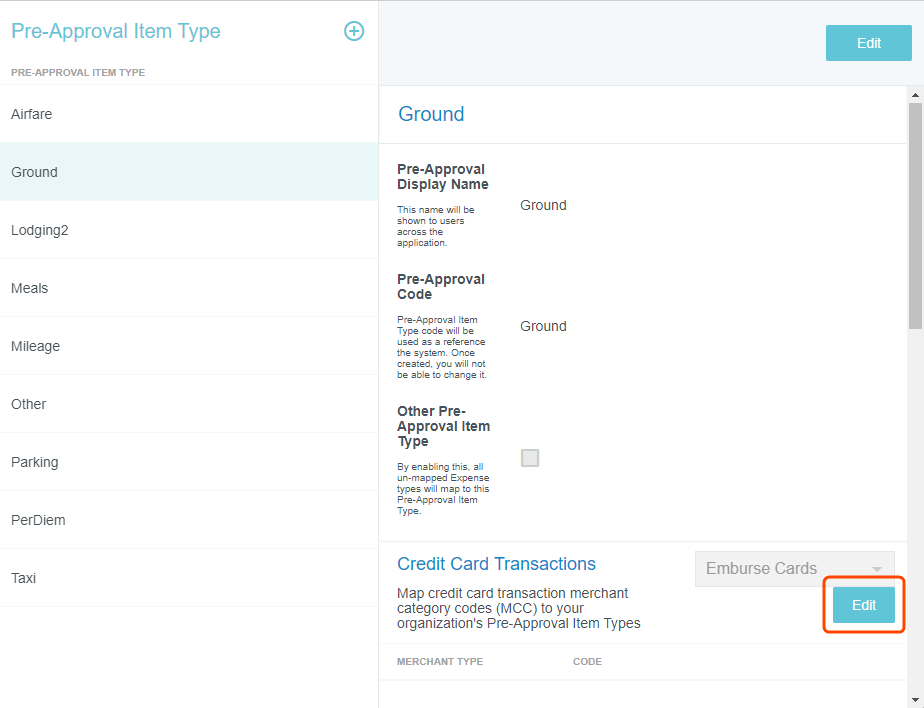 Écran d'administration du type d'élément de préapprobation L’écran d’administration des types d’éléments de préapprobation vous permet d’affecter des codes de coûts par défaut aux types d’éléments de préapprobation et de faire correspondre les codes de catégorie de restriction du marchand aux types de dépenses pour les cartes Emburse. Cliquez sur PARAMÈTRES ADMINISTRATEUR > DONNÉES DE RÉFÉRENCE > TYPE D’ÉLÉMENT DE PRÉAPPROBATION. Apercu du type d'élément de préapprobation Lorsque vous cliquez sur un type d'élément de préapprobation pour le visualiser, vous verrez le nom d'affichage, le code de préapprobation et si c'est ou non le type d'élément par défaut pour tous les types de dépenses non mis en correspondance. Modifier le type d'élément de préapprobation [1] Sélectionnez le type d'élément de préapprobation souhaité et cliquez sur MODIFIER. [2] Vous pouvez modifier ici le nom d'affichage du type d'élément de préapprobation. Le nouveau nom sera automatiquement mis à jour partout où il est référencé, y compris dans les autres écrans d'administration comme Mosaïques et tuiles& et Mosaïques et tuiles, et ce changement ne nécessitera pas de mise à jour de vos exportations ou de vos règles de gestion. Si vous souhaitez changer le nom sur la tuile correspondante du type d'élément de préapprobation dans l'interface utilisateur, vous devrez le faire sur l'écran d'administration Mosaïques et tuiles. Le code correspondant au type d'élément de préapprobation ne peut être modifié. [3] Cochez Autre type d'élément de préapprobation pour utiliser ce type d'élément par défaut pour tous les types de dépenses qui ne sont pas mis en correspondance. [4] Cliquez sur ENREGISTRER. Mappage des codes de catégorie de marchand pour les cartes Emburse Les clients qui tirent parti de Cartes Emburse peuvent contrôler les types de dépenses pour lesquelles les cartes peuvent être utilisées, en fonction de la catégorie de marchand. Lorsqu’une demande de carte a été approuvée, les utilisateurs ne pourront utiliser la carte que pour les types de dépenses qui relèvent des catégories de marchands sélectionnées. Les restrictions s’appliquent à l’ensemble de la préapprobation plutôt qu’aux montants des différentes lignes d’éléments. À l’heure actuelle, seules les cartes émises par Emburse Cards peuvent faire l’objet d’une restriction de catégorie de marchand. [1] Sélectionnez le type d’élément de préapprobation souhaité et, dans la section Transactions par carte de crédit, cliquez sur MODIFIER. [2] Utilisez le menu déroulant pour sélectionner un code de catégorie de marchand à associer à ce type d’élément de préapprobation. Vous pouvez ajouter plusieurs codes à un seul type d’article de préapprobation. [3] Lorsque vous aurez terminé, cliquez sur ENREGISTRER. Cet article vous a-t-il été utile ? Oui Non
