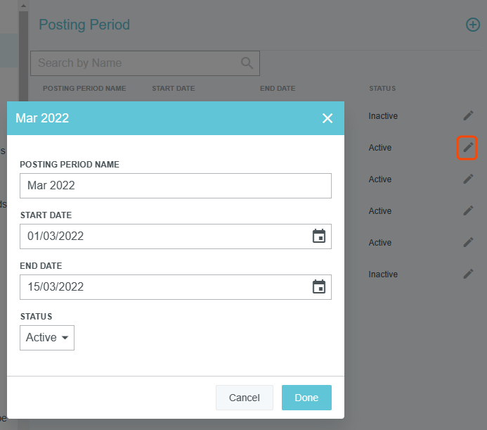 Écran d’administration de la période comptable Si votre entreprise a activé la fonction Période comptable d’Emburse Enterprise, cet écran vous permettra de créer, de modifier, d’activer et de désactiver les périodes comptables que les utilisateurs peuvent sélectionner lors de la création de nouvelles factures. « Période comptable » désigne la période pendant laquelle une transaction doit être enregistrée à des fins comptables. Cela peut correspondre à la période au cours de laquelle un achat a été initié, une transaction a été effectuée ou une commande a été exécutée, ou à toute autre période définie par votre organisation. Les périodes comptables peuvent être des mois, des trimestres, des années ou toute autre unité de temps. Cliquez sur PARAMÈTRES ADMINISTRATEUR > DONNÉES DE RÉFÉRENCE > PÉRIODE COMPTABLE. Créer une nouvelle période comptable Les périodes comptables doivent être nommées de manière unique et s’exclure mutuellement. Il n’est pas possible de créer une nouvelle période comptable portant le même nom qu’une période comptable existante ou dont les dates chevauchent celles d’une période comptable existante. 1. 1. Cliquez sur le signe + bleu dans le coin supérieur droit de l’écran d’administration. 2. 2. Donnez à la période un nom unique, des dates de début et de fin et, éventuellement, un code de référence allant jusqu’à 50 caractères. 3. 3. Réglez le menu déroulant Statut sur Actif et cliquez sur TERMINÉ. Modifier une période comptable Les périodes comptables doivent être nommées de manière unique et s’exclure mutuellement. Il n’est pas possible de modifier une période comptable si vous lui donnez le même nom qu’une période comptable existante ou si vous choisissez des dates qui chevauchent celles d’une période comptable existante. 1. 1. Cliquez sur l’icône du crayon gris à droite de la période comptable souhaitée. 2. 2. Effectuez les modifications souhaitées et cliquez sur TERMINÉ. Cet article vous a-t-il été utile ? Oui Non