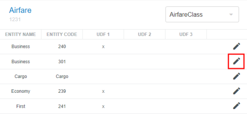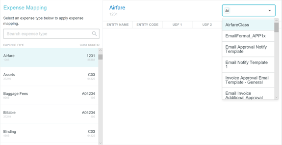 Administration de la mise en correspondance des dépenses L'écran Mise en correspondance des dépenses (mise en correspondance des dépenses) permet aux administrateurs d'afficher la mise en correspondance des types de dépenses aux codes de coût ou d'autres propriétés selon les entités (catégories). La configuration de ces mises en correspondance est généralement définie lors du déploiement initial d’Emburse Enterprise dans votre entreprise. Selon vos autorisations, vous pouvez être en mesure de modifier les champs définis par l'utilisateur, ou UDF, associés à ces entités. Afficher les types de dépenses et les entités 1. Cliquez sur PARAMÈTRES ADMINISTRATEUR > DONNÉES DE RÉFÉRENCE > MISE EN CORRESPONDANCE DES DÉPENSES. Vous verrez une liste des types de dépenses et les codes de coût associés. 2. Mettez en surbrillance un type de dépense, puis sélectionnez le type d’entité désiré dans la liste déroulante dans le coin supérieur droit. Vous pouvez commencer à taper le nom du type d’entité pour préciser les résultats de la recherche. 3. 3. Vous verrez une liste de toutes les entités associées au type d’entité sélectionné. Modifier les données des UDF de l’entité 1. Cliquez sur l’icône de crayon à droite du nom de l’entité. 2. Saisissez les données UDF souhaitées, puis cliquez sur ENREGISTRER. Cet article vous a-t-il été utile ? Oui Non