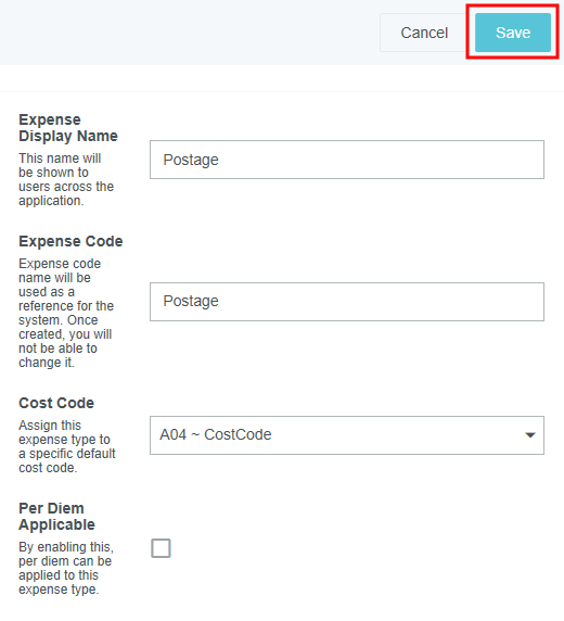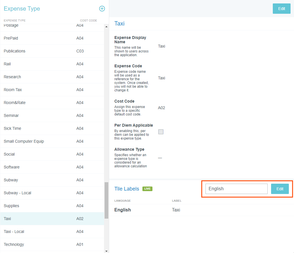 Administration des types de dépenses L’écran d’administration des types de dépenses vous permet de créer des types de dépenses et de leur affecter des codes de coûts par défaut. Pour configurer les codes de coûts, consultez Écran d’administration des codes de coût. Cliquez sur PARAMÈTRES ADMINISTRATEUR > DONNÉES DE RÉFÉRENCE > TYPE DE DÉPENSE. Voir le type de dépense Lorsque vous cliquez sur un type de dépense pour en avoir un aperçu, vous verrez le nom d’affichage, le code de la dépense, le code du coût et si une indemnité journalière peut ou non lui être appliquée. Vous verrez également l’étiquette de la tuile correspondante au type de dépenses, telle qu’elle apparaît dans les mosaïques de l’ensemble de modifications actuellement en direct. L’étiquette de la tuile sera affichée dans votre langue par défaut. Modifier le type de dépenses 1. Sélectionnez le type de dépenses souhaité et appuyez sur MODIFIER. 2. Vous pouvez changer le nom d’affichage du type de dépenses ici. Le nouveau nom sera automatiquement mis à jour partout où il est référencé, y compris dans les autres écrans d’administration comme Administration de la mise en correspondance des dépenses et Administration du suivi des rapports de dépenses, et ce changement ne nécessitera pas de mise à jour de vos exportations ou de vos règles de gestion. Pour changer le nom sur la tuile correspondante du type de dépenses dans l’interface utilisateur, consultez « Modifier l’étiquette de tuile » ci-dessous. Le code correspondant au type de dépenses ne peut pas être modifié. 3. Pour modifier le code de coût, utilisez la liste déroulante pour sélectionner le code de coût souhaité. 4. Cochez la case Indemnité journalière applicable pour permettre l’application d’une indemnité journalière à ce type de dépense. 5. S’il y a lieu, utilisez la liste déroulante Type d’allocation pour sélectionner le type de calcul de l’allocation pour lequel ce type de dépense peut être utilisé. 6. Cliquez sur ENREGISTRER. Modifier une étiquette de tuile Lorsque vous modifiez le nom de l’affichage des dépenses, vous devrez également modifier l’étiquette de tuile correspondante. Pour plus de détails sur les tuiles, consultez Mosaïques et tuiles. 1. Depuis l’écran Prévisualisation du type de dépenses, sélectionnez la langue désirée et appuyez sur MODIFIER. 2. Vous devrez sélectionner ou créer une nouvelle liste de modifications. Une liste de modifications n’est qu’un moyen d’apporter des modifications à l’interface utilisateur qui peuvent être suivies et facilement interchangées, si nécessaire. Vous pouvez sélectionner une liste de modifications existante (p. ex., une liste que vous avez déjà créée et contenant des modifications associées que vous souhaitez apporter) ou en créer une autre. Voir Créer et publier des listes de modifications pour plus de détails. 3. Saisissez le nom de la nouvelle étiquette, puis cliquez sur ENREGISTRER. Créer des types de dépenses L’utilisation de l’écran d’administration des types de dépenses pour créer un nouveau type de dépenses représente seulement la première étape du processus que vous devez suivre pour qu’il soit utilisable dans Emburse Enterprise. Le processus entier sera décrit ci-dessous. Cependant, la création d’un nouveau type de dépenses n’est pas toujours la meilleure façon d’atteindre votre objectif. Personnaliser vos règles de gestion à l’aide de Écran d’administration des règles de gestion est souvent une meilleure façon d’appliquer les politiques. Par exemple, votre organisation a un type de dépenses lié aux frais de téléphonie mobile, mais vous voulez faire une distinction entre les frais de téléphonie mobile faits par les membres de la haute direction comme le PDG et le directeur financier. Vous n’avez pas à créer un nouveau type de dépenses nommé « Frais de téléphonie mobile Haute direction » parce que tous les frais de téléphonie mobile sont semblables. Vous pouvez plutôt déclencher une règle selon le propriétaire de la dépense. Ou vous pourriez autoriser un certain montant de frais de téléphonie mobile selon le rôle de l’utilisateur au sein de l’entreprise. D’un autre côté, si vous avez présentement un type de dépenses Divers qui est beaucoup trop utilisé par vos employés, vous pourriez avoir besoin de créer des types de dépenses plus précis qu’ils devront utiliser, comme Frais d’affranchissement ou Fournitures de bureau. 1. Pour créer un nouveau type de dépenses, cliquez sur le signe « plus » bleu dans le coin supérieur droit de la liste de types de dépenses. 2. Saisissez les détails du nouveau type de dépenses. Nom d’affichage de dépense : ce que les utilisateurs verront dans l’application partout où cette dépense se trouve. Code de dépense : il s’agit du nom qui sera utilisé par le système en guise de référence. Il n’est pas nécessaire que ce soit le même que le nom d’affichage, mais il ne peut pas être modifié une fois le type de dépenses créé. Code de coût si vous voulez un code de coût précis attribué par défaut à ce type de dépenses dès qu’il est utilisé dans un rapport de dépenses, sélectionnez-le dans le menu déroulant. Indemnité journalière applicable : cochez cette case pour autoriser l’indemnité journalière pour ce type de dépenses. Cliquez sur ENREGISTRER. 3. Si vous souhaitez affecter automatiquement le nouveau type de dépenses à certaines catégories de dépenses (p. ex., cartes de crédit, voyage, préapprobations), rendez-vous à l’écran Attribuer des types de dépenses. 4. Vous devrez maintenant créer une tuile de type de dépenses sur laquelle les utilisateurs peuvent cliquer pour ajouter le type de dépenses à un rapport. Voir « Créer une nouvelle tuile » dans Mosaïques et tuiles pour plus de détails