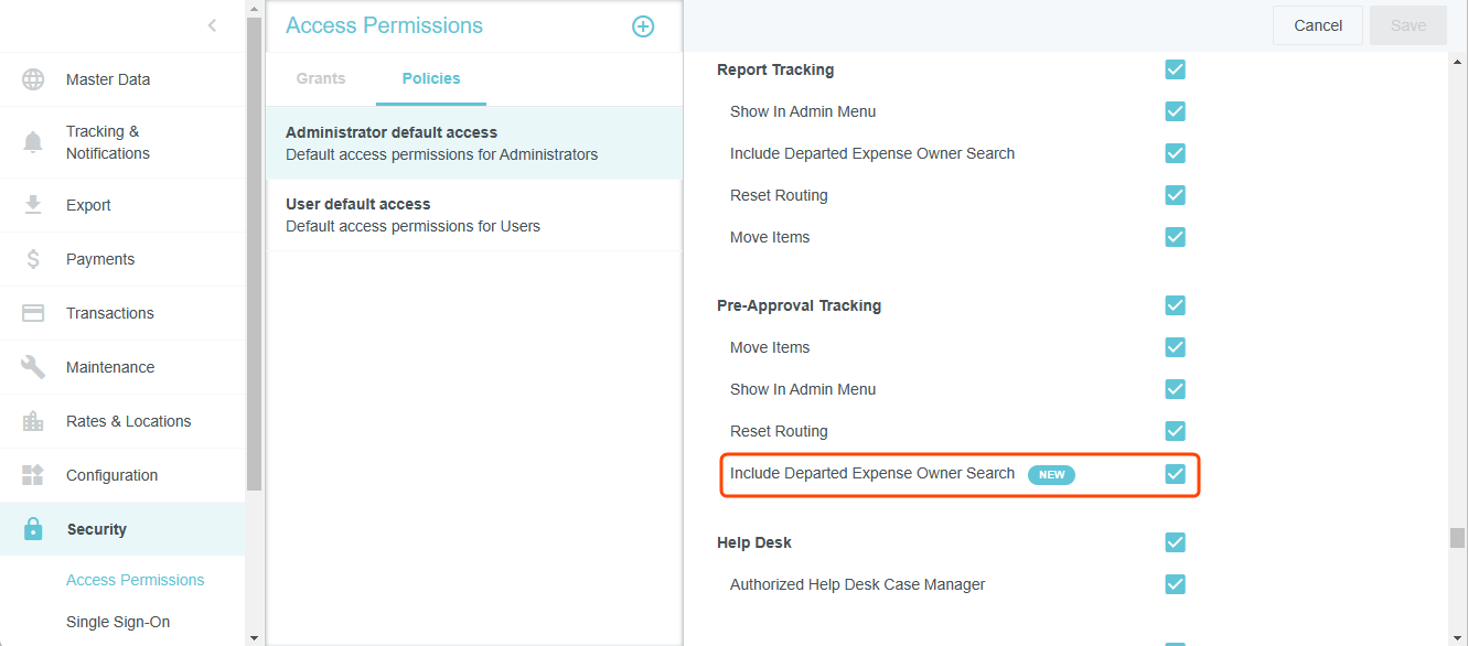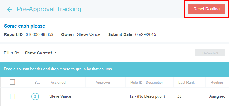 Administrateur de suivi des préapprobations Les utilisateurs ayant les privilèges d’administrateur peuvent utiliser l’écran de suivi des préapprobations pour savoir à quelle étape du processus de préapprobation se trouve une demande et pour consulter l’historique des changements apportés à cette demande. Cliquez sur PARAMÈTRES ADMINISTRATEUR > NOTIFICATIONS DE SUIVI > SUIVI DES PRÉAPPROBATIONS. Rechercher des demandes de préapprobation Il existe trois façons de rechercher des demandes de préapprobation soumises (les préapprobations non soumises ne peuvent pas être recherchées). Personne à rembourser : Personne à rembourser : affiche toutes les demandes de préapprobation soumises par l’utilisateur. ID du rapport : ID du rapport: affiche une demande de préapprobation en particulier. Approbateur : Approbateur : affiche toutes les demandes de préapprobation attribuées à une personne en particulier aux fins d’approbation. Utilisez le menu déroulant pour choisir de quelle façon vous allez mener la recherche. Pour les catégories Personne à rembourser et Approbateur, vous pouvez saisir le nom de la personne, en partie ou en entier. Cochez la case « Afficher les éléments en attente seulement » pour n’afficher que les demandes de préapprobation dont le statut est En attente (c’est-à-dire soumises, mais pas entièrement approuvées). Cliquez sur la demande de préapprobation souhaitée pour afficher plus de détails. Inclure les utilisateurs partis dans les recherches Les administrateurs disposant des autorisations appropriées peuvent activer une case Inclure les utilisateurs partis qui apparaîtra à côté du champ de recherche et permettra aux administrateurs d’inclure les préapprobations des utilisateurs partis lors de la recherche sur l’écran d’administration Suivi des préapprobations. Pour activer cette fonctionnalité, naviguez vers SÉCURITÉ > AUTORISATIONS D’ACCÈS > ADMINISTRATEUR et cliquez sur MODIFIER. Sous Suivi des préapprobations, cochez la case située à côté de « Inclure la recherche de la personne à rembourser partie » et cliquez sur ENREGISTRER. Afficher la demande de préapprobation Une fois la demande de préapprobation sélectionnée, vous verrez le statut de chaque poste. [1] RENSEIGNEMENTS SUR LA DEMANDE DE PRÉAPPROBATION ID du rapport : ID unique de la demande de préapprobation Personne à rembourser : Personne à rembourser : utilisateur à rembourser pour les dépenses prévues dans la demande de préapprobation. Date d'envoi : Date d’envoi : date d’envoi de la demande de préapprobation [2] Filtrer par Afficher les statuts actuels : Afficher les statuts actuels : affiche seulement le statut actuel de la demande de préapprobation. Si cet affichage est vide, la demande de préapprobation a franchi toutes les étapes du processus et a un statut Approuvé. Tout afficher : Tout afficher : affiche l’historique de routage de la demande de préapprobation. [3] En-têtes de colonnes et Grouper par Pour trier les résultats par en-tête de colonne, cliquez sur l’en-tête. Vous pouvez également faire glisser les en-têtes de colonnes dans la barre bleue pour regrouper les résultats en fonction de certains critères. Étape : L'ordre de routage de l'attribution de l'approbation. Attribué : Attribué : la personne ou le groupe de personnes désignées par l’entreprise pour examiner et approuver la demande de préapprobation. Approbateur : Approbateur : le nom de la personne ayant approuvé la demande de préapprobation à cette étape. ID de la règle – Description : Indique si une règle est associée à cette étape et donne une brève description de la règle. Dernier niveau : Le numéro de la dernière règle approuvée, tel que défini par les règles de routage propres à l'entreprise. Un « -1 » dans ce champ signifie que la demande de préapprobation n’avait pas de dernière règle approuvée à cette étape. Routage : L'état de routage de l'attribution d'approbation. Ligne : Indique l'ordre selon lequel les lignes d'éléments ont été ajoutées au rapport. Par exemple, si une dépense de stationnement a été ajoutée en troisième, elle occupera la ligne 3. Les lignes d'élément ajoutées comme dépenses d'hébergement sont numérotées X.1, X.2, etc. La variable X représente le numéro de ligne de la dépense d'hébergement. Date d'attribution : Date d’attribution : la date à laquelle la demande de préapprobation a été attribuée à cet approbateur. Approbation : La mesure prise par les approbateurs : Approuvée : Approuvée : la demande de préapprobation a été soit approuvée, soit approuvée et envoyée à un vérificateur supplémentaire. Renvoyée : Renvoyée : la dépense a été retournée à la personne à rembourser. [Vide] : [Vide] : en attente de l’approbation ou du renvoi de la demande de préapprobation par l’approbateur. Aucune action : Aucune action : la demande de préapprobation a été approuvée automatiquement ou a été réacheminée de façon manuelle au cours du processus de routage. No Action – Moved (NAM) [Aucune action – Déplacée (NAM)] : No Action – Moved (NAM) [Aucune action – Déplacée (NAM)] : la demande de préapprobation a été transférée à un autre approbateur par l’administrateur – à un délégué pour la période des vacances, par exemple. Date d'achèvement : Date de l'intervention de l'approbateur. Réinitialiser le routage de la préapprobation L’écran de suivi des préapprobations permet aux administrateurs d’accéder au bouton RÉINITIALISER LE ROUTAGE, change le statut d’une demande de préapprobation à ébauche et la renvoie à la liste de préapprobation de la personne à rembourser. Toute note dans l’en-tête ou sur les postes sera supprimée. Réattribuer des lignes d'éléments Vous pouvez choisir de réassigner un poste individuel de la demande de préapprobation à un approbateur différent 