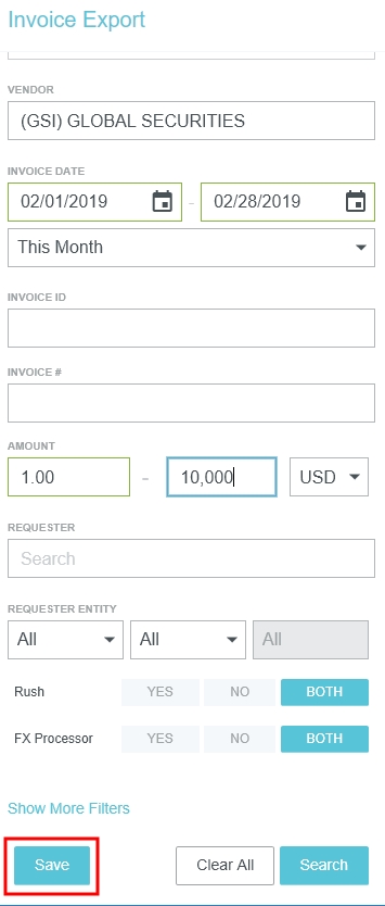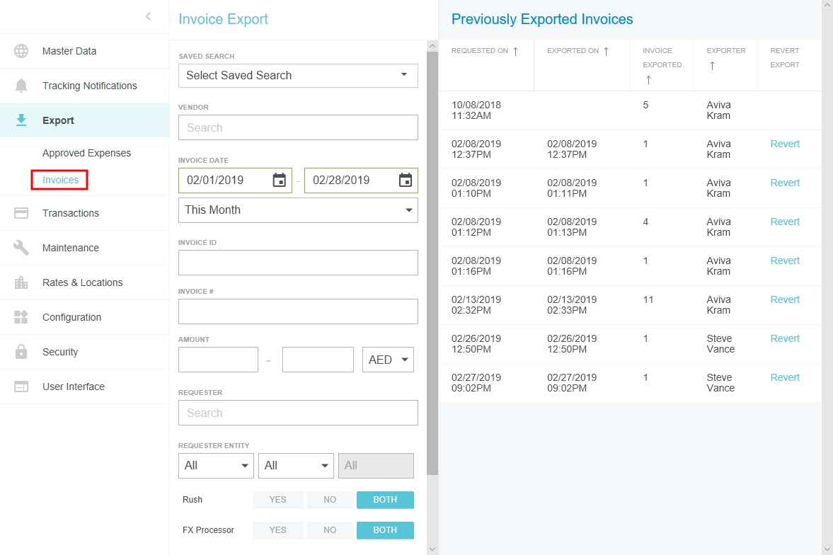 Exportation de la facture L'écran de gestion Exportation des factures affiche toutes les factures prêtes à être exportées vers le système comptable de votre entreprise. Le volet Factures précédemment exportées affiche le détail de ces factures, y compris la date de leur exportation. Cliquez sur PARAMÈTRES ADMINISTRATEUR > EXPORTER > FACTURES. Exportations précédentes Le volet de droite affiche une liste des exportations précédentes par ordre chronologique. Demandé le : La date à laquelle l’exportation a été lancée. Exporté le : La date à laquelle l’exportation s’est terminée. Facture exportée : Le nombre de factures dans l'exportation. Exportateur : La personne qui a lancé l’exportation Nombre de lignes d’éléments de dépenses exportées Exporter des factures Utilisez les critères de filtre pour rechercher les factures que vous souhaitez exporter. Vous pourrez les prévisualiser avant de cliquer sur EXPORTER. Afficher toutes les factures approuvées: Cliquez sur la liste déroulante Recherche enregistrée et sélectionnez TOUTES LES FACTURES APPROUVÉES. Cliquez ensuite sur RECHERCHER. Une fois les factures approuvées prêtes à être exportées, cliquez sur le bouton EXPORTER pour créer le fichier d’exportation de factures approuvées. Toutes les factures approuvées qui sont filtrées sur cet écran seront alors exportées dans le système comptable de votre entreprise. Remarque : Si vous utilisez un convertisseur de devises pour régler des factures à l'aide de devises étrangères, un fichier séparé sera créé lors de l'exportation. Recherche enregistrée Une fois que vous avez saisi les critères de filtre souhaités, cliquez sur ENREGISTRER pour créer une recherche enregistrée à utiliser à l’avenir. Donnez un nom à la recherche enregistrée et cliquez sur CRÉER. Pour lancer, modifier ou supprimer une recherche enregistrée, sélectionnez-la à partir de la liste déroulante. Rétablir l'exportation Le volet Factures précédemment exportées vous permet d'annuler une exportation dans son entièreté, ce qui fait passer l'état de chaque facture de « Exportée » à « Autorisée ». Pour revenir à l’état initial, recherchez l’exportation dans le volet Précédemment exporté et cliquez sur RÉTABLIR à l’état initial. Vous pouvez uniquement rétablir les exportations ayant eu lieu dans les 30 derniers jours. Cet article vous a-t-il été utile ? Oui Non