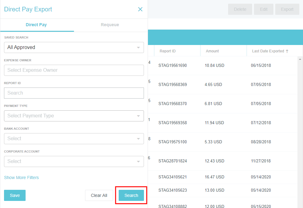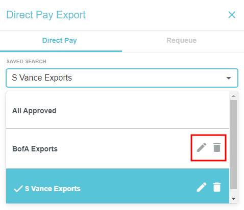 Exportations par PAIEMENT DIRECT La disponibilité de cette fonction dépend des règles de sécurité de votre entreprise. Seules les dépenses ayant fait l’objet d’une exportation régulière peuvent être exportées par PAIEMENT DIRECT (voir Exporter les dépenses approuvées pour plus d’informations). Il est possible d’exporter des rapports avec des valeurs de paiement négatives si la valeur totale de l’exportation est positive. Pour plus de détails sur PAIEMENT DIRECT, voir Cartes de crédit PAIEMENT DIRECT. Cliquez sur PARAMÈTRES ADMINISTRATEUR > PAIEMENTS > EXPORTATION PAR PAIEMENT DIRECT. Rechercher et filtrer les dépenses approuvées Si vous cliquez sur RECHERCHER sans sélectionner de critère de filtre, l’écran vous montrera toutes les dépenses qui ont été approuvées et exportées vers le système de comptabilité. Vous pouvez également filtrer les résultats afin de ne payer que certaines dépenses. Saisissez les critères que vous souhaitez utiliser pour créer votre filtre (par exemple, le responsable des dépenses, le type de paiement). Cliquez ensuite sur RECHERCHER. Pour enregistrer vos critères de filtre pour une utilisation future, cliquez sur ENREGISTRER avant de rechercher, puis cliquez sur COMMENCER UNE NOUVELLE RECHERCHE. Saisissez le nom de recherche souhaité et cliquez sur CRÉER. Votre recherche enregistrée sera disponible dans la liste déroulante RECHERCHE ENREGISTRÉE. Pour modifier ou supprimer une recherche enregistrée, sélectionnez-la dans la liste déroulante, puis cliquez sur l’icône crayon (à modifier) ou l’icône corbeille (à supprimer). Exporter les dépenses de PAIEMENT DIRECT approuvées La liste affiche les dépenses qui doivent être remboursées sur le compte bancaire du demandeur (ACH ou REIM) et les dépenses qui doivent être remboursées sur la carte de crédit de l’entreprise (AMEX). Sélectionnez la ou les dépenses de PAIEMENT DIRECT approuvées que vous souhaitez exporter. En bas de l’écran, vous verrez le nombre total de propriétaires de dépenses sélectionnés et des montants totaux distincts pour chaque type de paiement que vous êtes sur le point d’exporter. Cliquez sur EXPORTER dans le coin supérieur droit. Vous recevrez une confirmation par courriel. Les dépenses affichées en italique gris ne peuvent pas être soumises. Passez votre curseur sur la case à cocher de cette dépense pour afficher la raison. Si vous tentez d’exporter une dépense alors qu’aucun compte bancaire n’a été sélectionné, vous recevrez un message d’erreur. Consultez Modifier les comptes bancaires pour le remboursement des dépenses, ci-dessous. Modifier les comptes bancaires pour le remboursement des dépenses Vous pouvez sélectionner différents comptes bancaires de l’entreprise à partir desquels rembourser chaque dépense. Sélectionnez une dépense dans la liste et cliquez sur MODIFIER. Dans la fenêtre contextuelle, utilisez le menu déroulant pour sélectionner le compte bancaire à partir duquel payer cette dépense et cliquez sur MODIFIER. Supprimer les dépenses approuvées Pour les paiements effectués à l’extérieur de l’environnement Emburse Enterprise, vous pouvez retirer les dépenses approuvées d’une exportation. Remarque : Remarque : les paiements effectués avec Remboursements globaux alimentés par Wise ne peuvent pas être retirés d’une exportation. Vérifiez toutes les dépenses qui peuvent être retirées et cliquez sur SUPPRIMER en haut de l’écran. Dans la fenêtre contextuelle de confirmation, tapez « SUPPRIMER », puis cliquez sur SUPPRIMER. Télécharger les données d’exportation Pour télécharger une version .csv ou .xls de toutes les données sur l’écran Exportations de PAIEMENT DIRECT, cliquez sur TÉLÉCHARGER EN FORMAT et sélectionnez le type de fichier souhaité. Le fichier généré contiendra tous les éléments renvoyés par le filtre actuel à l’écran. Remettre en file d’attente des transactions de PAIEMENT DIRECT Lorsqu’un PAIEMENT DIRECT d’un utilisateur est retourné en raison d’un numéro de compte bancaire ou d’un numéro d’acheminement non valide, l’administrateur reçoit un courriel de notification contenant le(s) nom(s) du propriétaire des dépenses et l’ID de la demande d’exportation. L’administrateur contacte le responsable des dépenses pour l’informer de la mise à jour des informations bancaires. Ensuite, l’administrateur peut remettre en file d’attente la note de frais pour la prochaine exportation DIRECT PAY via l’écran Remettre en file d’attente des exportations DIRECT PAY d’Emburse Enterprise. Remarque : Remarque : les paiements effectués avec Remboursements globaux alimentés par Wise seront automatiquement remis en file d’attente s’ils sont renvoyés. Tout d’abord, cliquez sur l’onglet REMETTRE EN FILE D’ATTENTE. Saisissez l’ID Remettre en file d’attente dans la notification par courriel et sélectionnez le propriétaire de la dépense dans la liste déroulante, puis cliquez sur REMETTRE EN FILE D’ATTENTE. Vous pouvez également saisir l’ID de demande et le type de paiement, qui demanderont tous les paiements pour ce type. Cet article vous a-t-il été utile ? Oui Non