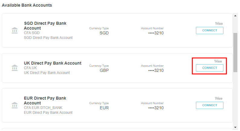 Gestion de compte L’écran Administration de la gestion des comptes vous permet de connecter un ou plusieurs comptes bancaires à Wise, le partenaire de paiement international d’Emburse Enterprise. Connecter un compte bancaire est la première étape pour permettre à votre organisation de traiter les remboursements internationaux. Consultez Remboursements globaux alimentés par Wise pour de plus amples renseignements sur les étapes supplémentaires. Cliquez sur PARAMÈTRES ADMINISTRATEUR > PAIEMENTS > GESTION DE COMPTE. Tous les comptes bancaires que votre entreprise a fournis à l’équipe de mise en œuvre d’Emburse Enterprise s’afficheront sur l’écran Gestion des comptes. Vous devez les connecter individuellement à Wise. Connecter un compte bancaire à Wise Chaque profil d’entreprise est lié à une entité juridique de l’entreprise. Par exemple, si votre organisation est basée aux États-Unis, mais fait des affaires au Royaume-Uni et en Australie, vous avez une entité commerciale différente pour chaque pays et devrez créer un profil pour chacun avec son propre compte bancaire. 1. Trouvez le compte bancaire souhaité et cliquez sur CONNECTER. 2. Vous serez redirigé vers l’écran de connexion Wise. Si votre organisation a déjà un compte Wise, entrez le courriel et le mot de passe associés et cliquez sur CONNEXION. Si votre organisation n’a pas encore de compte Wise, cliquez sur S’INSCRIRE. L’inscription à un compte Wise implique un processus de vérification en plusieurs étapes qui exige que vous fournissiez une preuve d’identité et d’adresse. Pour obtenir des renseignements sur les documents dont vous aurez besoin avant de commencer et sur la durée du processus de vérification, cliquez ici. Pour accéder à l’ensemble du Centre d’aide Wise, cliquez ici. Les écrans d’inscription que vous voyez varieront selon le pays et le secteur d’activité. Cependant, tous les clients devront indiquer le but de l’utilisation de Wise. Sélectionnez « Payer les fournisseurs/entrepreneurs/employés » dans le menu déroulant. 3. La vérification des comptes peut être instantanée ou prendre plusieurs jours. Une fois que vous possédez un compte Wise vérifié, vous pouvez vous connecter et lier votre profil professionnel au compte bancaire que vous avez sélectionné dans l’écran Gestion des comptes d’Emburse Enterprise. Sur l’écran de confirmation, cliquez sur DONNER ACCÈS. 4. Sur l’écran Gestion des comptes, ce compte bancaire affiche maintenant un bouton DÉCONNECTER rouge pour indiquer qu’il est lié. Vous pouvez maintenant créer des groupes de paiement pour ce compte bancaire à l’aide de l’écran Remboursements globaux alimentés par Wise et initier et suivre les remboursements à l’aide des informations à l’écran Remboursements globaux alimentés par Wise. Cet article vous a-t-il été utile ? Oui Non
