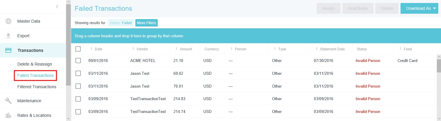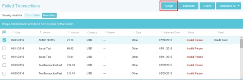 Transactions de déplacement échouées L'écran de gestion Transactions ratées vous permet de gérer les flux de cartes de crédit ayant échoué en raison d'identifiants d'employé inexacts. Vous pouvez utiliser l'écran pour assigner des transactions échouées aux utilisateurs appropriés. Ensuite, vous pourrez réactiver les transactions afin qu'elles puissent être acheminées vers les portefeuilles électroniques des utilisateurs. Vous pouvez également supprimer les transactions échouées. 1. Cliquez sur PARAMÈTRES ADMINISTRATEUR > TRANSACTIONS > TRANSACTIONS ÉCHOUÉES. 2. Sélectionnez la ou les transactions souhaitées et cliquez sur ATTRIBUER. 3. Recherchez l'utilisateur concerné, puis sélectionnez-le. 4. Cliquez maintenant sur RÉACTIVER pour envoyer la ou les transactions au portefeuille électronique de cet utilisateur. Les clients disposant de flux d’anciennes cartes de crédit (non PAFA/TFA) n’ont pas besoin de cliquer sur RÉACTIVER. L’attribution de la transaction entraînera son apparition dans le portefeuille électronique de l’utilisateur. Vous pouvez utiliser le bouton TÉLÉCHARGER EN FORMAT pour exporter tous les résultats obtenus dans l'affichage actuel. Cet article vous a-t-il été utile ? Oui Non