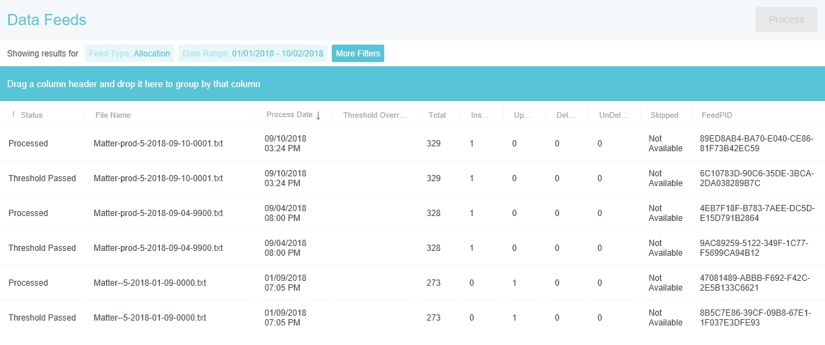 Écran d’administration des flux de données L’écran Administration des flux de données permet aux utilisateurs disposant des autorisations nécessaires d’afficher les détails des flux de données générés par le client et récemment traités dans Emburse Enterprise, et selon les paramètres de votre entreprise, de téléverser les flux de données Allocation, Entité et Personne. Les administrateurs peuvent également utiliser cet écran pour retraiter manuellement les flux de données dont l’état indique « Seuil non atteint ». Les flux de données générés par des entités externes, telles que les agences de voyages ou les cartes de crédit, ne peuvent pas être consultés ou traités de nouveau sur cet écran. Veillez à avoir souscrit aux notifications par e-mail pour chaque flux de données dans les environnements Production et AQ/UAT pour être averti si l’un d’eux échoue. Voir Écran d’administration des notifications pour plus d’informations. Pour de plus amples renseignements sur le formatage des flux de données, voir Spécifications du flux de données & FAQ. La première fois que vous chargez un nouveau flux de données dans le système, le processus peut échouer car il dépasse le nombre de modifications autorisées. Vous pouvez recommencer facilement le traitement en suivant les instructions de la rubrique Retraiter le flux de données en cas d’échec ci-dessous. Voir les détails sur le traitement de flux de données 1. Cliquez sur PARAMÈTRES ADMINISTRATEUR > MAINTENANCE > FLUX DE DONNÉES. 2. Sélectionnez le type de flux souhaité dans le menu déroulant, puis sélectionnez la plage de dates appropriée. Cliquez sur RECHERCHER. 3. Vous avez la possibilité de trier les résultats par chacun des en-têtes de colonne ou bien de regrouper les résultats en faisant glisser ces en-têtes vers la barre bleue. Retraiter le flux de données en cas d’échec Les flux de données dont l’état est « Seuil non atteint » peuvent être retraités, pourvu que le fichier de flux soit toujours à l’état « Failed ». 1. Sélectionnez le flux dans la liste et cliquez sur PROCESSUS dans le coin supérieur droit. Les limites de seuil seront alors remplacées et le fichier sera de nouveau traité. 2. Si le bouton TRAITER est grisé, le fichier a déjà été retraité. Notifications par e-mail d’erreur et de confirmation de flux de données Le système générera des e-mails de confirmation pour les flux de données réussis et des e-mails d’erreur lorsqu’un flux n’est pas traité. Ces notifications sont envoyées à l’utilisateur ou aux utilisateurs indiqué(s) pour chaque flux dans la section Notifications par lots de l’écran d’administration Notifications. Souvent, lorsque l’utilisateur qui était initialement configuré pour recevoir ces e-mails quitte une organisation, aucun utilisateur de remplacement n’est ajouté. Un administrateur disposant des autorisations appropriées peut utiliser l’écran d’administration Notifications pour attribuer les notifications à un nouvel utilisateur. Vous trouverez ci-dessous des exemples d’e-mails de confirmation et d’erreur. Exemple d’e-mail de confirmation du traitement d’un flux de données de dossier À : vous@votrecompagnie.com De : batch-notify@chromeriver.com Objet : Confirmation de flux de dossiers Emburse Enterprise Le flux de dossier a été traité avec succès. Code de client : AAAA État du client : ACTIF Fichier : Fichier : Matter-prod-AAAA-2009-11-11-1111.txt Ajouts : 204 Mises à jour : 150 Suppressions : 0 Suppressions annulées : 0 Nombre total de dossiers dans le système : 1954 Ajouts de dossiers : 10,44 % Mises à jour de dossiers : 7,68 % Suppressions de dossiers : 0.00 % Suppressions de dossiers annulées : 0.00 % Nombre de fichiers problématiques : 0 Exemple d’e-mail d’erreur de flux de données des dossiers Si un flux ne respecte pas le seuil de validation (un pourcentage donné d’éléments mis à jour, ajoutés ou supprimés), l’administrateur du client reçoit une notification par e-mail l’avertissant que le flux n’a pas été traité. Vous trouverez ci-dessous un exemple d’e-mail indiquant qu’un flux de données de dossier n’a pas pu être traité. Le système générera des notifications par e-mail similaires pour les flux de personnes et d’entités. À : vous@votrecompagnie.com De : batch-notify@chromeriver.com Objet : Erreur de flux de dossiers Emburse Enterprise Le flux de dossier n’a pas été traité. Code de client : AAAA État du client : ACTIF Fichier : Fichier : Matter-prod-AAAA-2009-11-24-0102.txt Ajouts : 0 Mises à jour : 7425 Suppressions : 0 Suppressions annulées : 0 Nombre total de dossiers dans le système : 11 202 Ajouts de dossiers : 0.00 % Mises à jour de dossiers : 66,28 % Charger les flux de données Allocation, Entité ou Personne Pour les clients qui ont configuré le processus de flux de données générique Emburse Enterprise, les utilisateurs disposant des autorisations nécessaires peuvent téléverser les flux de données Allocation, Entité et Personne directement à partir de l’écran Administration des flux de données. Si vous ne savez pas si le processus de flux de données générique est configuré dans votre entreprise ou si vous souhaitez le configurer, contactez-nous via le Service d’assistance. Activer les autorisations de chargement 1. Dans le menu Administrateur, cliquez sur SÉCURITÉ, puis AUTORISATIONS D’ACCÈS. Sélectionnez la politique appropriée, et cliquez sur MODIFIER. 2. Sous Admin > Flux de données, cochez la case à côté de « Charger le flux Allocation », « Charger le flux Entité » et/ou « Charger le flux Personne », le cas échéant. Chargement des flux 1. Sélectionnez le type de flux Allocation, Entité ou Personne dans la liste déroulante, puis cliquez sur CHARGER . 2. Sur l’écran Chargement des flux de données, sélectionnez le type de flux de donn