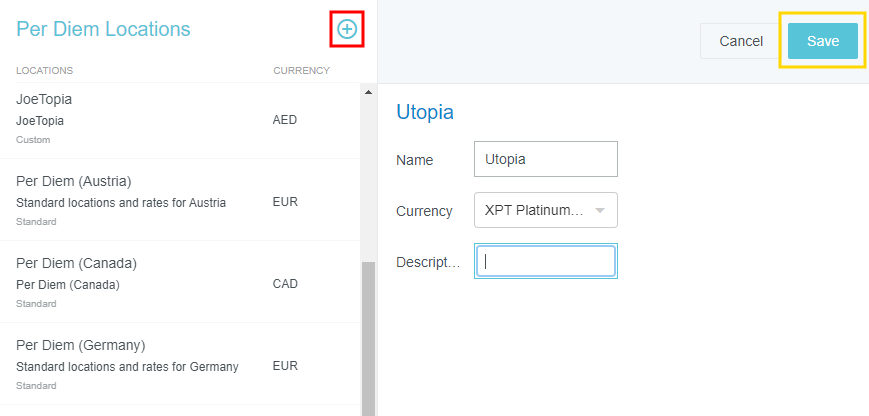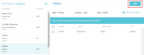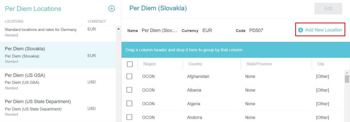 Emplacements d’indemnités journalières Certaines entreprises accordent à leurs employés un montant fixe par jour couvrant les frais de séjour et de déplacement reliés à leur travail. Cette somme diffère selon les endroits et est régie par des directives gouvernementales. L’écran Emplacements d’indemnités journalières permet à l’administrateur de gérer les pays et les villes associés aux taux d’indemnités journalières. Afficher les emplacements d’indemnités journalières [1] Cliquez sur PARAMÈTRES ADMINISTRATEUR > TAUX ET RÉGIONS > EMPLACEMENTS D'INDEMNITÉS JOURNALIÈRES. La liste Emplacements d’indemnités journalières contient des ensembles prédéfinis d’emplacements. Chaque ensemble est étiqueté « Standard » ou « Personnalisé ». Norme : Ces taux sont fixés par le gouvernement pour chaque pays. Vous pouvez ajouter une ville à un ensemble standard d’emplacements. Pour ajouter un pays entier, vous devrez créer un ensemble personnalisé d’emplacements. Consultez Créer des ensembles personnalisés d’emplacements d’indemnités journalières, ci-dessous. Personnalisé : Il s’agit de tarifs créés par votre organisation. Vous pouvez ajouter des pays et des villes à des ensembles d’emplacements personnalisés. [2] Cliquez sur un ensemble pour afficher ses pays et/ou ses villes. [3] Pour modifier les tarifs associés aux emplacements de la liste, reportez-vous à la sectionTaux d’indemnité journalière. Ajouter de nouvelles villes aux ensembles d’emplacements d’indemnités journalières standards Vous pouvez ajouter de nouvelles villes aux ensembles standards d’emplacements d’indemnités journalières. Pour ajouter un pays entier, voir « Créer des ensembles personnalisés d’emplacements d’indemnités journalières » ci-dessous. [1] Sélectionnez l’emplacement standard défini dans la liste et cliquez sur AJOUTER UN NOUVEL EMPLACEMENT. [2] Sélectionnez le pays, l’État/la province (le cas échéant) et le comté (le cas échéant), puis saisissez le nom de la ville. Cliquez sur AJOUTER. Une seule ville peut être ajoutée à la fois. [3] La ville sera automatiquement créée avec un taux de 0,00. Utilisez l’écran de gestion Taux d’indemnité journalière pour l’ajuster. Créer des ensembles personnalisés d’emplacements d’indemnités journalières La création d’un ensemble personnalisé d’emplacements d’indemnités journalières vous permet d’ajouter un pays entier et toutes ses villes à la fois. [1] Cliquez sur le bouton bleu plus, saisissez le nom du nouvel ensemble d’emplacements, sélectionnez la devise et, si vous le souhaitez, ajoutez une description. Cliquez sur ENREGISTRER. [2] Cliquez maintenant sur AJOUTER UN NOUVEL EMPLACEMENT pour ajouter un pays à l’ensemble d’emplacements d’indemnités journalières. [3] Sélectionnez le pays et cliquez sur AJOUTER. [4] Notez que toutes les villes de ce pays auront un taux par défaut de 0,00. Utilisez l’écran Taux d’indemnité journalière pour ajuster les taux si nécessaire. Modifier les ensembles personnalisés d’emplacements d’indemnités journalières Vous pouvez modifier le nom, la devise et la description d’un ensemble personnalisé d’emplacements d’indemnités journalières. Les ensembles d’emplacements d’indemnités journalières standards ne sont pas modifiables. [1] Sélectionnez l’emplacement souhaité et cliquez sur MODIFIER. [2] Effectuez les modifications souhaitées et cliquez sur ENREGISTRER. Notez que le code ne peut pas être modifié. Cet article vous a-t-il été utile ? Oui Non
