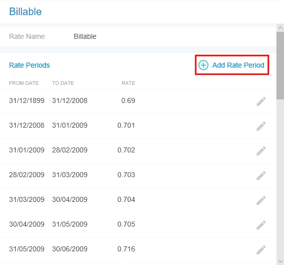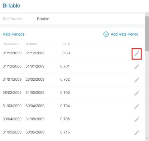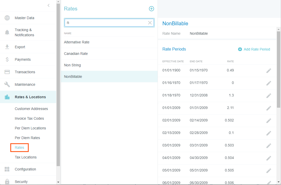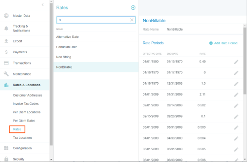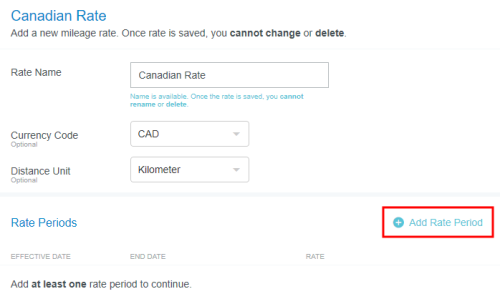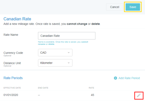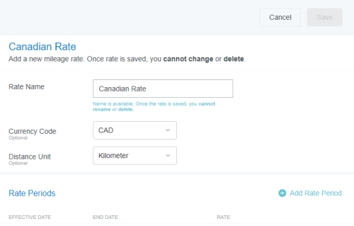 Écran d'administration des taux Le montant du remboursement pour le kilométrage et les autres types de dépenses qui utilisent les taux variera selon le pays et la date. Ces taux doivent être mis à jour annuellement par votre organisation. Vous pouvez utiliser l’écran Administration des taux pour ajouter et modifier les taux avec les délais correspondants, en fonction de ceux fixés par le gouvernement de chaque pays. Les clients étatsuniens peuvent consulter les tarifs actuels sur le site Web de l’IRS. Pour modifier un tarif ou créer un nouveau tarif, voir ci-dessous. Pour modifier les noms des taux ou supprimer des taux, contactez-nous via le Service d’assistance. Pour accéder à l’écran, cliquez sur PARAMÈTRES ADMINISTRATEUR > TAUX & RÉGIONS > TAUX. Utilisez la zone de recherche en haut de la liste pour effectuer une recherche pour un taux spécifique par nom. Créer une période de nouveau taux S'il est prévu qu'un taux change dans le futur, vous pouvez ajouter la période de ce nouveau taux à l'aide de cet écran. La date de fin de la période de taux précédente sera automatiquement fixée à la veille du jour de l’entrée en vigueur du nouveau taux ; il n'est pas nécessaire de modifier la date de fin de l’ancien tarif. 1. Cliquez sur AJOUTER UNE PÉRIODE DE TAUX. 2. Entrez la date de début (la date d'entrée en vigueur du nouveau taux) et le taux. La Date de fin est fixée automatiquement pour vous. Appuyez ensuite sur ENREGISTRER. Créer un taux 1. Cliquez sur le bouton bleu plus pour ajouter un nouveau tarif. 2. Donnez un nom à votre nouveau taux. Le nom ne peut pas être le même que celui d'un taux existant. Il ne peut pas non plus être modifié ou supprimé une fois sauvegardé. Si vous le souhaitez, vous pouvez définir un code de devise et/ou une unité de distance pour le taux. 3. Cliquez maintenant sur AJOUTER UNE PÉRIODE DE TAUX pour définir la période pendant laquelle le taux sera valide. 4. Sélectionnez Date d'entrée en vigueur pour configurer le jour où le taux sera désormais en vigueur. Saisissez ensuite le montant du taux et cliquez sur ENREGISTRER. 5. Vous pouvez cliquer sur l’icône de crayon pour apporter des modifications, si nécessaire. 6. Lorsque vous avez terminé, cliquez sur ENREGISTRER. Vous devrez confirmer que vous voulez bien enregistrer le taux. Cliquez sur OK. Modifier un taux 1. Cliquez sur l’icône de crayon à droite du taux que vous souhaitez modifier. 2. Notez que vous ne pouvez modifier que le taux, pas son nom ni ses dates. Cliquez sur ENREGISTRER. Cet article vous a-t-il été utile ? Oui Non