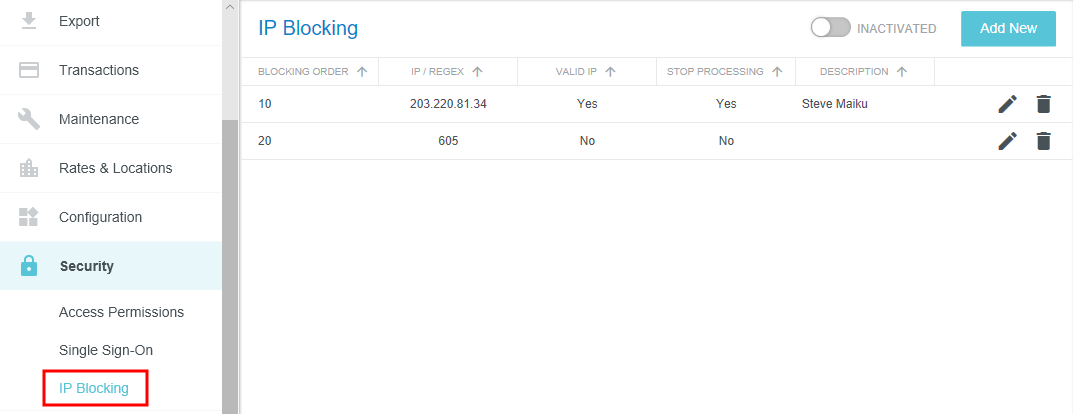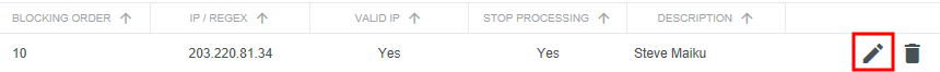 Blocage d'adresses IP L’outil de blocage d'adresses IP limite la connexion entre l’application Emburse Enterprise et certaines adresses IP pour empêcher les connexions non autorisées (p. ex. les ordinateurs qui sont en- dehors du réseau de votre entreprise) vers l’application. Il se peut que vous deviez contacter votre administrateur de réseau pour vous aider à identifier les adresses IP de votre entreprise. L’écran d’administration IP Blocking (blocage des adresses IP) vous permet d’activer ou de désactiver la fonctionnalité de blocage des adresses IP et d’ajouter, de modifier et de supprimer des adresses IP. 1. Cliquez sur le bouton MENU dans le coin supérieur gauche, puis sur PARAMÈTRES ADMINISTRATEUR. 2. Cliquez sur SÉCURITÉ > BLOCAGE D’ADRESSES IP. Activer ou désactiver le blocage d'adresses IP Cliquez sur la bascule ACTIVÉE/INACTIVÉE pour désactiver ou activer le blocage IP. Créer un nouveau blocage des adresses IP Cliquez sur AJOUTER NOUVEAU, remplissez les informations pour l’adresse IP et cliquez sur ENREGISTRER. Ordre de blocage : l’ordre dans lequel les adresses IP apparaissent sur l’écran de blocage des adresses IP est l’ordre dans lequel ils sont vérifiés. Vous pouvez utiliser le même numéro d'ordre de blocage pour plusieurs adresses IP ou expressions rationnelles pour leur donner la même signification dans l’ordre. Le nombre le plus bas disponible est 0. Par exemple, une adresse IP avec un ordre de tri de 10 sera vérifiée avant une adresse IP avec un ordre de tri de 100. Adresse IP/Expression rationnelle : entrez une adresse IP (par exemple, 76.95.45.136) ou une expression rationnelle (« Regex ») qui correspond à une plage d’adresses IP (par exemple, ^126.44.27.(5[8-9]|6[0-4])$). IP valide: Cliquez sur OUI si vous souhaitez autoriser l’adresse IP/Regex ou l’adresse IP partielle/Regex dans la case IP/Regex à accéder à Emburse Enterprise. Cliquez sur NON pour le bloquer. Arrêter le traitement: Si vous cliquez sur OUI, aucune autre entrée IP/Regex ne sera vérifiée. Si vous cliquez sur NON, le système continuera de vérifier les numéros suivants dans la séquence et d’autoriser ceux qui sont valides. Cela permet au système de bloquer toutes les adresses IP qui contiennent une certaine valeur, mais autorise tout de même l’accès à des adresses IP spécifiées qui contiennent également cette valeur. Description : indique une description de l’entrée. Modifier ou supprimer un blocage d'adresses IP Pour modifier, cliquez sur l’icône de crayon à côté du blocage IP souhaité. Pour supprimer, cliquez sur l’icône de la poubelle. Cet article vous a-t-il été utile ? Oui Non