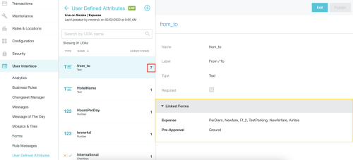 Administration des attributs définis par l’utilisateur L’écran d’administration des attributs définis par l’utilisateur (ADU) vous permet de créer et de mettre à jour facilement des champs personnalisés, ou des attributs de données, que vous pouvez mettre sur des formulaires pour recueillir les informations requises pour votre organisation. il est fortement recommandé de créer et de tester des changements dans l’environnement d’AQ, puis d’utiliser la publication d’environnements croisés pour promouvoir les changements à la production. Consultez « Publication croisée de listes de modifications entre environnements » dans Créer et publier des listes de modifications pour obtenir des renseignements détaillés. Afficher les ADU 1. Cliquez sur PARAMÈTRES D’ADMINISTRATEUR > INTERFACE UTILISATEUR > ATTRIBUTS DÉFINIS PAR L’UTILISATEUR. 2. Sélectionnez le jeu de modifications que vous souhaitez utiliser. Si un jeu de modifications n’existe pas, vous pouvez sélectionner la production en temps réel (ou AQ) et cliquer sur VOIR. Une liste de modifications n’est qu’un moyen d’apporter des modifications à l’interface utilisateur qui peuvent être suivies et facilement interchangées, si nécessaire. Vous pouvez sélectionner une liste de modifications existante (p. ex., une liste que vous avez déjà créée et contenant des modifications associées que vous souhaitez apporter) ou en créer une autre. Voir Créer et publier des listes de modifications pour plus de détails. 3. Vous verrez une liste de tous les ADU définis pour votre organisation. Le numéro sur la droite indique le nombre total de dépenses et de formulaires de préapprobation liés à cet Attribut défini par l’utilisateur. Cliquez sur un ADU pour afficher ses détails. Cliquez sur les FORMULAIRES LIÉS pour afficher tous les formulaires de dépenses et de préapprobation qui utilisent cet Attribut défini par l’utilisateur et seront affectés par toutes les modifications apportées à celui-ci. Créer un nouvel ADU 1. Cliquez sur le signe plus bleu en haut de la liste Attributs définis par l’utilisateur. 2. Si vous n’êtes pas dans un jeu de modifications, vous serez invité à sélectionner un jeu de modifications ou à en créer un nouveau. 3. Saisissez les détails du nouvel ADU. Nom : le nom de système unique pour l’ADU. Le nom doit commencer par une lettre et ne contenir que des caractères alphanumériques ou des traits de soulignement. Les espaces ne sont pas autorisés. Étiquette : le nom d’affichage que les utilisateurs verront dans l’interface. L’étiquette doit être un mot ou une expression qui aidera les utilisateurs à comprendre l’information qu’on leur demande de fournir. Type : utilisez la liste déroulante pour sélectionner le type d’ADU que vous souhaitez créer : Case à cocher : affiche une case à cocher et stocke la valeur comme 1 (coché) ou 0 (décoché). Format : précisez si l’étiquette sera affichée avant ou après la case à cocher. La meilleure pratique consiste à placer l’étiquette avant la case à cocher. Devise : affiche un champ de montant avec le même format que la devise du montant dépensé. L’entrée doit être numérique. Date : affiche un champ dans lequel une date peut être saisie manuellement ou sélectionnée dans un calendrier. Entité : affiche une liste déroulante ou consultable, en fonction du type d’entité associé, et stocke le code d’entité de l’entité sélectionnée. Pour plus de détails, voir « Propriétés de l’ADU de l’entité » ci-dessous. Nombre : affiche un champ numérique. L’entrée doit être numérique. Précision : précisez le nombre de décimales pour l’ADU, de 0 à 5. Texte : affiche un champ de texte. L’entrée peut être des caractères alphanumériques ou spéciaux. Requis : cochez cette case pour que l’ADU devienne un champ obligatoire sur chaque formulaire dans lequel il apparaît. Pour plus de flexibilité, ne cochez pas la case Requis et utilisez l’écran Administration de formulaires pour sélectionner si l’ADU est requis ou facultatif sur chaque formulaire. Message de validation : si vous cochez REQUIS, vous serez invité à fournir un message de validation facultatif. Il sera affiché en rouge sous l’ADU lorsque l’utilisateur tentera d’enregistrer le formulaire sans saisir de valeur dans l’ADU. Propriétés de l’ADU de l’entité Les ADU d’entité sont des champs de type liste déroulante ou de type liste de recherche. Lorsque vous créez un ADU d’entité, il vous sera demandé de le lier à un type d’entité spécifique qui contient la liste des valeurs parmi lesquelles les utilisateurs peuvent sélectionner. Pour savoir comment créer un type d’entité et définir ses valeurs, consultez Écran d’administration des entités. Les ADU d’entités ont un certain nombre de propriétés supplémentaires, qui sont décrites ci-dessous. Il est recommandé de discuter avec le consultant en mise en œuvre d’Emburse Enterprise de votre entreprise avant de configurer les propriétés plus avancées des attributs définis par l’utilisateur d’entités. Type d’entité Le type d’entité identifie la liste des valeurs disponibles pour la sélection. Non consultable : une liste déroulante de valeurs s’affiche lorsque les utilisateurs cliquent sur le champ, et ils ne seront autorisés à sélectionner que dans cette liste. Recherche : lorsque les utilisateurs tapent dans le champ, sa liste déroulante change pour afficher le sous-ensemble de valeurs correspondant à la chaîne de recherche saisie. Les ADU d’entités consultables sont généralement utilisés lorsque la liste de valeurs est assez longue. Propriétés de la liste recherchable Afficher les données supplémentaires 1 : ajoute la valeur Données supplémentaires 1 de l’entité devant le nom de l’entité (ou Données supplémentaires 2) lorsqu’elle est af