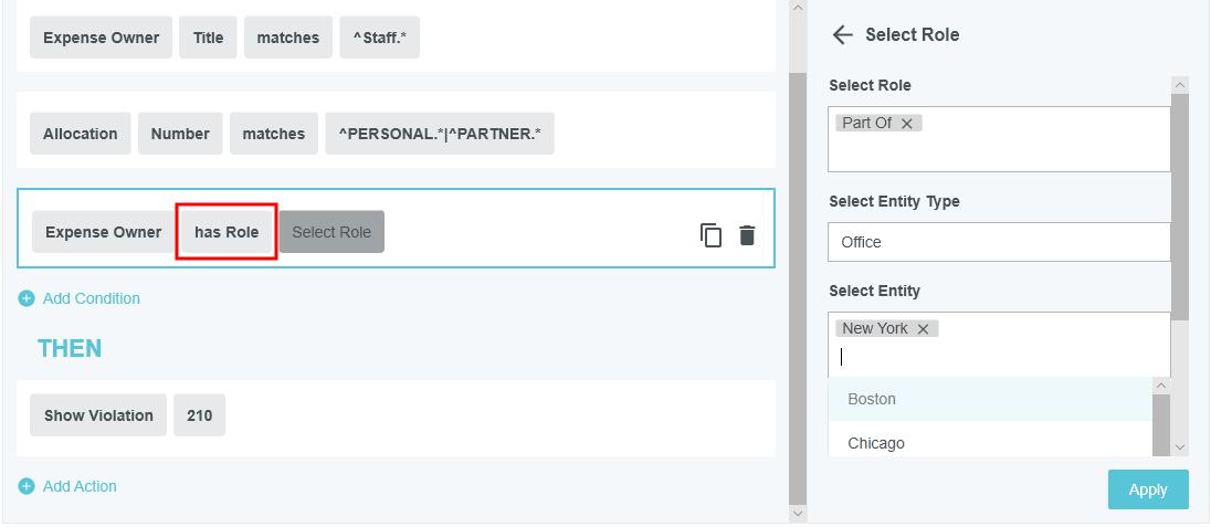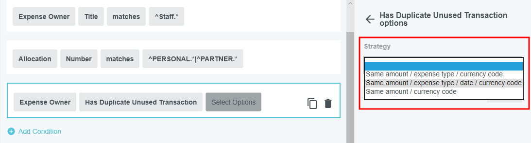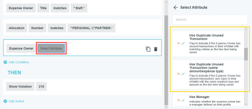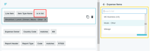 Théorie des règles de gestion Bien que la rubrique Écran d’administration des règles de gestion couvre les mécanismes de visualisation, d'édition, d'ajout, de clonage, de suppression et de désactivation des règles par le biais de l'écran d'administration Règles de gestion, cette rubrique vous donnera un aperçu du fonctionnement des règles de gestion ainsi que les meilleures pratiques pour créer des règles de gestion efficaces. Pour consulter la liste des attributs les plus populaires et de leurs fonctions, consultez Attributs du Générateur de règles. Vue d'ensemble Dans l’application Emburse Enterprise, les règles de gestion sont minutieusement utilisées pour mettre en place des politiques et des contrôles correspondant sur mesure aux besoins de votre entreprise. Une grande variété de règles sont sollicitées à différents niveaux de l’application. L'écran Administration des règles de gestion vous permet de créer et de gérer les règles personnalisées Emburse Enterprise de votre entreprise. Les règles de gestion sont le reflet des procédures au sein des affaires de votre organisation : lorsque vos procédures changent, les règles doivent être mises à jour. Pour Emburse Expense Enterprise, certaines des règles de gestion les plus communes sont les suivantes : Compliance : ce rapport repère tous les avertissements de conformité émis pour les factures. Conformité : s'exécute lorsque vous enregistrez une ligne d'élément et renforcez des politiques pour une ligne d'élément précise. Présenter les rapports de conformité : s'exécute lorsque vous soumettez un rapport de dépenses et renforcez des politiques pour un rapport de dépenses au complet. Routage d’approbation Routage d'approbation : fonction permettant de diriger les rapports de dépenses au sein de votre organisation pour approbation. Les modules Pre-Approval, Invoice et PO d'Emburse Enterprise possèdent chacun leurs propres variantes de ces règles de base. En ce moment, l’écran d’administration des règles de gestion supporte les types de règles suivantes : Conformité du poste de dépense Conformité de la soumission des dépenses Routage de l’approbation des dépenses Conformité de la soumission des préapprobations Routage des préapprobations Pour créer et gérer d’autres types de règles, vous devez continuer à travailler avec l’équipe de configuration d’Emburse Enterprise en communiquant avec le Service d’assistance. Exemple de règle Chaque règle de gestion (indépendamment du genre de règle) possède le même format : SI PUIS Un exemple de règle pourrait être : SI LigneD'élément TypeDépenses = Tarifs aériens ET LigneD'élément MontantDépensé > 3000 $ PUIS Afficher l'avertissement (Code de message 205) Les règles de gestion peuvent contenir plusieurs conditions, et chacune des conditions doivent être remplies pour que la règle soit sollicitée. Paramètres de règle de conformité des lignes d'éléments de dépenses Les règles de conformité des lignes des postes de dépenses ont accès aux informations suivantes pour la partie SI (CONDITIONS) de la règle : Personne à rembourser : Personne à rembourser : n'importe quel attribut de la personne à rembourser, incluant les attributs de relation qui peuvent être attribués à l'utilisateur (p. ex., une partie de / bureau / New York). a) Vers titre du rapport de dépenses Titre du rapport de dépenses : n'importe quel attribut de l'en-tête, incluant tout attribut personnalisé défini par l'utilisateur pour l'en-tête. Ligne d'élément de dépenses : n'importe quel attribut de la ligne d'élément actuelle qui est enregistrée, incluant tout attribut personnalisé par l'utilisateur. Allocation : Allocation : n'importe quel attribut des allocations liées à la ligne d'élément Les actions PUIS (actions) suivantes sont disponibles pour ce type de règle : Afficher l'avertissement Afficher l’avertissement avec la liste de réponses Afficher la violation Définir Annuler le code de coût Opérateurs et caractères de remplacement Les règles de gestion contiennent une ou plusieurs conditions qui doivent être remplies pour que la règle puisse être appliquée. Les conditions de règles peuvent être décomposées selon les éléments simples suivants : l' englobe l'objet principal et l'attribut Exemple : Exemple : le titre de ExpenseOwner équivaut à « Chargé de projet ». Dans cet exemple, ExpenseOwner est l'objet principal et le titre est l'un de ses attributs. l' est la fonction/logique appliquée aux opérandes Exemple : le titreExpenseOwner est égal à « Chargé de projet » Dans cet exemple, égal est l'opérateur. La liste des opérateurs disponibles dépendra des valeurs sélectionnées pour l'. Le « titre de ExpenseOwner » est un champ de type texte/chaîne, de sorte que la liste des opérateurs disponibles ne contiendra que ceux qui s'appliquent aux champs de type chaîne (par exemple, égal, pas égal, commence par, finit par, contient). En revanche, si était un champ numérique comme « LineItem amountSpent », la liste des opérateurs disponibles serait spécifique aux champs numériques (par exemple, égal, non égal, inférieur, inférieur ou égal, supérieur, supérieur ou égal à). l' est l'autre valeur composant la condition Exemple : Exemple : le titreExpenseOwner est égal à « Chargé de projet » Dans cet exemple, « Chargé de projet » est . Lorsqu'une condition a un qui est un type de chaîne (par exemple, description LineItem, numéro d'attribution, titre de ExpenseOwner), vous pouvez utiliser des caractères de remplacement dans via l'opérateur de correspondance. Un caractère de remplacement est un caractère spécial (.*) qui peut prendre la place de n'importe quel nombre de caractères, ce qui vous permet de rechercher toute valeur de chaîne qui commence avant le caractère de remplacement. Exemple de caractère de remplacement : ca.* permet