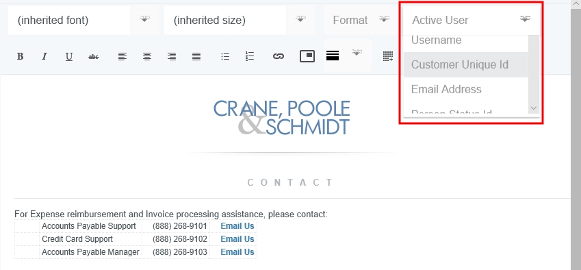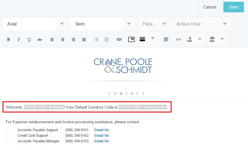 Personnalisez le message du jour de votre entreprise Votre entreprise peut utiliser l’écran Administration du message du jour pour modifier les informations qui s’affichent lorsque les utilisateurs se connectent à Emburse Enterprise. Vous trouverez ci-dessous des instructions détaillées pour personnaliser l’affichage de ces informations. Avant de commencer Seul le fichier appelé « MOTD » s’affichera pour les utilisateurs, de sorte que toutes les modifications que vous souhaitez mettre en œuvre doivent être effectuées dans ce fichier. Cependant, la bonne pratique consiste à utiliser les fonctionnalités Créer et Cloner pour copier et créer de nouveaux fichiers de message du jour dans le but de tester une nouvelle mise en forme, et ce, sans modifier le MOTD existant. Voir Écran d’administration du message du jour pour connaître tous les détails. Vous pouvez modifier les composants du MOTD en suivant les instructions dans le reste de cet article. Ou cliquez sur ce lien pour télécharger un modèle HTML que vous pouvez utiliser comme point de départ de personnalisation : Modèle HTML de Message du jour. Le modèle ressemble à ceci : Logo Si vous avez besoin de modifier le logo de votre entreprise, contactez-nous via le Service d’assistance. Mise en forme du texte Pour modifier les polices de caractère et la taille du texte, utilisez les menus déroulants au haut de l’éditeur. Vous pouvez également utiliser le menu déroulant MISE EN FORME pour appliquer automatiquement une mise en forme présélectionnée à l’aide des styles de paragraphes En-tête 1, En-tête 2 et En-tête 3. La rangée de boutons qui suit vous permet d’appliquer les attributs suivants au texte sélectionné : Gras Italique Souligné Barré Aligné à gauche, au centre, à droite et justifié Liste non ordonnée Liste ordonnée Insérer un hyperlien Insérer le logo de votre entreprise La rangée de boutons inférieure vous permet d’appliquer les attributs suivants au texte sélectionné : Insérer une ligne horizontale ou un séparateur gris Insérer un tableau Afficher le code HTML Choisir la couleur du texte sélectionné Choisir la couleur d’arrière-plan du texte sélectionné Créer et mettre à jour des liens 1. Mettez en surbrillance le texte que vous souhaitez transformer en lien, ou le lien que vous souhaitez mettre à jour, et cliquez sur le bouton LIEN. 2. Saisissez les éléments suivants dans la fenêtre contextuelle : L’adresse courriel ou l’adresse Web à laquelle le lien mènera. Modifiez au besoin le texte qui sera affiché. Ajoutez une infobulle qui apparaîtra lorsque les utilisateurs survoleront le lien avec leur souris. Adresse de courriel Adresse Web Liens rapides Les liens rapides sont des éléments textuels ou iconiques prédéfinis que les utilisateurs peuvent cliquer pour accéder facilement à des informations importantes. Les modèles de liens rapides sont réactifs, ce qui signifie que le contenu est déplacé en fonction de la taille de la fenêtre du navigateur. Cela empêche certains éléments d’être coupés pour les utilisateurs possédant un appareil dont l’écran est étroit. Vous pouvez créer deux types de liens rapides : Navigation : permet de créer un bouton sur lequel les utilisateurs peuvent cliquer pour accéder à une autre section du système, par exemple un guide d’aide ou un téléchargement. Vous pouvez personnaliser l’icône, le titre, la description, l’étiquette de l’URL (par exemple, « Cliquez ici ») et l’URL. Les utilisateurs peuvent cliquer n’importe où dans le texte pour ouvrir l’URL. Contact : permet de créer des coordonnées cliquables, comme le nom, le numéro de téléphone ou l’adresse de courriel. Lorsque vous cliquez sur l’icône ou l’adresse électronique, le client de messagerie s’ouvre automatiquement. Si vous cliquez sur le numéro de téléphone, vous aurez la possibilité de composer le numéro. Une fois que vous choisissez l’option Navigation (navigation) ou Contact (contact) pour le premier lien rapide d’un modèle, tous les liens rapides supplémentaires d’un modèle doivent être du même type. Pour ajouter l’autre type de lien rapide, vous devrez créer un nouveau modèle de liens rapides. 1. Pour ajouter un nouveau contenant de lien rapide, cliquez sur l’icône Lien rapide dans la barre de menu de formatage. Cela crée une nouvelle section où vous pouvez ajouter un type de lien rapide. 2. Pour ajouter un nouveau lien rapide à un contenant de lien rapide existant, cliquez sur AJOUTER DES LIENS RAPIDES depuis l’intérieur du contenant. Remarque : si le modèle comporte déjà des liens rapides, vous ne pourrez ajouter que le même type de liens rapides. Pour ajouter l’autre type de lien rapide, vous devrez créer un nouveau modèle de liens rapides. 3. Choisissez l’orientation désirée du lien rapide. Horizontal : place l’icône à gauche du texte. Le texte sera aligné à gauche. Vertical : centre l’icône au-dessus du texte. Le texte sera centré. Une fois que vous choisissez l’option Horizontal ou Vertical pour le premier lien rapide d’un modèle, tous les liens rapides supplémentaires d’un modèle doivent avoir la même mise en page. Pour ajouter un lien rapide avec une autre mise en page, vous devez créer un nouveau modèle de liens rapides. Personnaliser avec « Utilisateur actif » Le menu déroulant UTILISATEUR ACTIF vous permet d’insérer des champs qui afficheront automatiquement un texte personnalisé pour chaque utilisateur qui consulte le message du jour. Par exemple, chaque utilisateur pourrait voir une salutation personnalisée sur son écran Message du jour, ainsi que le code de devises utilisé par défaut pour les dépenses. Positionnez simplement votre curseur à l’endroit où vous voulez entrer ce type de texte personnalisé, puis sélectionnez-le dans la liste déroulante. Cliquez sur ENREGISTRER pour voir de quelle 