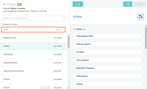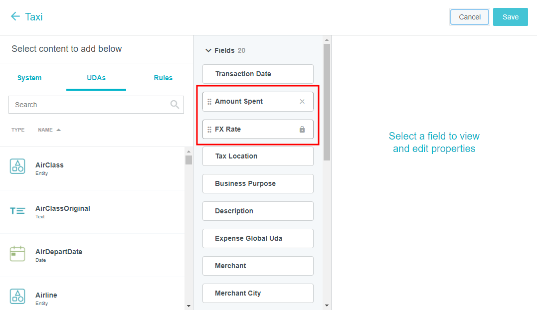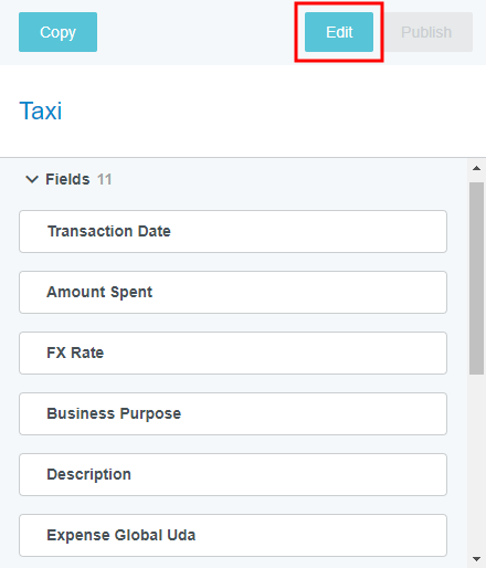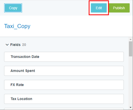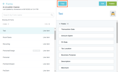 Administration de formulaires L’écran d’administration des formulaires vous permet de personnaliser les formulaires de saisie de données qui recueillent des informations lorsque les utilisateurs créent ou modifient des dépenses et des préapprobations. Un formulaire est ce que les utilisateurs voient lorsqu’ils créent une nouvelle dépense ou une préapprobation, ou lorsqu’ils cliquent sur une tuile dans une mosaïque. Les formulaires collectent des données comme la date et le montant dépensé, mais peuvent également inclure des attributs définis par l’utilisateur, des formules ou des règles d’interface utilisateur, ainsi que des propriétés propres à ceux-ci. il est fortement recommandé de créer et de tester des changements dans l’environnement d’AQ, puis d’utiliser la publication d’environnements croisés pour promouvoir les changements à la production. Consultez « Publication croisée de listes de modifications entre environnements » dans Créer et publier des listes de modifications pour obtenir des renseignements détaillés. Types de formulaires Formulaires de lignes d’éléments Ces formulaires sont associés à une tuile dans une mosaïque. Votre organisation peut utiliser le même formulaire de lignes d’éléments pour plusieurs dépenses différentes ou personnaliser des formulaires pour certains types de dépenses. Par exemple, vous pouvez avoir un formulaire Repas qui est associé à trois tuiles dans une mosaïque : déjeuner, dîner et Repas – Autre. De ce fait, les modifications apportées à un formulaire peuvent affecter plusieurs tuiles. Dans une prochaine version, nous indiquerons visuellement quelles tuiles seront touchées par les modifications apportées à chaque formulaire. En attendant, un clic sur une tuile individuelle dans l’administration des mosaïques et des tuiles affichera le nom du formulaire associé à cette tuile. Formulaires communs Communs à toutes les dépenses, préapprobations, factures et bons de commande, ces formulaires ne sont pas associés au niveau de la tuile. Voici quelques exemples : Attributs définis par l’utilisateur globales Dépenses : Ajoute des champs de données définies par l’utilisateur qui s’afficheront sur chaque formulaire de ligne d’élément ayant le champ de système Attributs définis par l’utilisateur des dépenses globales. Par exemple, votre organisation pourrait créer un attribut défini par l’utilisateur global « Fournisseur » qui capture les informations sur le fournisseur pour chaque ligne ajoutée par les utilisateurs. Attributs définis par l’utilisateur Dépenses par jour : Ajoute des champs de données définies par l’utilisateur à tous les formulaires de lignes par jour. Par exemple, votre organisation pourrait ajouter un champ « Ville du fournisseur » pour capturer l’emplacement sur chaque ligne d’élément par jour. Si votre organisation utilise cette fonction pour de tels types de dépenses détaillées, comme Hôtel et Location de voitures, vous pouvez personnaliser les formulaires Hébergement récurrent et Hébergement non récurrent qui permettent aux utilisateurs de saisir facilement les dépenses qui se reproduisent sur plusieurs jours pendant un voyage, comme les frais quotidiens pour le Wi-Fi ou la taxe d’hébergement. Voir les formulaires 1. Cliquez sur PARAMÈTRES D’ADMINISTRATEUR > INTERFACE UTILISATEUR > FORMULAIRES. 2. Sélectionnez le jeu de modifications que vous souhaitez utiliser. Si un jeu de modifications n’existe pas, vous pouvez sélectionner la production en temps réel (ou AQ) et cliquer sur VOIR. seuls les formulaires communs et les formulaires de dépenses et de préapprobation sont disponibles pour le moment. Les formulaires de factures et de bons de commande seront disponibles dans une prochaine version. 3. Vous verrez une liste de tous les formulaires définis pour votre organisation. Utilisez l’en-tête des Formulaires pour les trier par nom. Utilisez l’en-tête Type pour les trier par type (commun ou ligne d’élément). Cliquez sur un formulaire pour afficher ses champs et leur ordre. Les champs sur les formulaires de votre organisation peuvent différer de ceux décrits ici. Modifier les formulaires 1. Sélectionnez le formulaire souhaité et cliquez sur MODIFIER dans le coin supérieur droit. 2. Si vous n’êtes pas dans un jeu de modifications, vous serez invité à sélectionner un jeu de modifications ou à en créer un nouveau. Une liste de modifications n’est qu’un moyen d’apporter des modifications à l’interface utilisateur qui peuvent être suivies et facilement interchangées, si nécessaire. Vous pouvez sélectionner une liste de modifications existante (p. ex., une liste que vous avez déjà créée et contenant des modifications associées que vous souhaitez apporter) ou en créer une autre. Voir Créer et publier des listes de modifications pour plus de détails. 3. Sur la gauche, vous verrez trois onglets contenant des champs et des règles que vous pouvez ajouter au formulaire. C’est également là que ces éléments réapparaîtront si vous les retirez du formulaire. Système : champs standards, appelés panneaux. La plupart des panneaux ne peuvent apparaître qu’une seule fois sur un formulaire. L’espaceur, la ligne d’espacement et le texte/l’étiquette sont les seuls panneaux qui peuvent apparaître plusieurs fois sur un formulaire. ADU : champs personnalisés; voir Administration des attributs définis par l’utilisateur pour plus de détails. Chaque ADU ne peut apparaître qu’une seule fois sur un formulaire. Règles : règles d’interface utilisateur définies par votre organisation. Chaque règle ne peut apparaître qu’une seule fois sur un formulaire. Pour ajouter un panneau, un ADU ou une règle au formulaire, survolez dessus avec le curseur et cliquez sur le signe « + » bleu qui apparaît. 4. Sur la droite, vous verrez une liste de tous les
