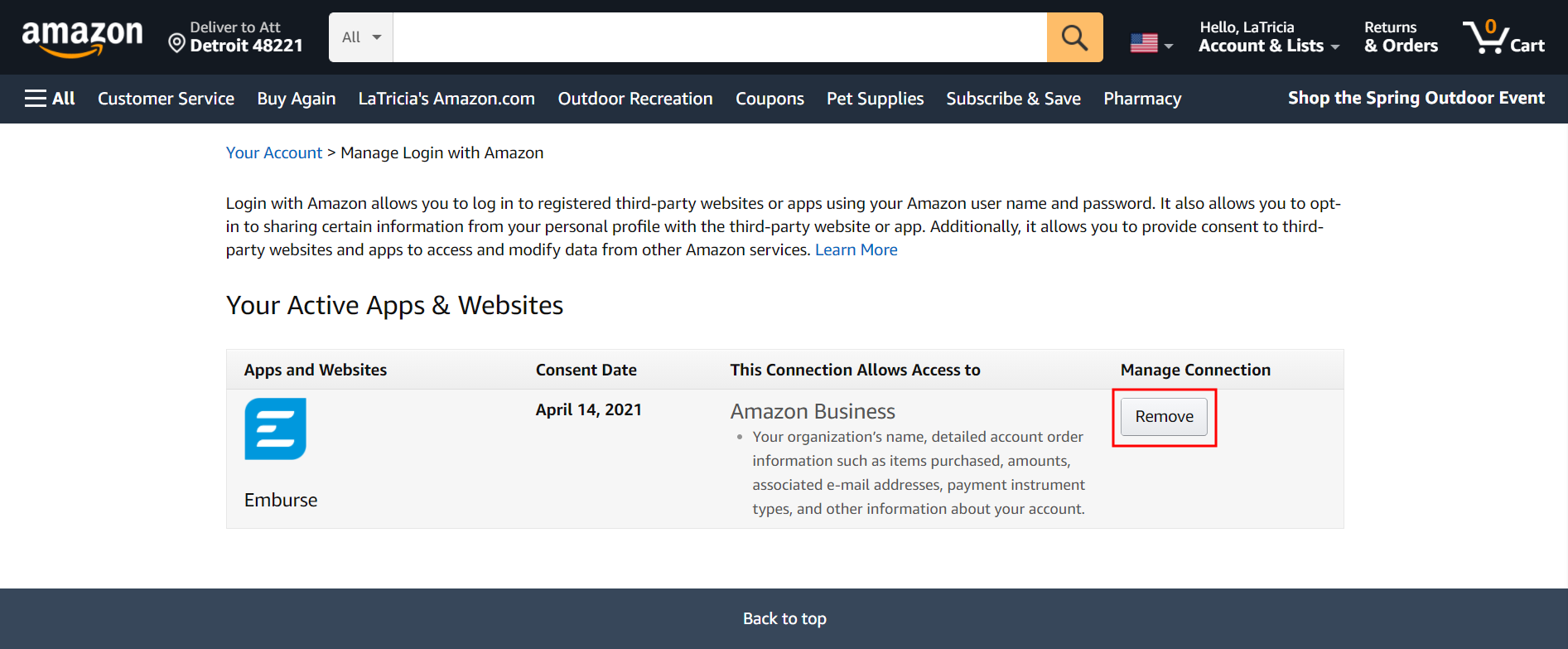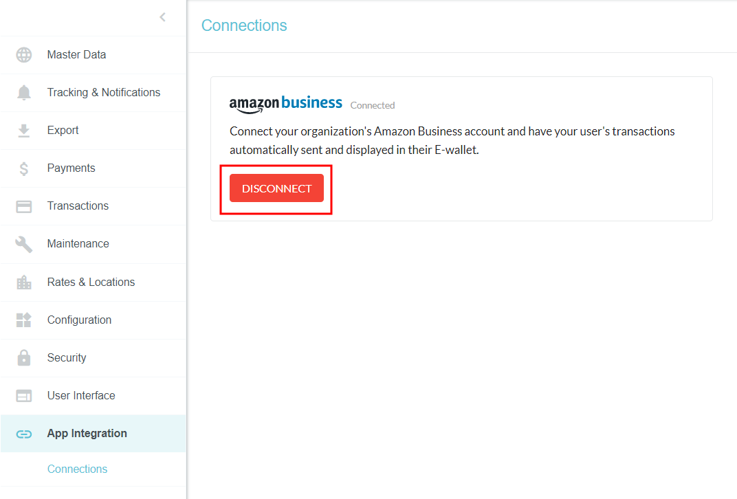 Importation automatique des achats Amazon avec le connecteur Amazon Business Le connecteur Amazon Business d'Emburse Enterprise importe automatiquement les achats Amazon Business dans Emburse Expense Enterprise. Si votre entreprise tire parti de cette intégration, un reçu sera automatiquement généré et joint à chaque transaction Amazon Business dans Emburse Enterprise, ce qui permettra aux utilisateurs de l’ajouter facilement aux notes de frais. Pour obtenir de plus amples renseignements, consultez Transactions Amazon Business. Connecter un compte Amazon Business Veuillez noter que vous devez être un administrateur de compte Amazon Business pour connecter Amazon Business à Emburse Enterprise. 1. Cliquez sur PARAMÈTRES ADMINISTRATEUR > INTÉGRATION DE L’APP > CONNEXIONS. 2. Cliquez sur le bouton bleu de CONNEXION dans la zone Amazon Business. 3. Utilisez vos identifiants d’administrateur de compte Amazon Business pour vous connecter à Amazon. 4. Vous devrez autoriser Emburse, la société mère d’Emburse Enterprise, à accéder à votre compte Amazon Business. Cliquez sur AUTORISER. 5. Vous serez redirigé vers l’application Emburse Enterprise. Si la connexion a réussi, vous verrez « Connecté » à côté du logo Amazon Business sur l’écran d’administration des connexions. Déconnecter un compte Amazon Business 1. Cliquez sur PARAMÈTRES ADMINISTRATEUR > INTÉGRATION DE L’APP > CONNEXIONS. 2. Cliquez sur le bouton rouge de DÉCONNEXION dans la zone Amazon Business. 3. La fenêtre contextuelle affichera des instructions pour terminer la déconnexion au sein d’Amazon Business. Cliquez sur DÉCONNEXION COMPLÈTE. 4. Sur la page d’accueil d’Amazon, sous votre nom, cliquez sur le menu déroulant et sélectionnez VOTRE COMPTE. 5. Faites défiler vers le bas et cliquez sur CONNEXION AVEC AMAZON sous Autres programmes. 6. Trouvez Emburse sous Vos applications & sites Web actifs et cliquez sur ENLEVER. 7. Emburse ne sera plus affiché sur l’écran Gérer la connexion avec Amazon. Cet article vous a-t-il été utile ? Oui Non