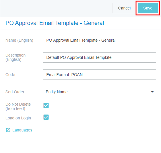 Afficher les images dans les courriels d’approbation de bon de commande Les clients d'Emburse Enterprise PURCHASE ORDER qui choisissent les courriels d’approbation de bons de commande dans le format HTML ont le choix de fournir un lien « Afficher les images » sous les boutons ACCEPTER et RETOURNER dans chaque message. Cela permet aux approbateurs de visualiser les images associées à un bon de commande par le biais du courriel d’approbation au lieu de les obliger à se connecter à Emburse Enterprise PURCHASE ORDER en ligne, ce qui simplifie davantage le processus d’approbation. Notez que pour recevoir des e-mails contenant ce lien, l’utilisateur doit choisir le format HTML dans ses préférences en matière d’e-mails dans l’écran Écran d’administration du personnel. 1. Cliquez sur PARAMÈTRES ADMINISTRATEUR > DONNÉES DE RÉFÉRENCE > ENTITÉS. 2. Utilisez la boîte de recherche pour vérifier si le type d’entité « Modèle de courriel d’approbation de bon de commande – Général » (Code : EmailFormat_POAN) requis existe déjà pour votre organisation. Si c’est le cas, passez à l’étape 5. Sinon, passez à l’étape 3. 3. Cliquez sur le bouton bleu + à droite de « Types d’entités » et saisissez ce qui suit : Nom : modèle de courriel d’approbation de bon de commande – Général Description : modèle de courriel d’approbation de bon de commande par défaut Code : EmailFormat_POAN Ordre de tri : Utilisez le menu déroulant Ordre de tri pour modifier l’ordre dans lequel ce type d’entité figurera dans la liste. Vous pouvez trier par nom d’entité, code d’entité ou ordre de tri. 4. Cochez Ne pas SUPPRIMER (du flux), laissez les autres champs vides et cliquez sur ENREGISTRER. Pour de plus amples renseignements sur l’option Langues, voir Ajouter et modifier les langues de type d'entité. 5. Dans la grille Entités dans la moitié inférieure de l’écran, cliquez sur le bouton bleu +. 6. Ajoutez l’entité suivante : Nom : Inclure le lien d’image Code : IncludeImageLink Extra Data 1 : Saisissez le nombre de jours pendant lesquels le lien pour les images doit être actif. Les valeurs valides (en jours) sont 1 à 7 (toute valeur dans cette fourchette) 14 30 60 90 180 7. Cochez Ne pas SUPPRIMER (du flux), laissez les autres champs vides et cliquez sur ENREGISTRER. Le lien « Afficher les images » apparaîtra maintenant sous les boutons ACCEPTER et RENVOYER sur chaque courriel d’approbation de bon de commande HTML. Une fois le nombre spécifié de jours écoulés depuis l’envoi du courriel, l’approbateur ne sera plus en mesure de visualiser les images. Cet article vous a-t-il été utile ? Oui Non